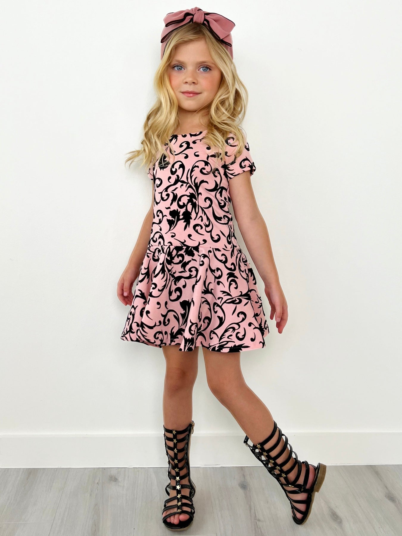 This pretty pink velvet borcade vine dress is perfect for casual occasions. Whether she's showing off her confidence in class or hanging out with other besties, she'll love the flowy fit and fabulous fabric.