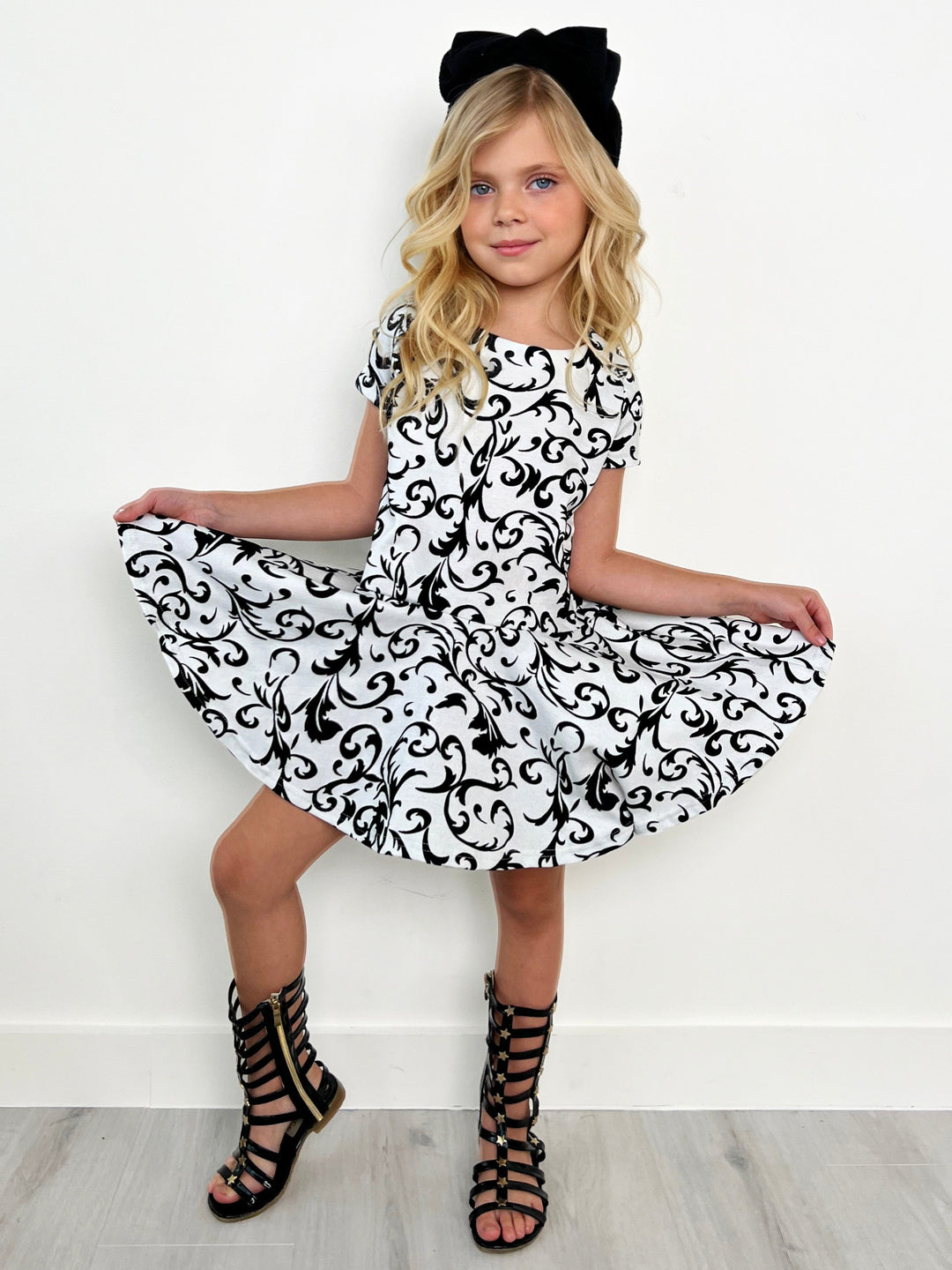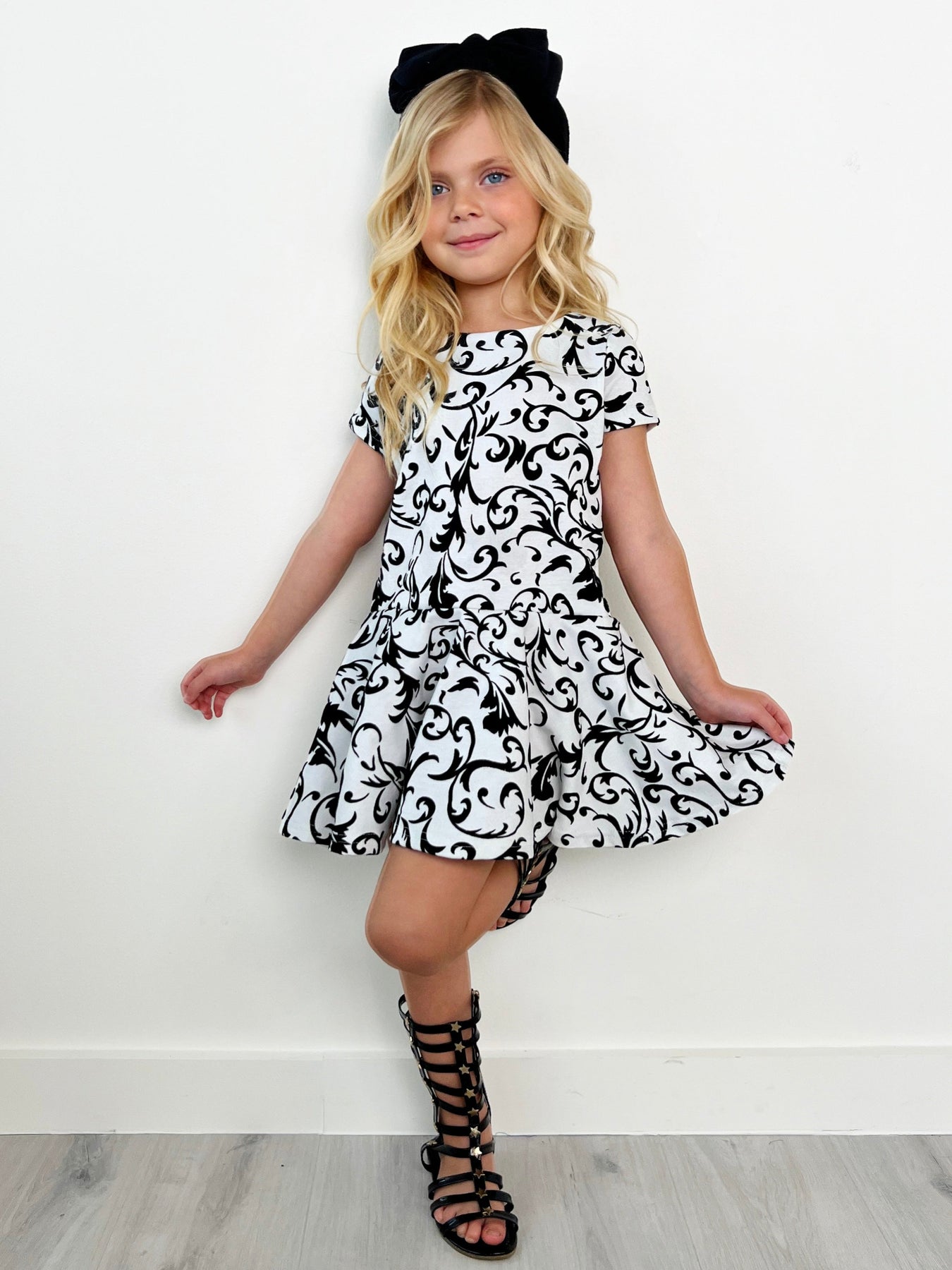 We know she'll look her best in our white dress covered in black velvet brocade vine embossing. Whether she's showing off her confidence in class or hanging out with other besties, she'll love the flowy fit and fabulous fabric.