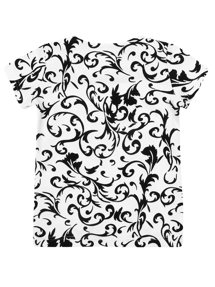 - White t-shirt with black velvet brocade vine design embossing