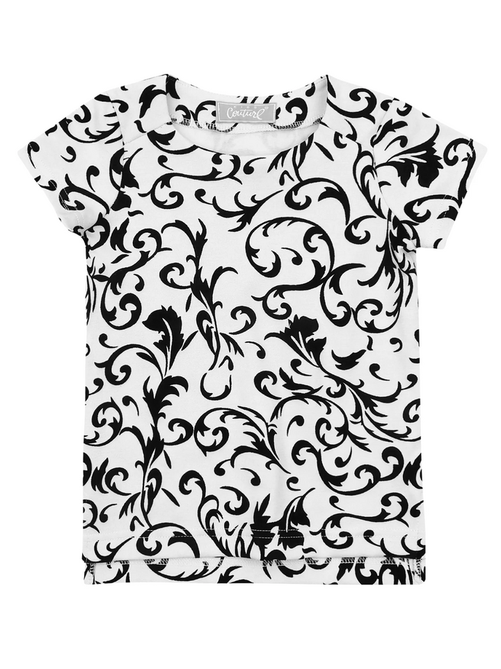 - This top features a whimsical black velvet brocade design on a crisp white background, perfect for adding a dash of fun to any outfit. An easy and effortless way to elevate her everyday wardrobe.