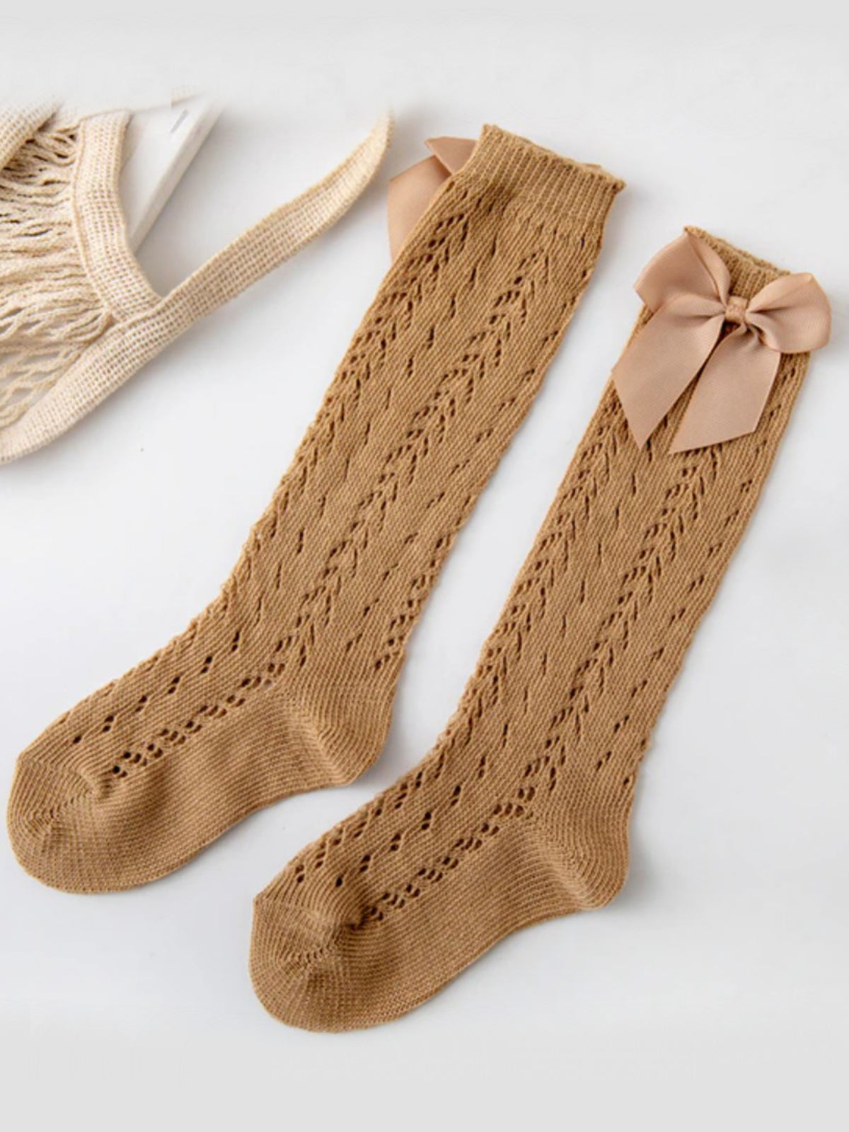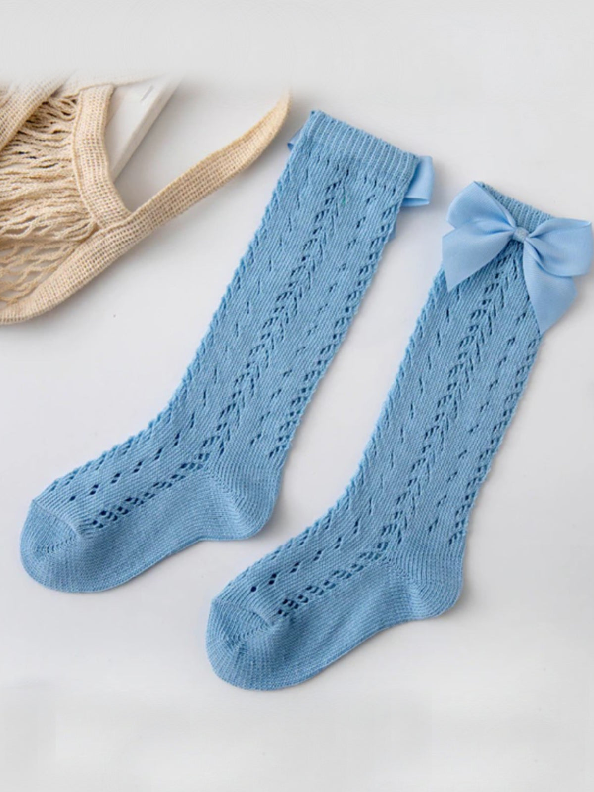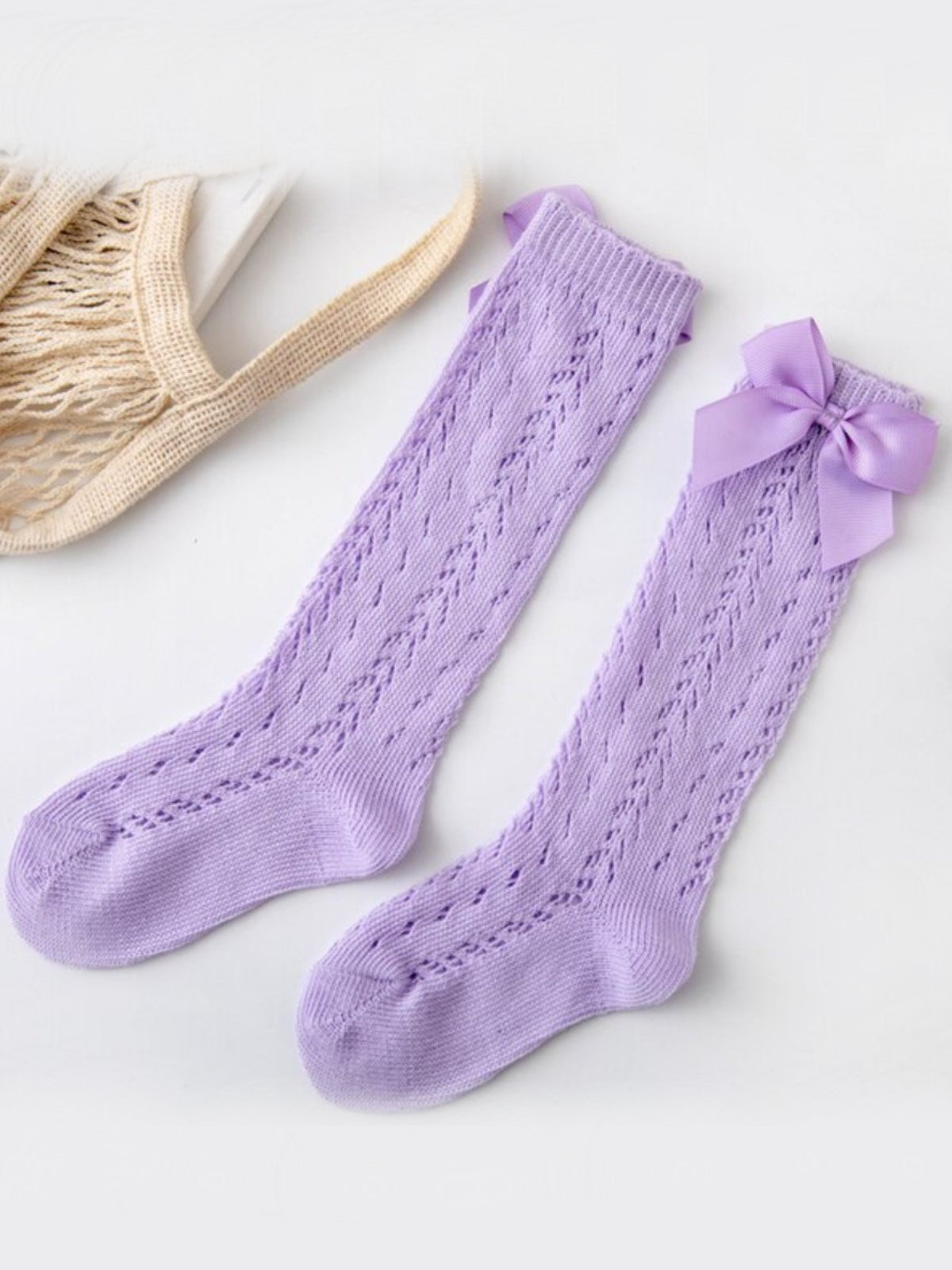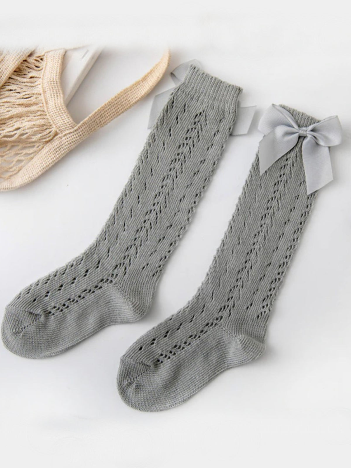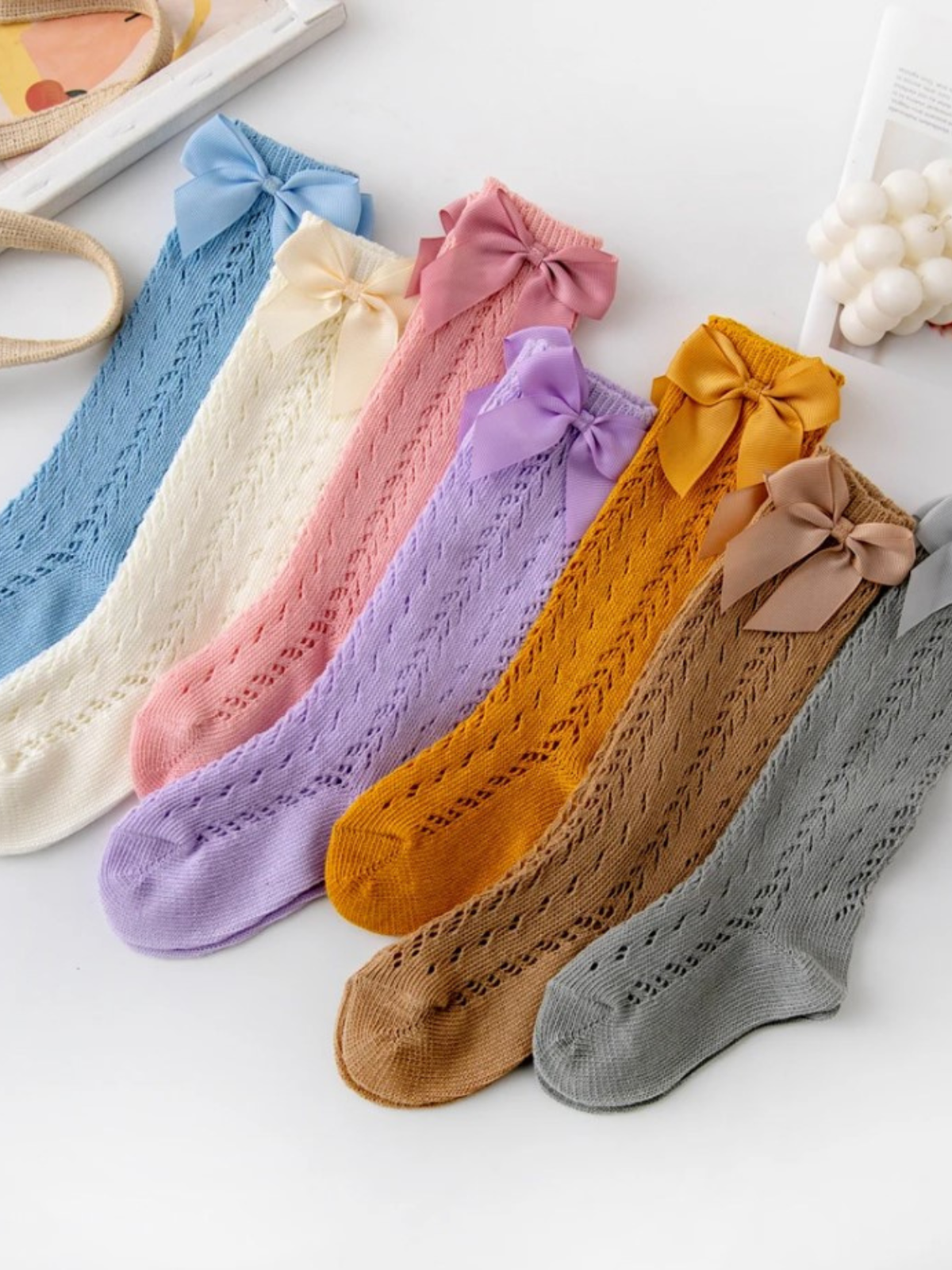 Cute accessory alert! These eyelet knit knee-high socks are sure to cheer her up and keep her feet warm too. Its classic eyelet knit design is topped with fancy silky bows for extra charm. Grab this must-have item in every pair for more style options!