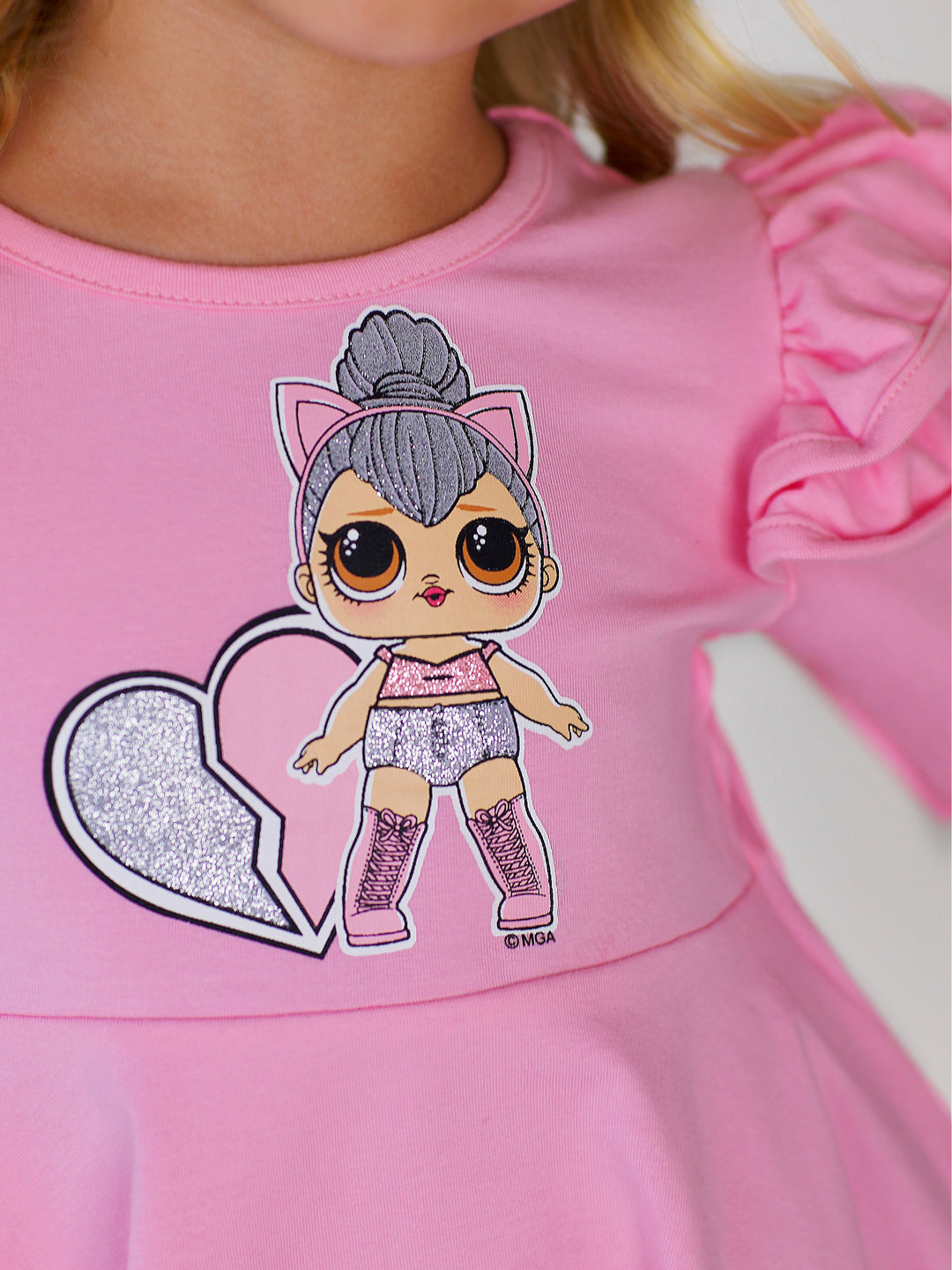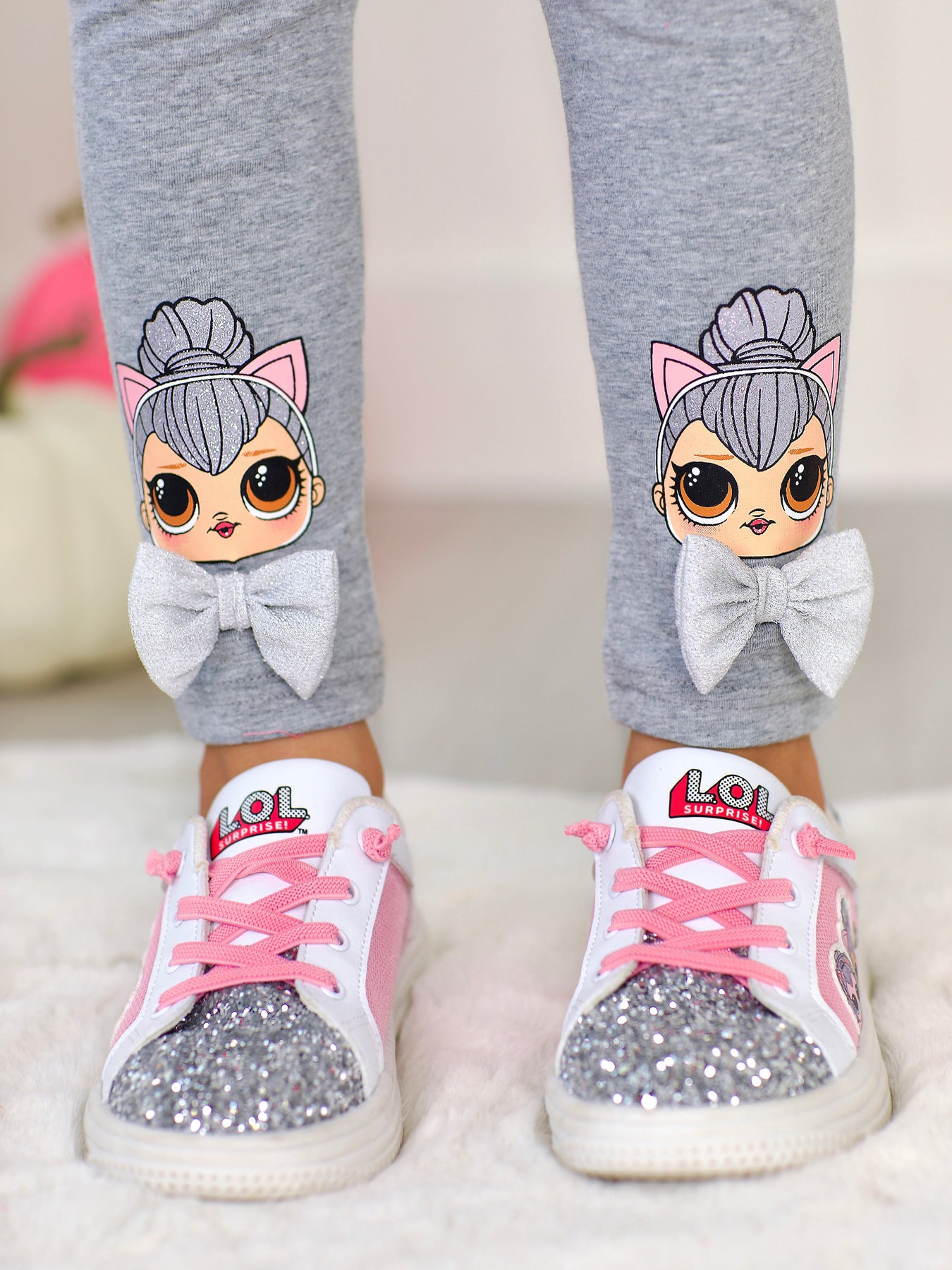 - Bubblegum pink aline top with ruffle sleeve top with L.O.L. SURPRISE!™ Kitty Queen character embroidery, and gray stretch leggings with bows