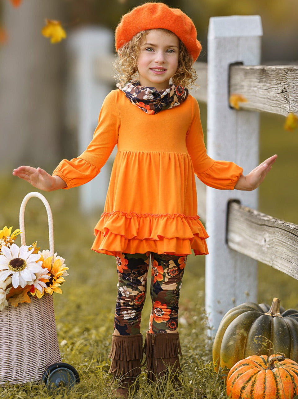 Our orange floral camo print three-piece legging set is perfect for Fall! The flowy ruffle tunic, matching leggings and scarf, and festive design make getting dressed easy and looking cute effortless.