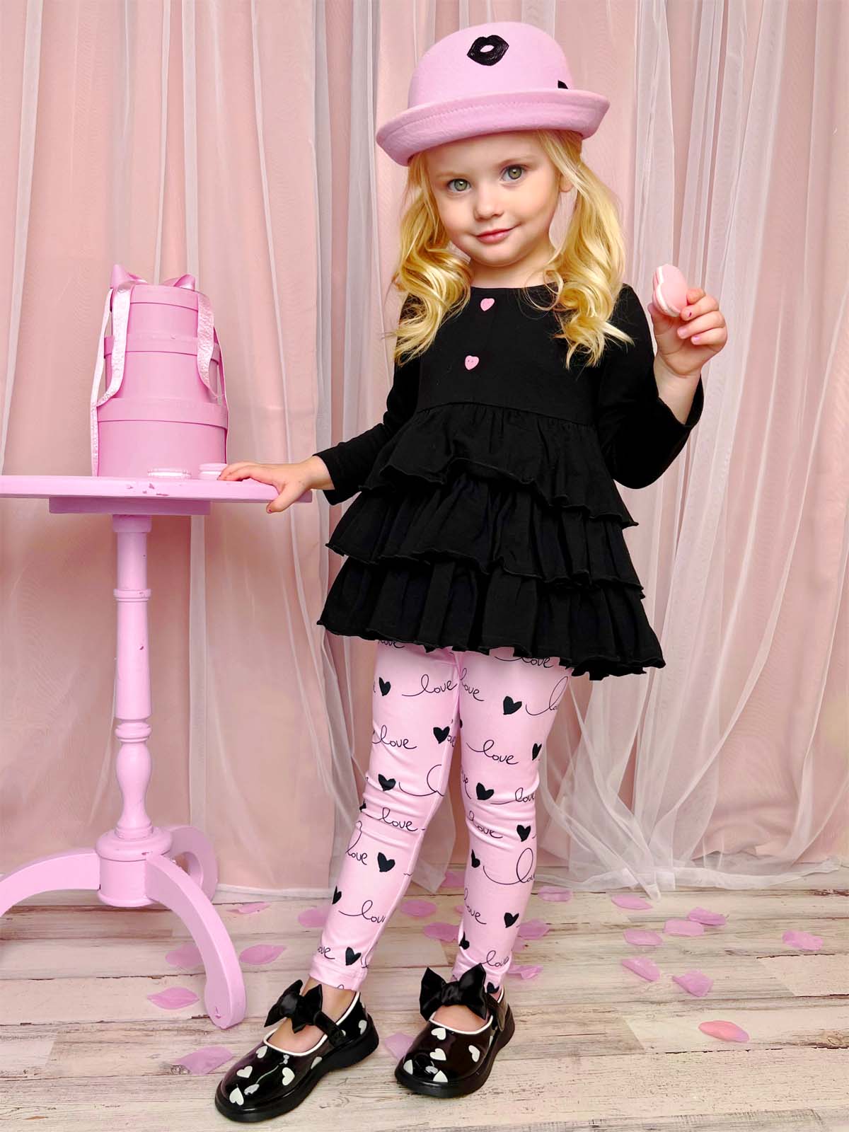 - Make her Valentine’s Day sweeter with the most adorable tiered long-sleeve tunic and heart print leggings. With cute heart accents and a flattering black-and-pink color mix, your little girl will be looking extra charming in this pretty set.