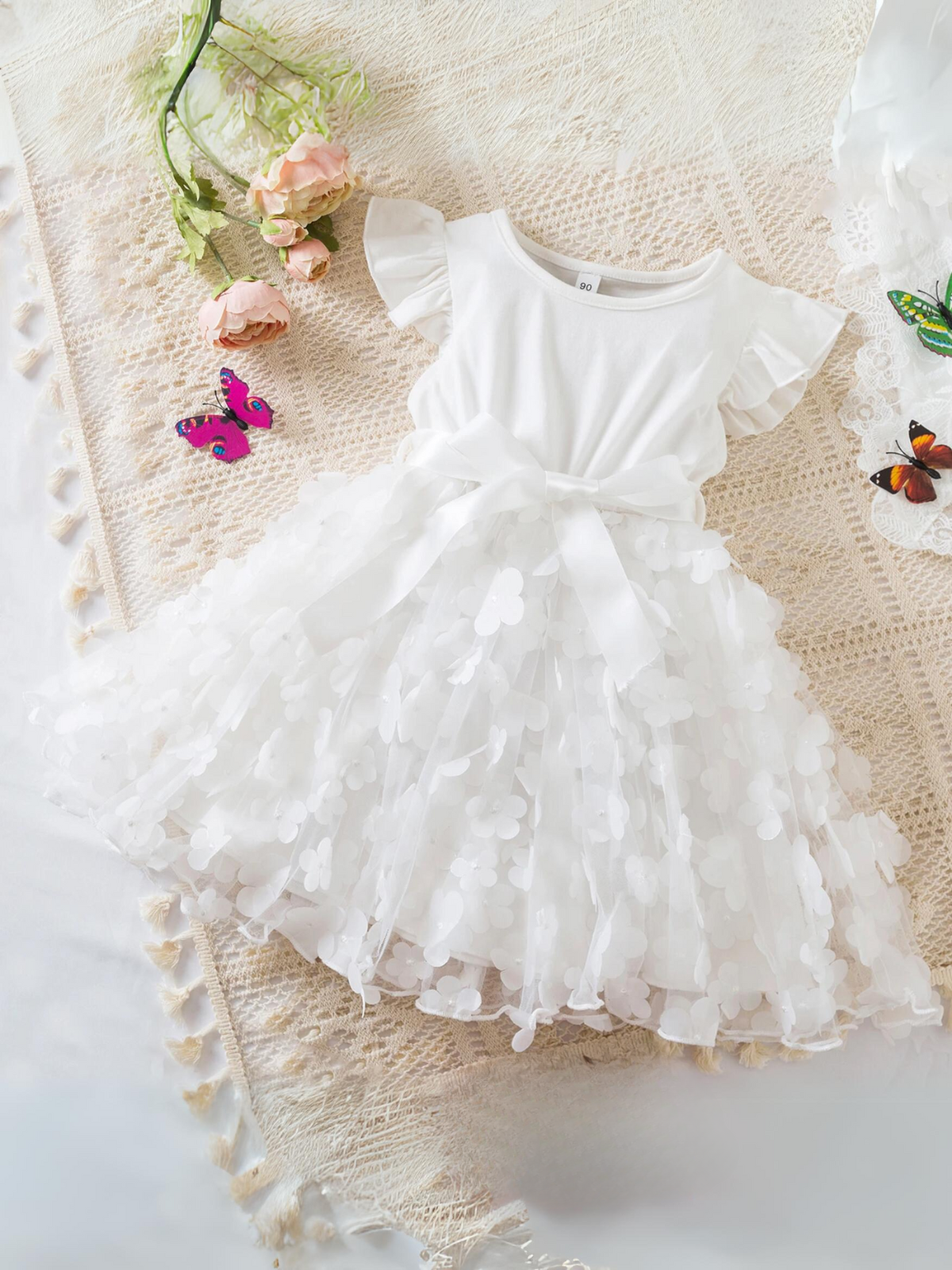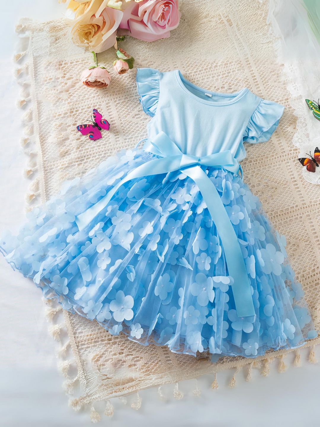 - With blooms that make her twirls come alive, this 3D flower layered dress transforms her days into magical moments. Ruffle sleeves and a pretty bow accent add a lovely touch to the look. She'll look and feel like a princess!
