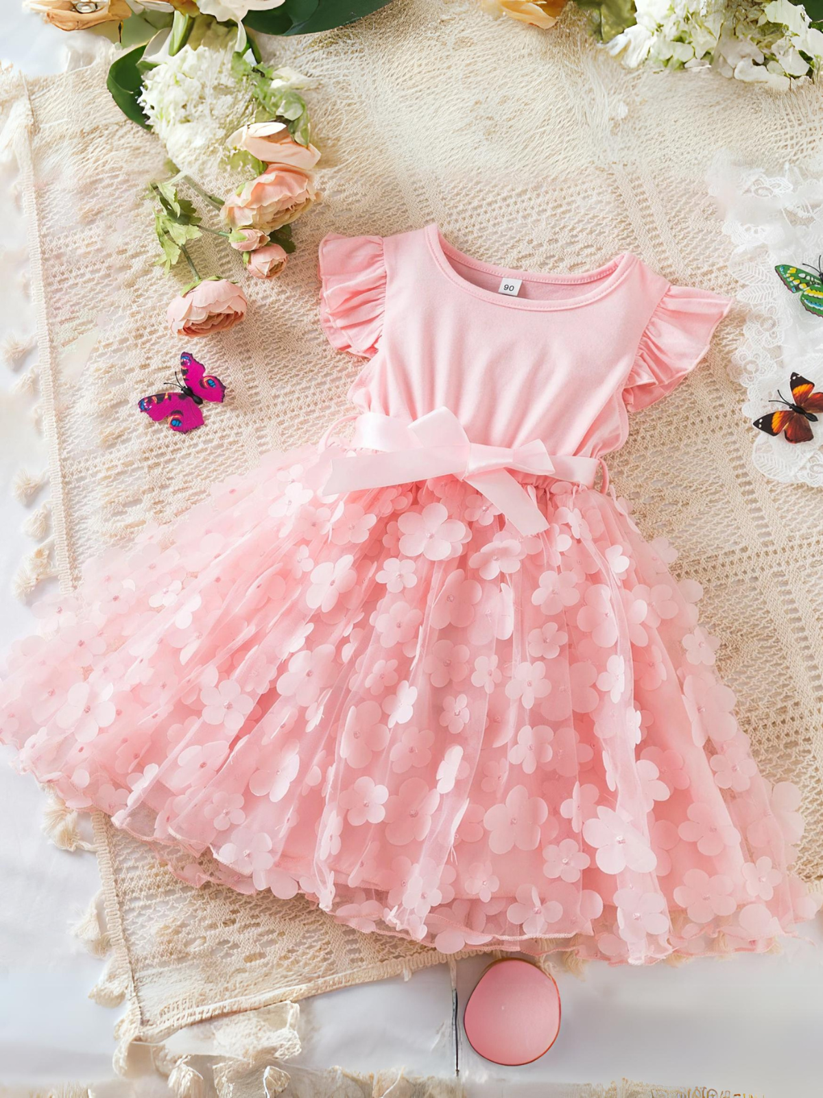 - Floral layered tutu dress with ruffle sleeves, bow waist accent, and 3D flower appliqués