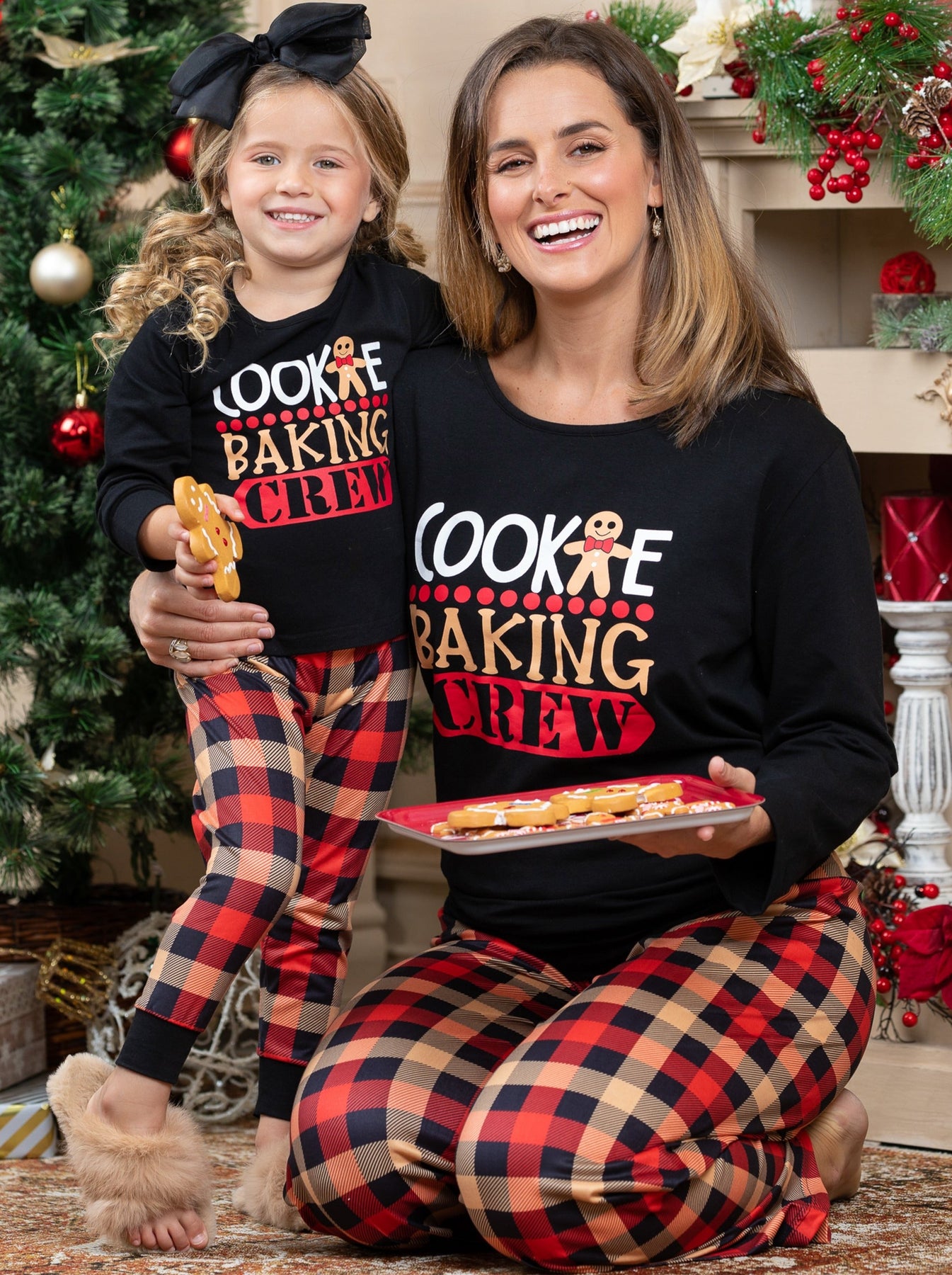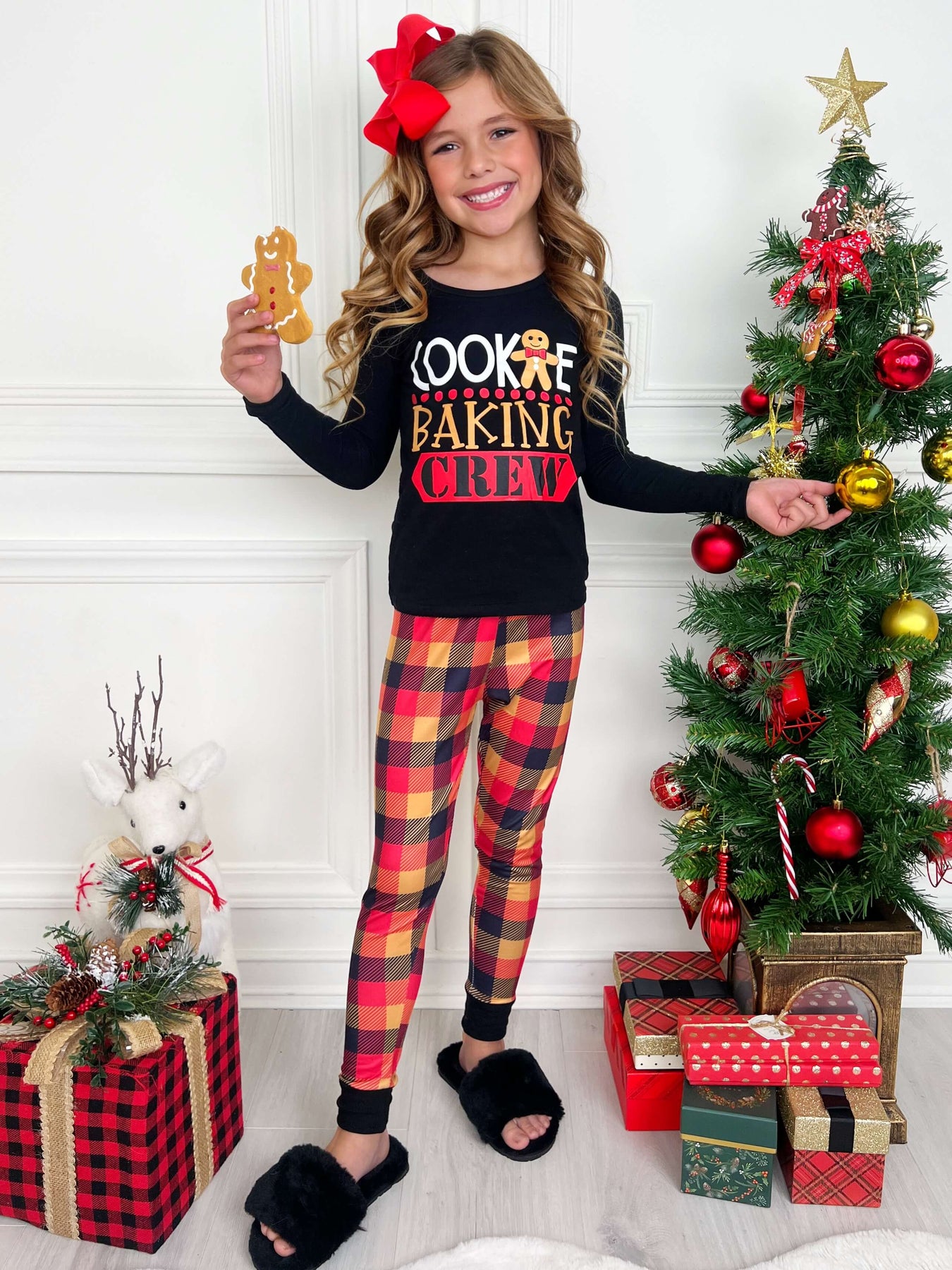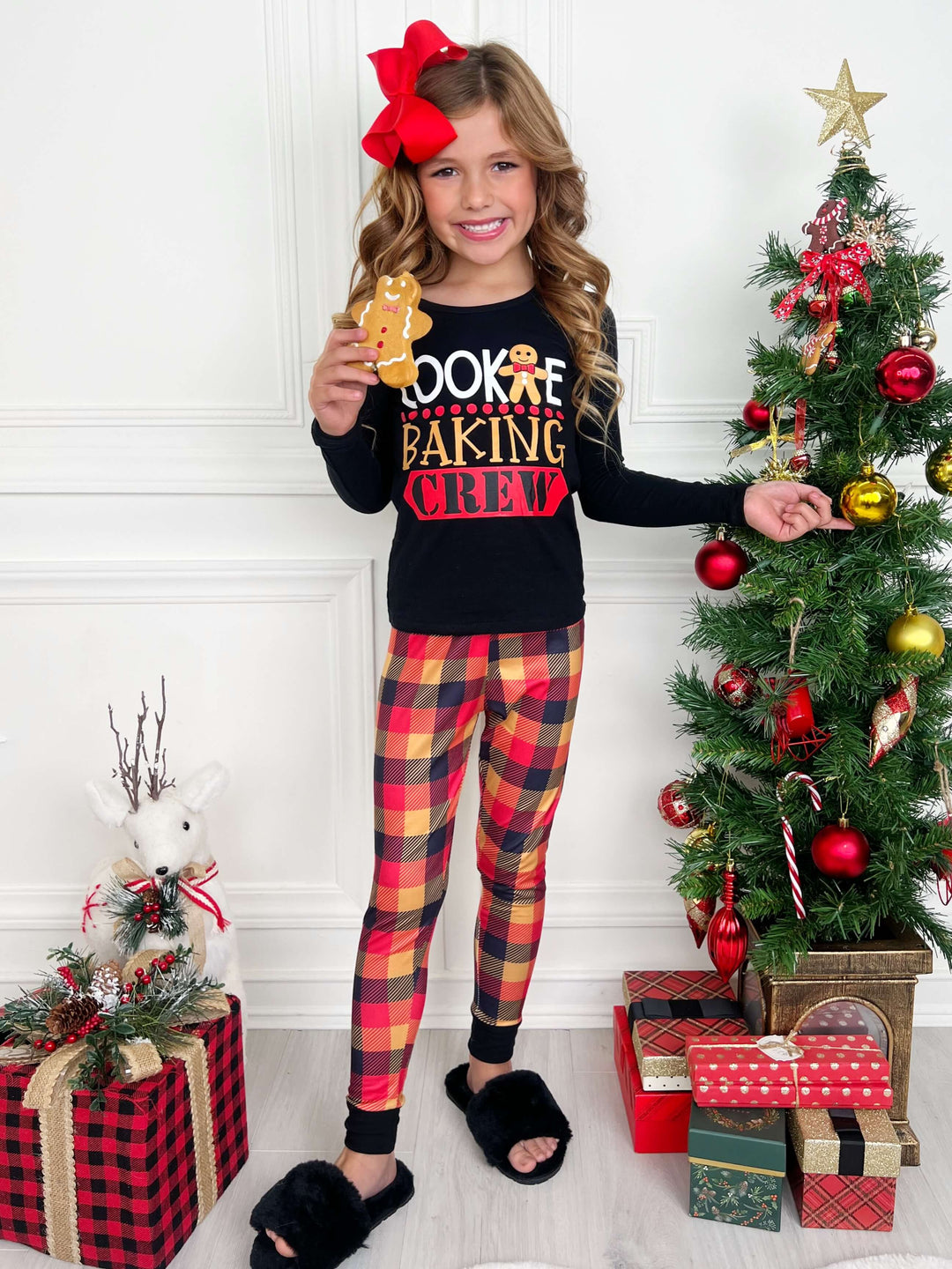 - Black "Cookie Baking Crew" pajama top and red/orange/black plaid pajama pants set