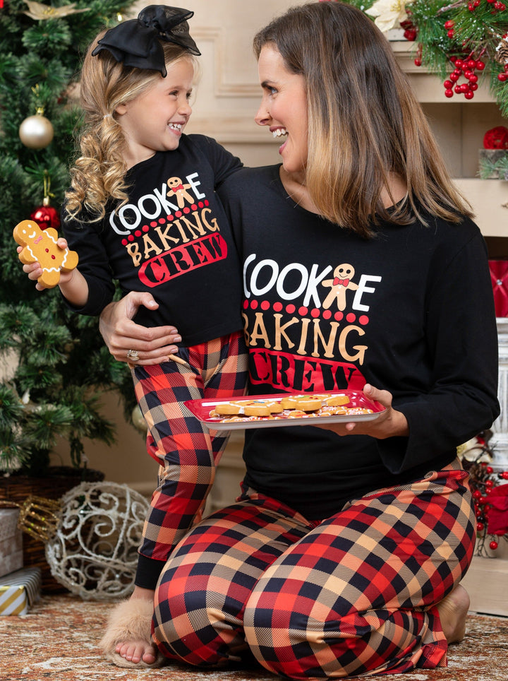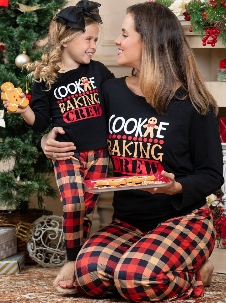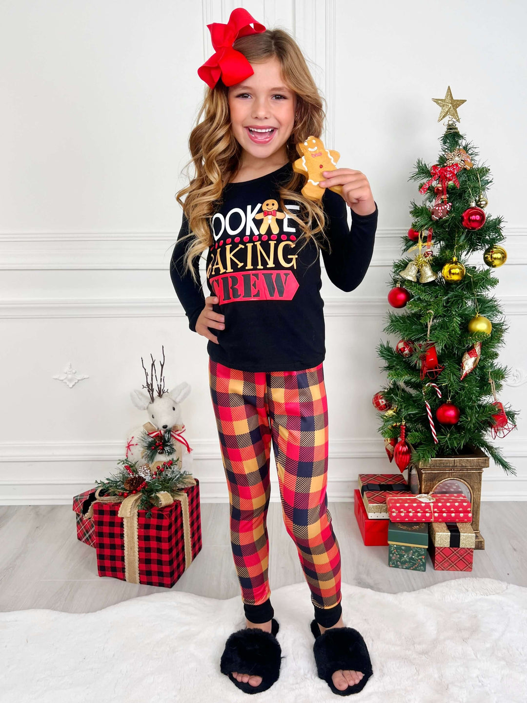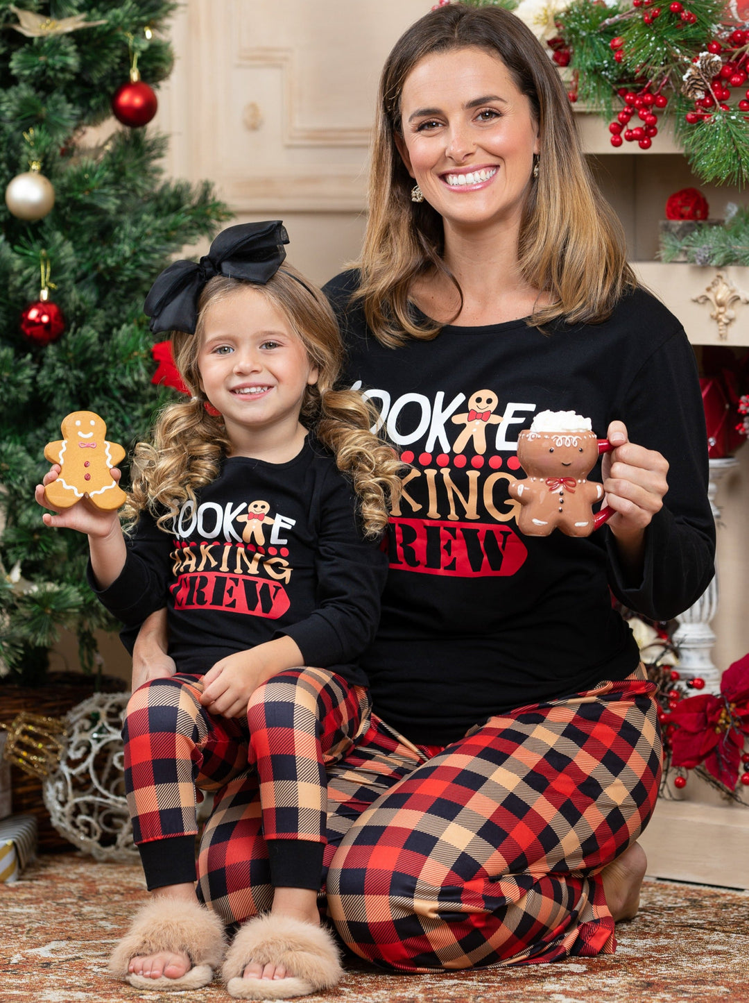 - Black "Cookie Baking Crew" pajama top and red/orange/black plaid pajama pants set