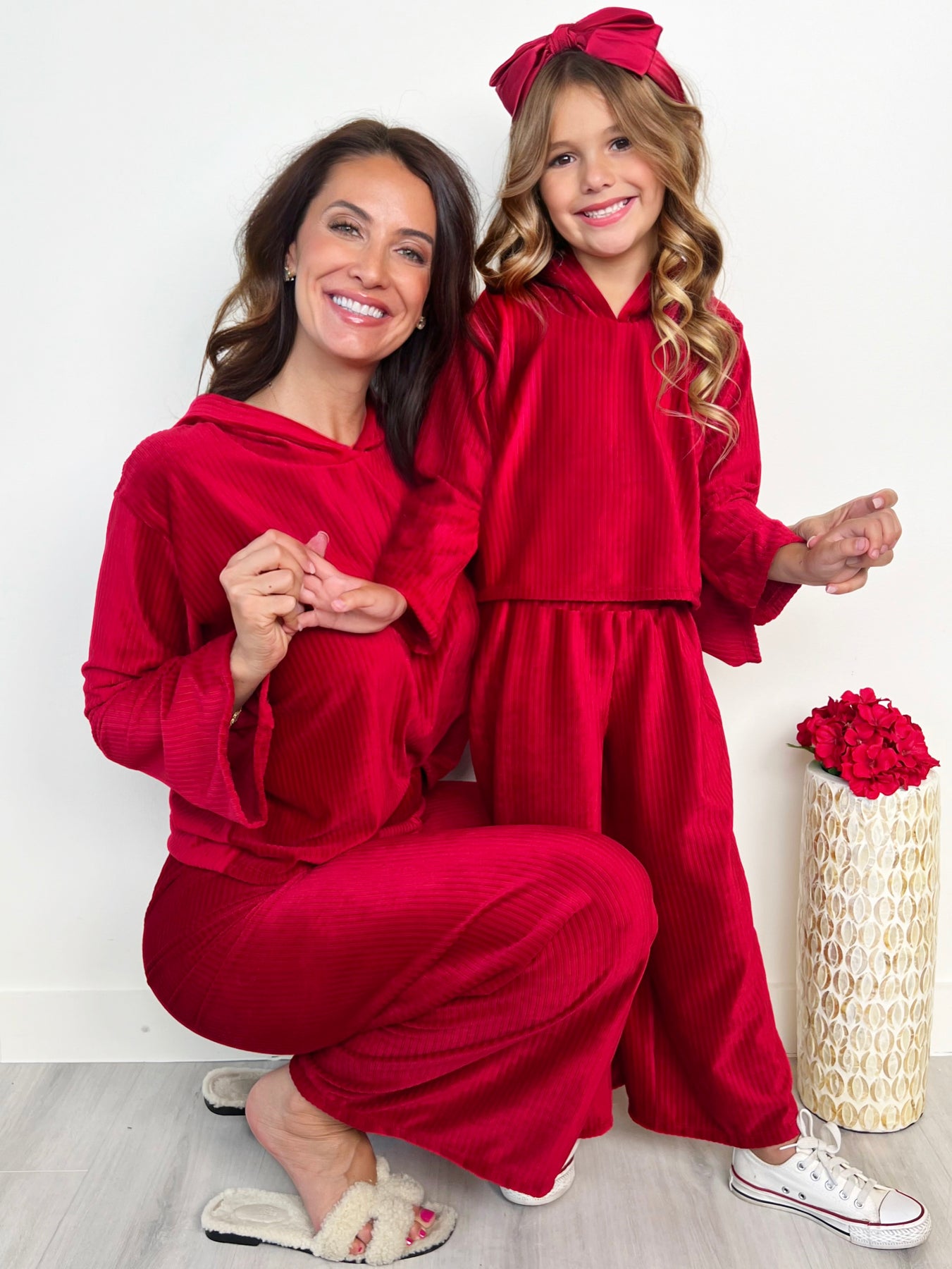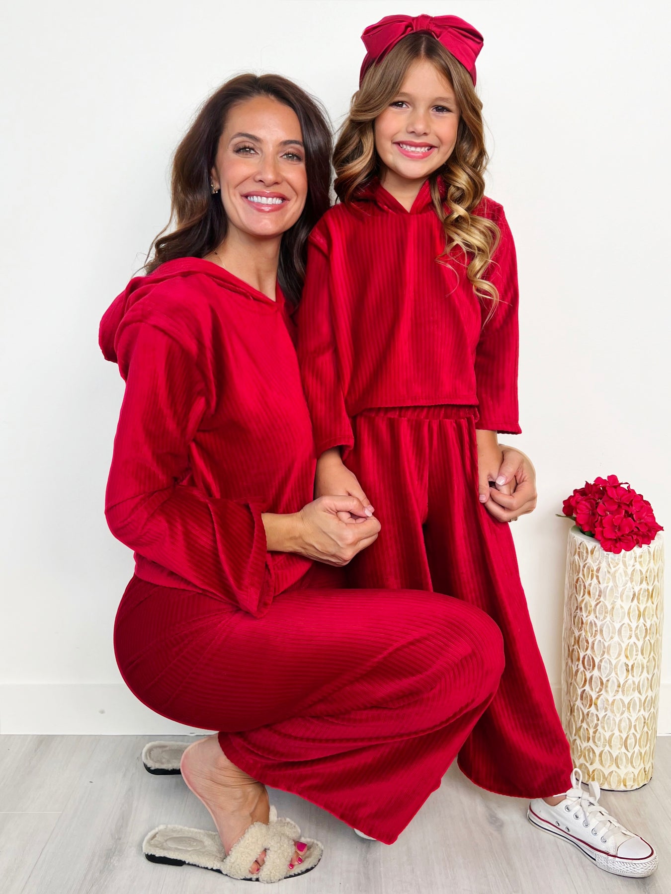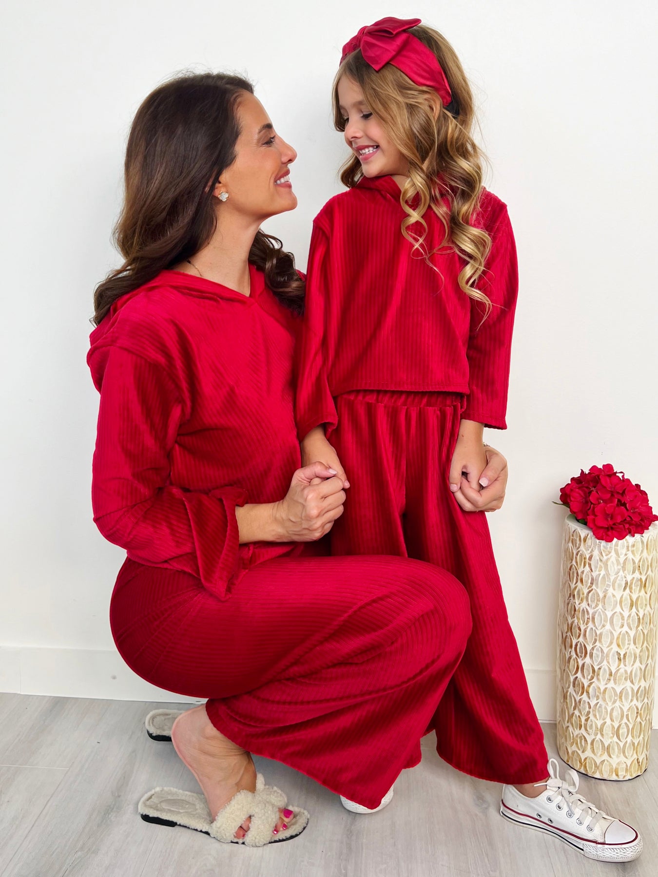 Mommy and Me Cozy Luxe Red Velvet Hooded Pant Set