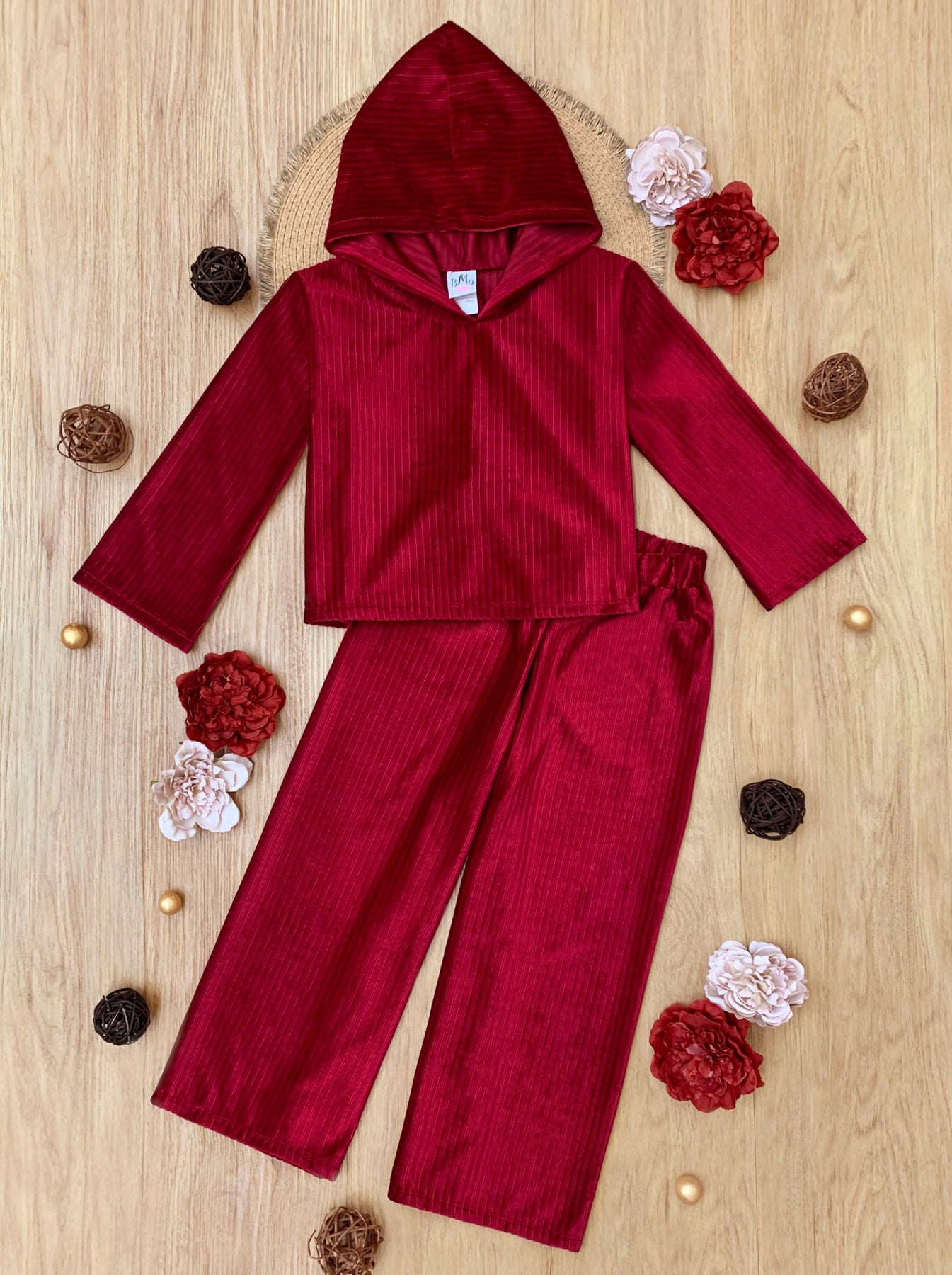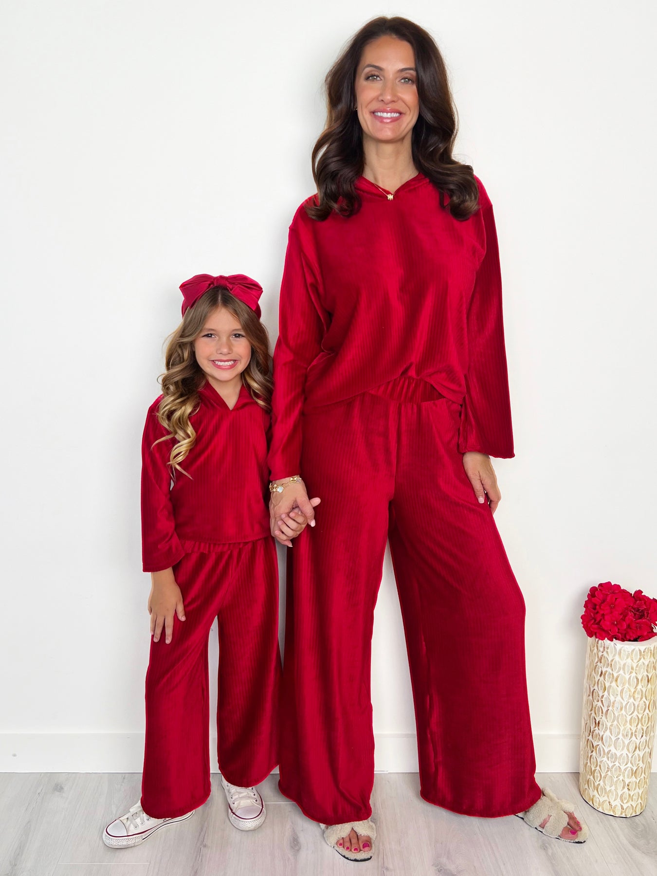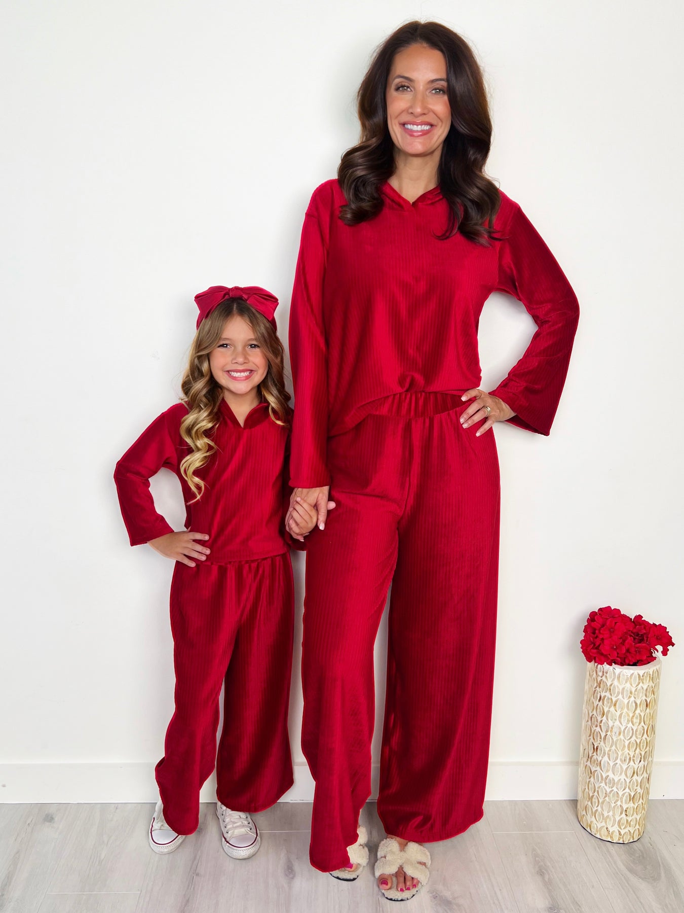 Mommy and Me Cozy Luxe Red Velvet Hooded Pant Set