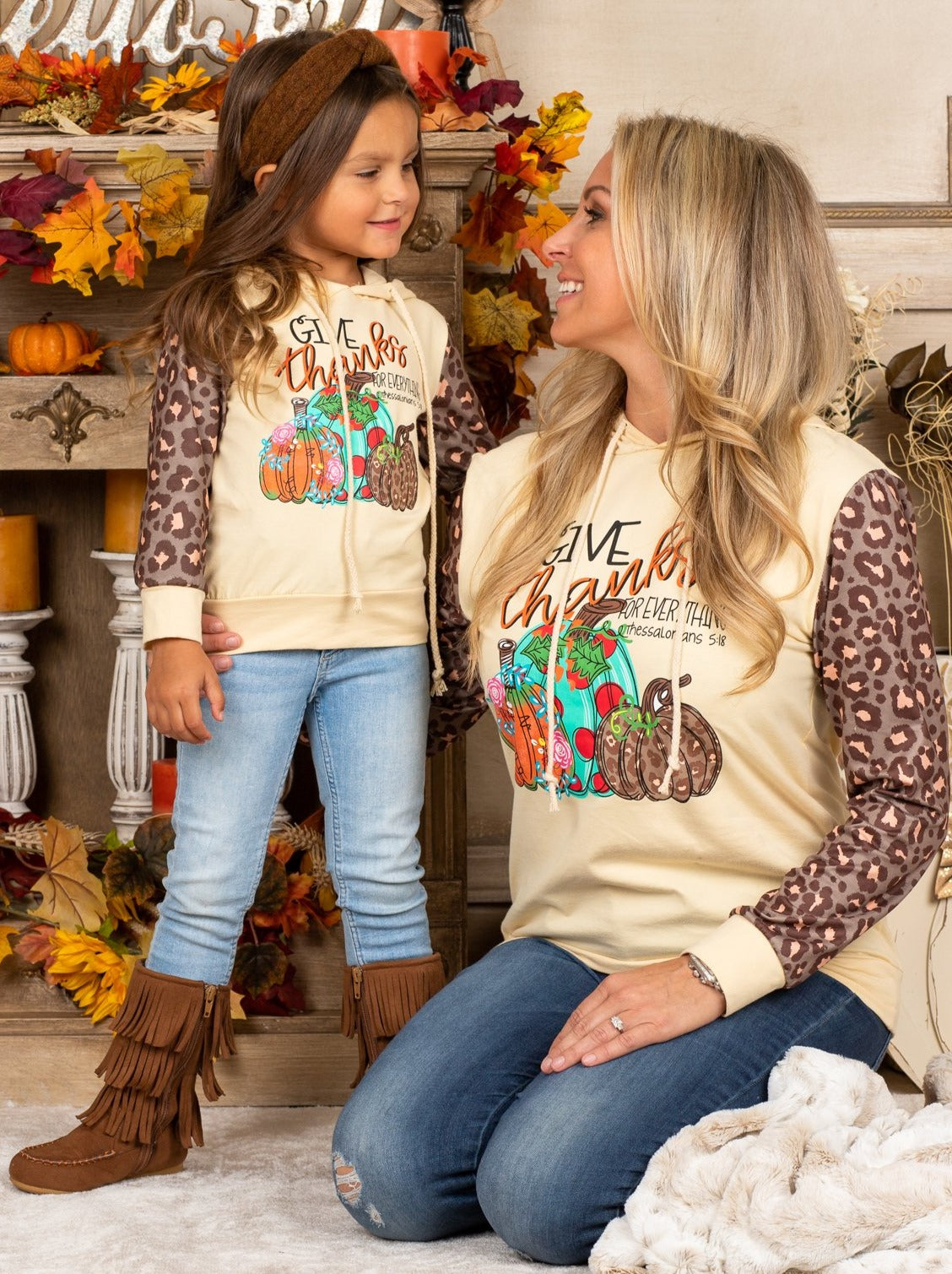 Mommy and Me Give Thanks Leopard Sleeve Hoodie