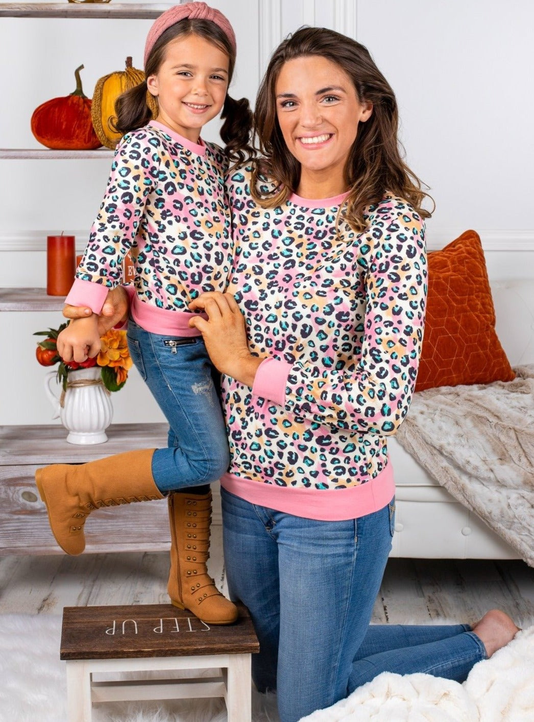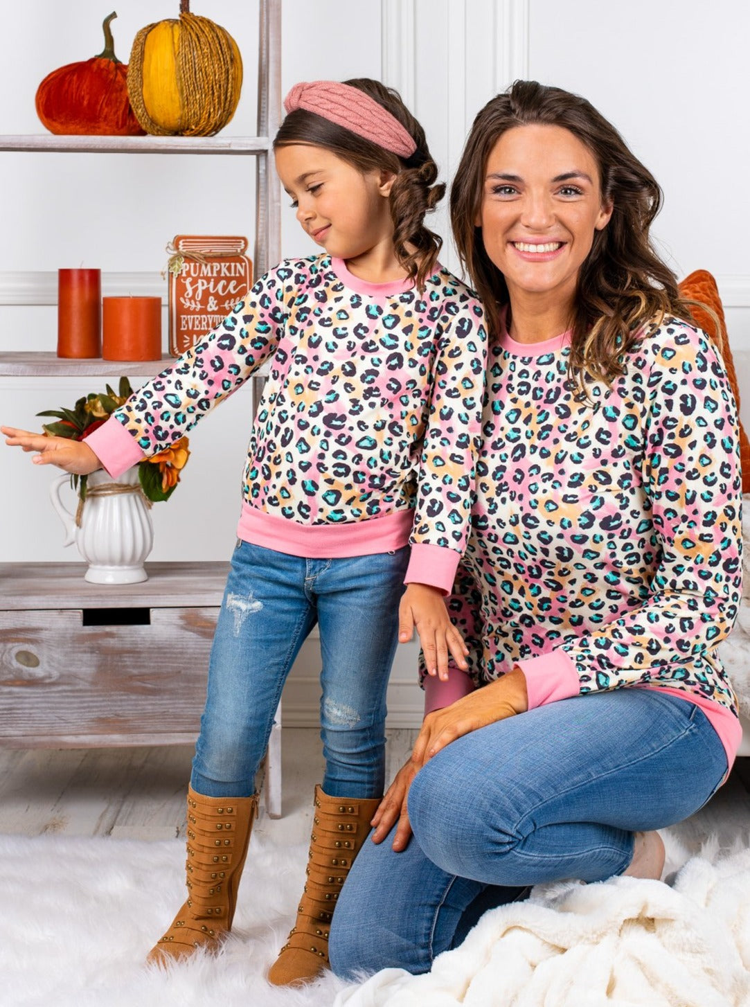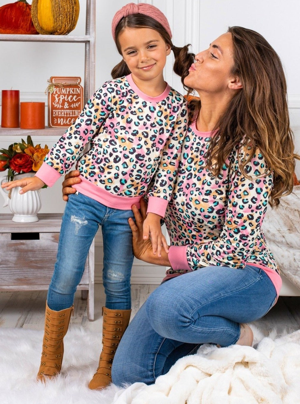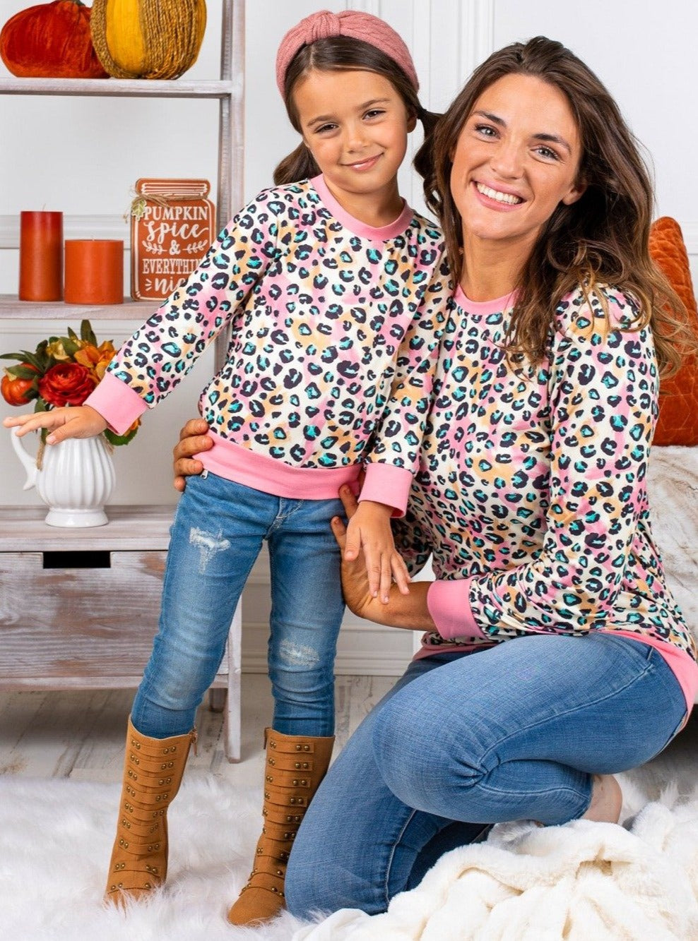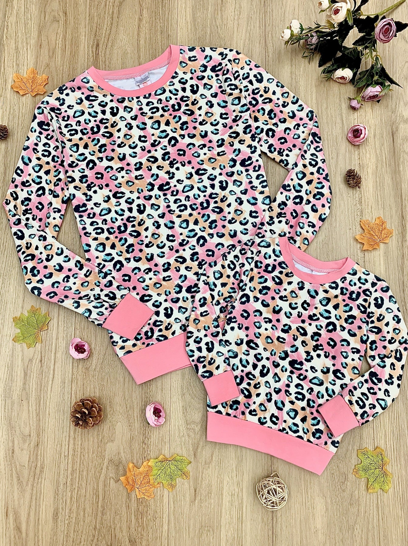 Paint the perfect picture with lovely matching pastel leopard long sleeve tops. Look cute together while staying warm and comfy on chilly days.