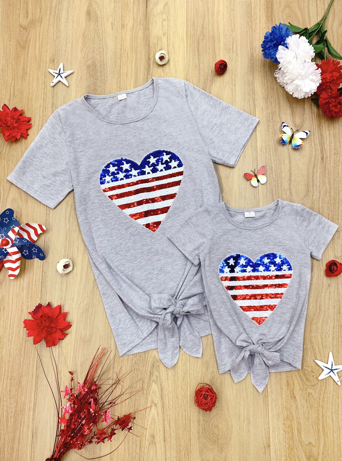 - We promise... our sweet mother-daughter matching proud patriot knot-hem sequin tops will not disappoint! Keep it cute and casual with your signature pair of shorts or leggings means running errands, hanging out with friends, or chilling with your baby-bestie will be perfectly on-trend. We know you'll HEART them!