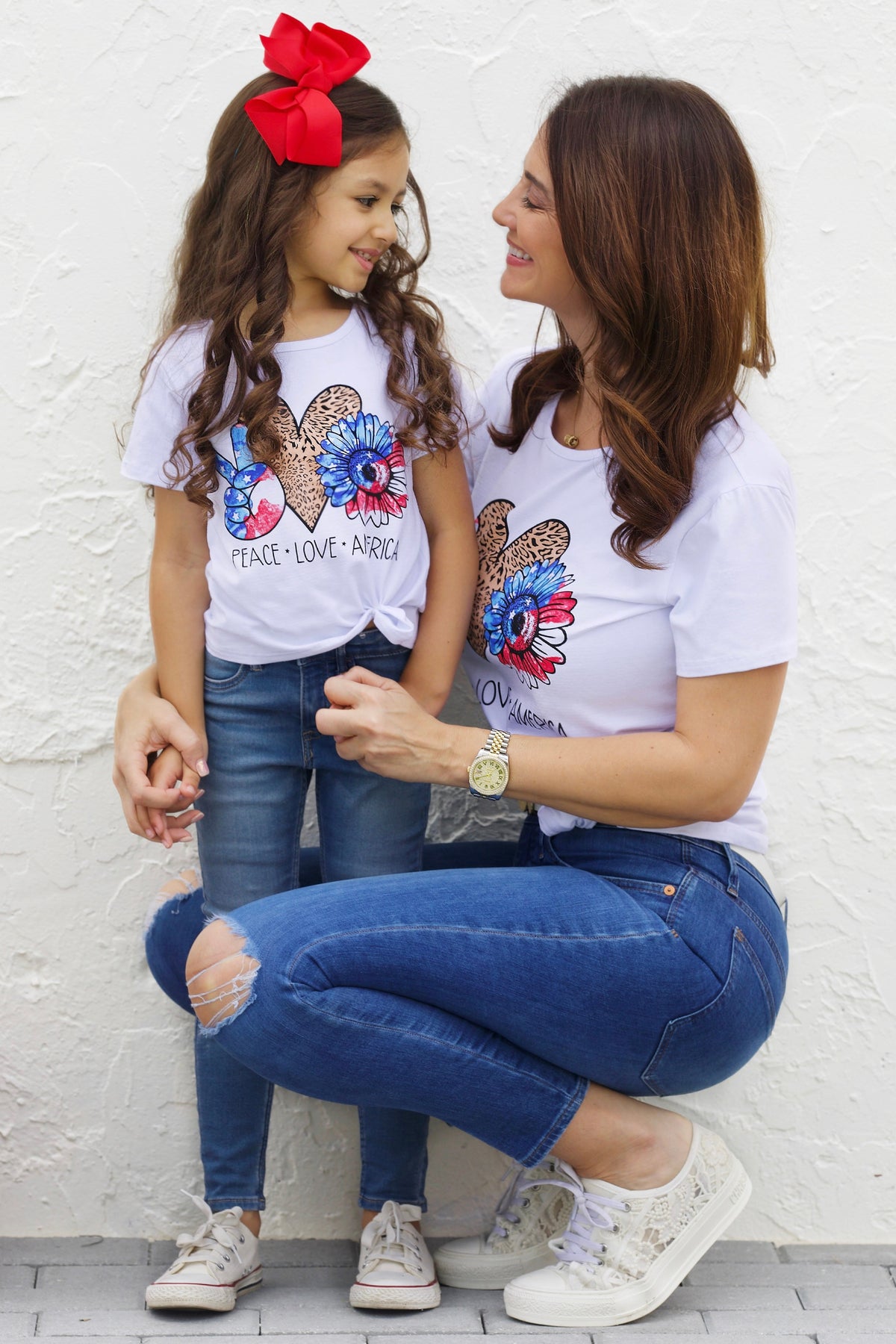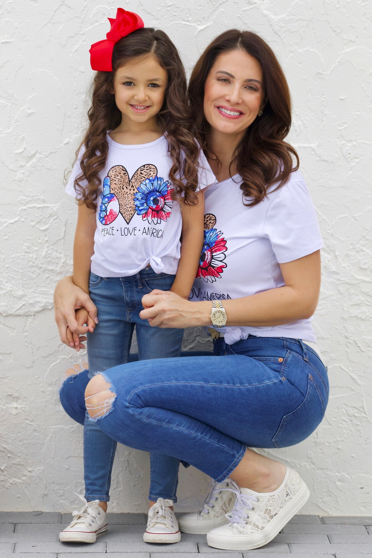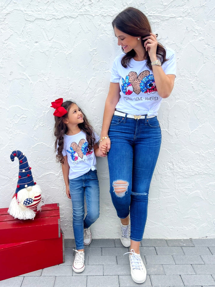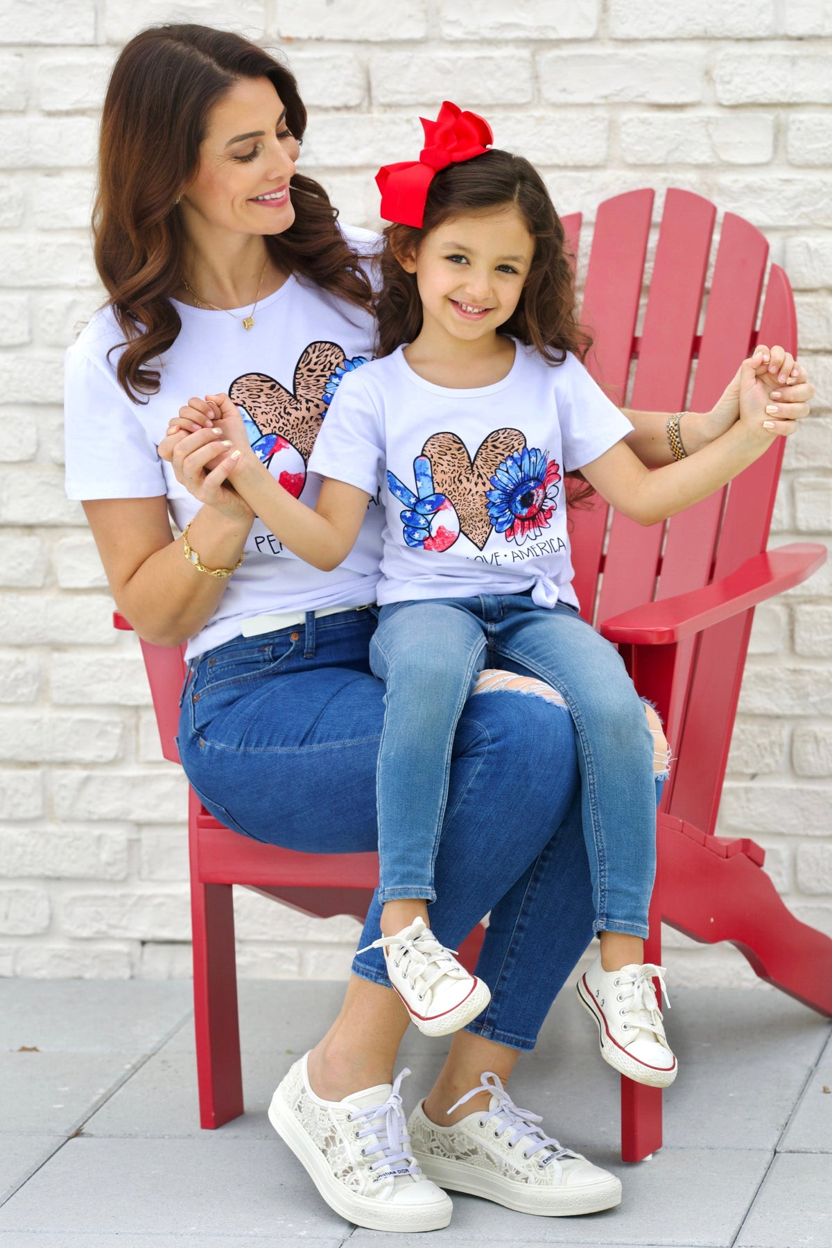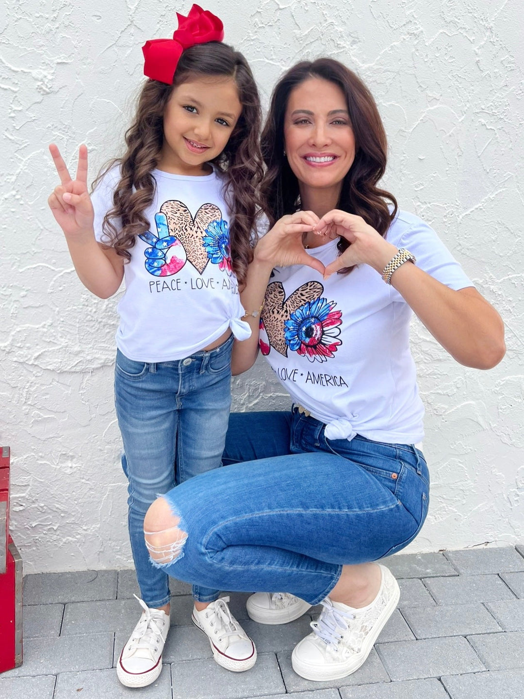 Celebrate your pride on Independence Day with our mother-daughter "Peace, Love, America" graphic tees. The leopard print heart in the center pops between peace signs and sunflowers decorated like the US Flag.
