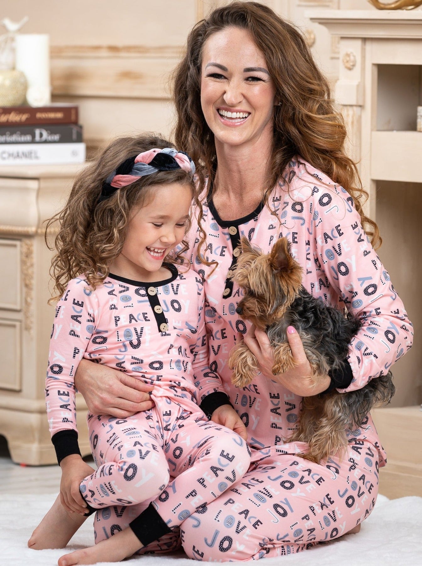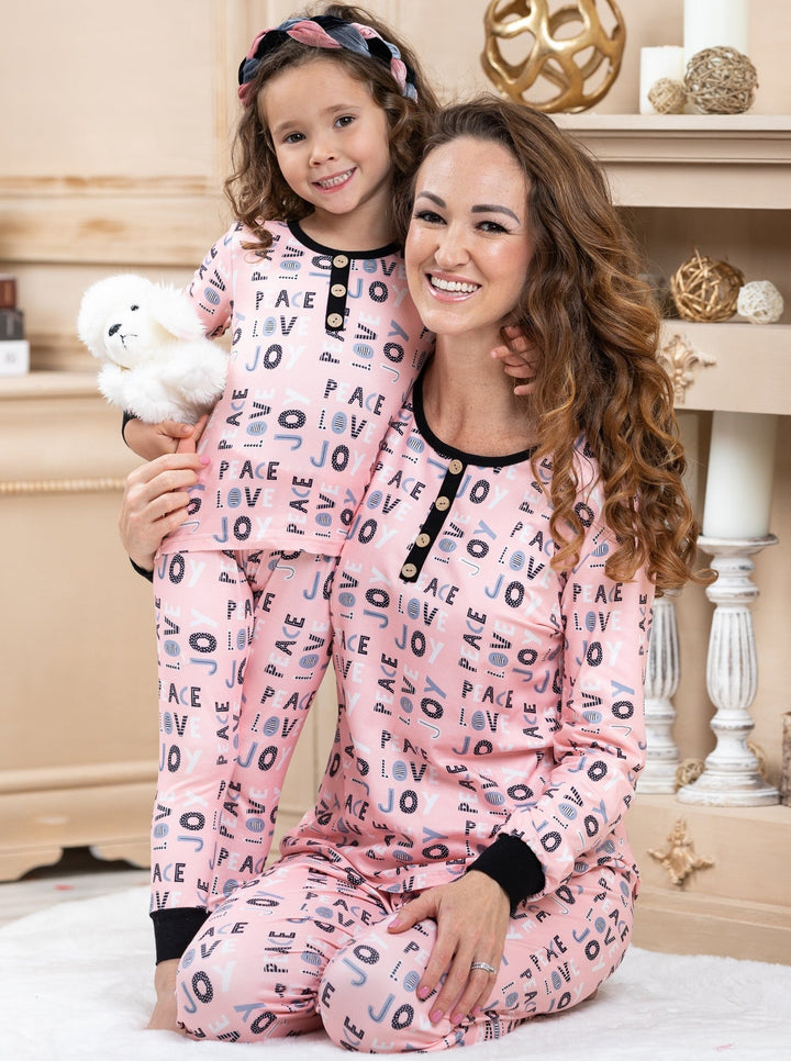 - "Peace Love Joy" cuffed pajama top with buttons and matching cuffed pajama pants