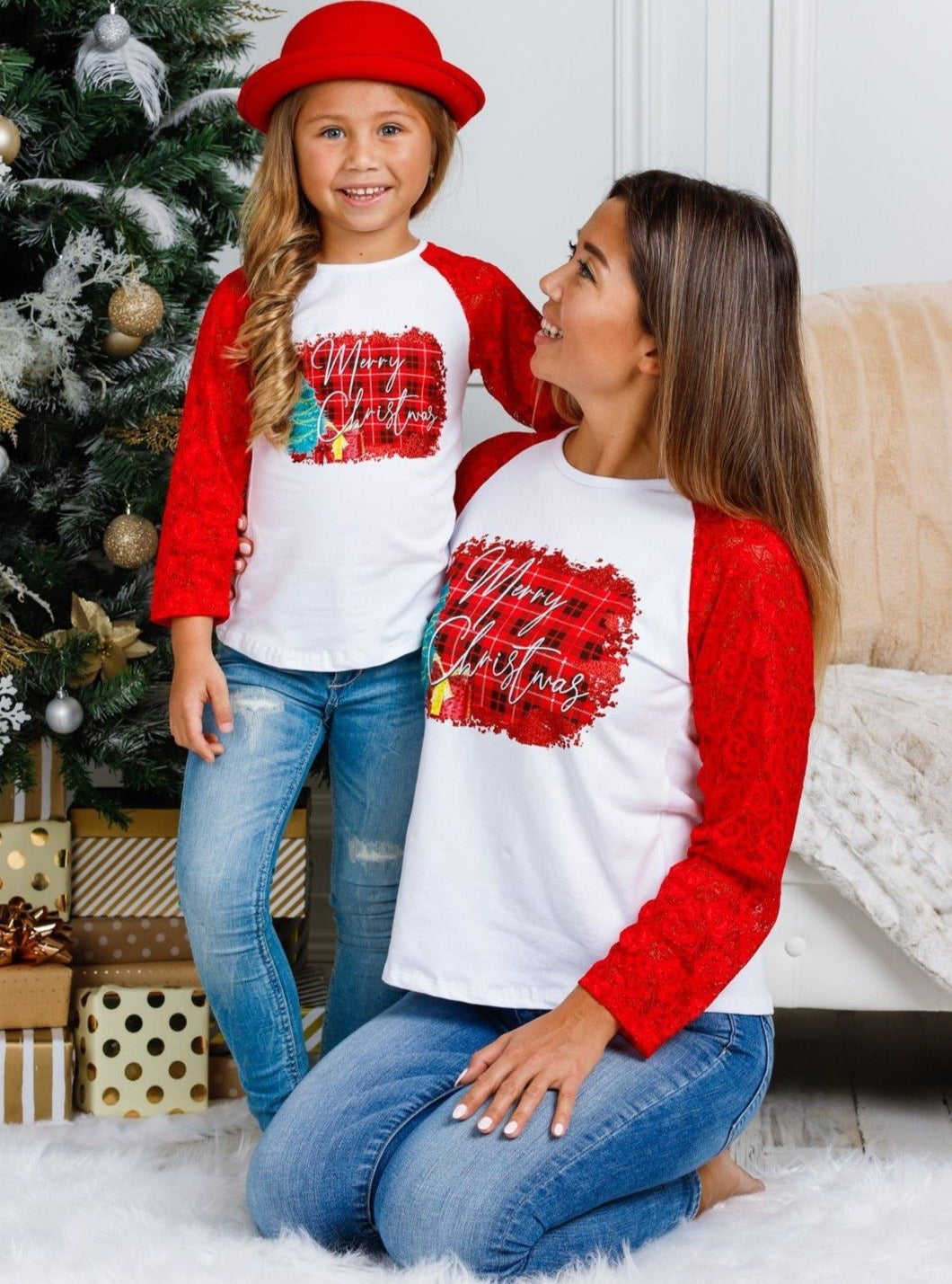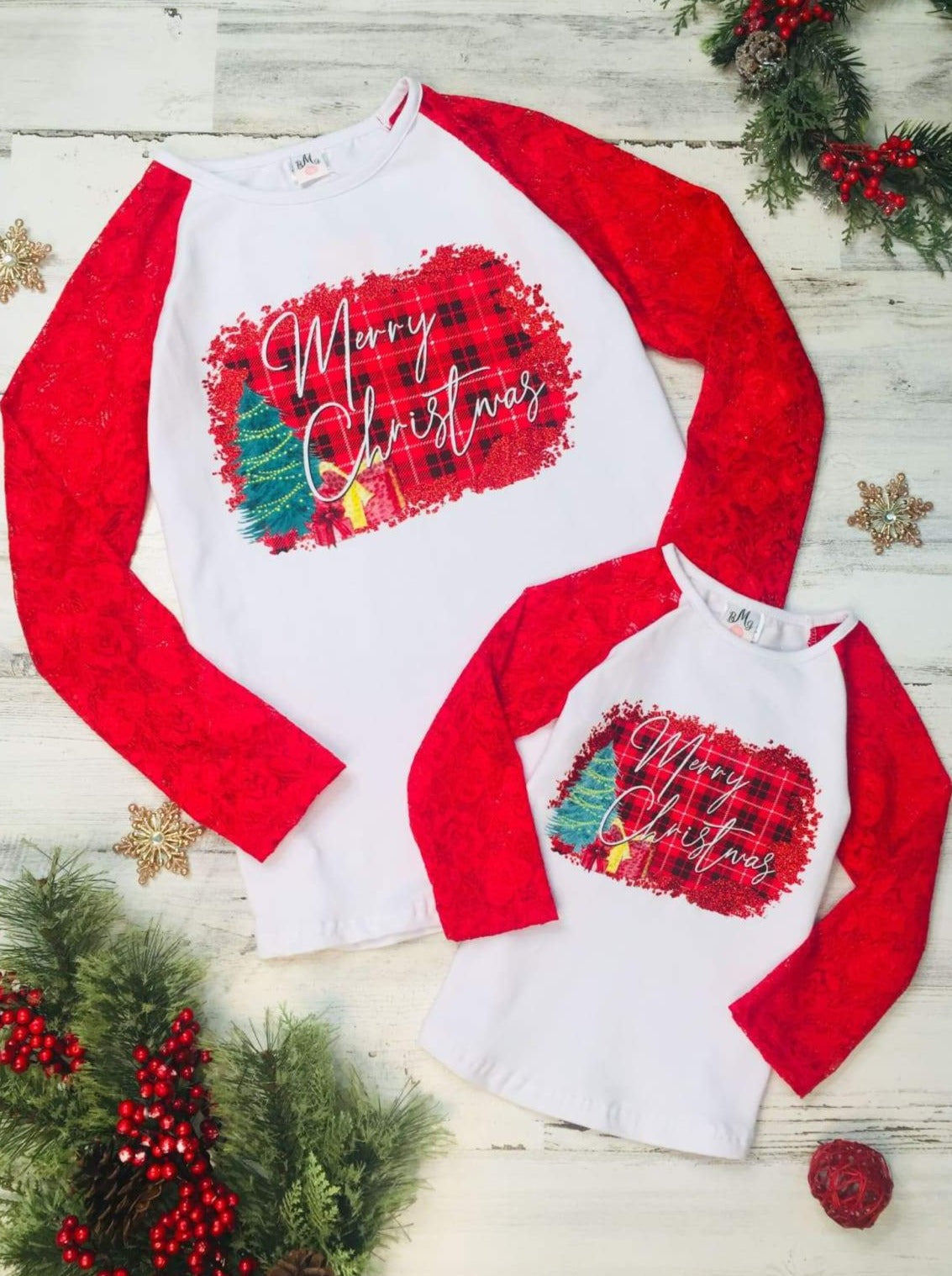 - Lace raglan sleeve top with "Merry Christmas" plaid graphic print design