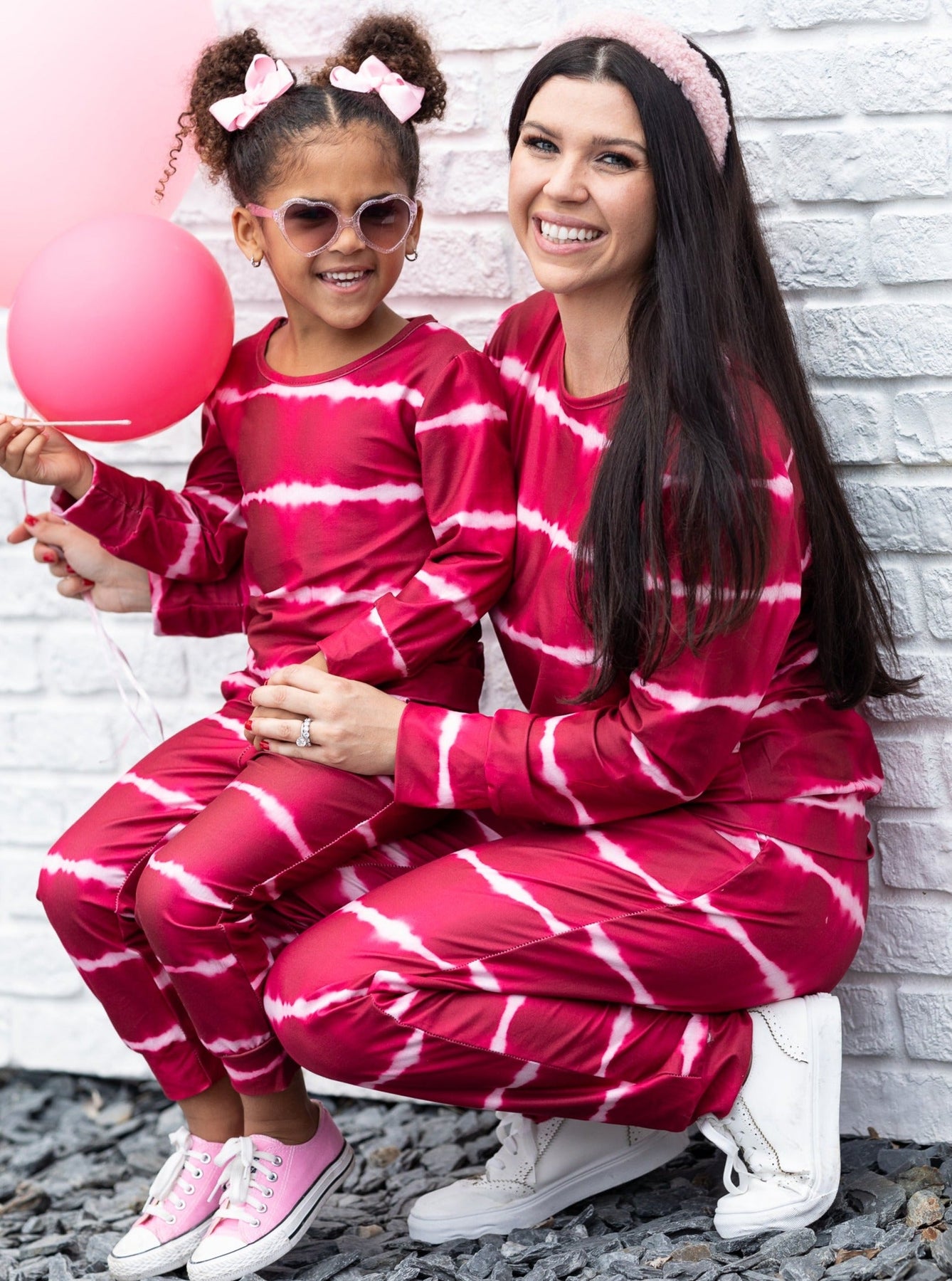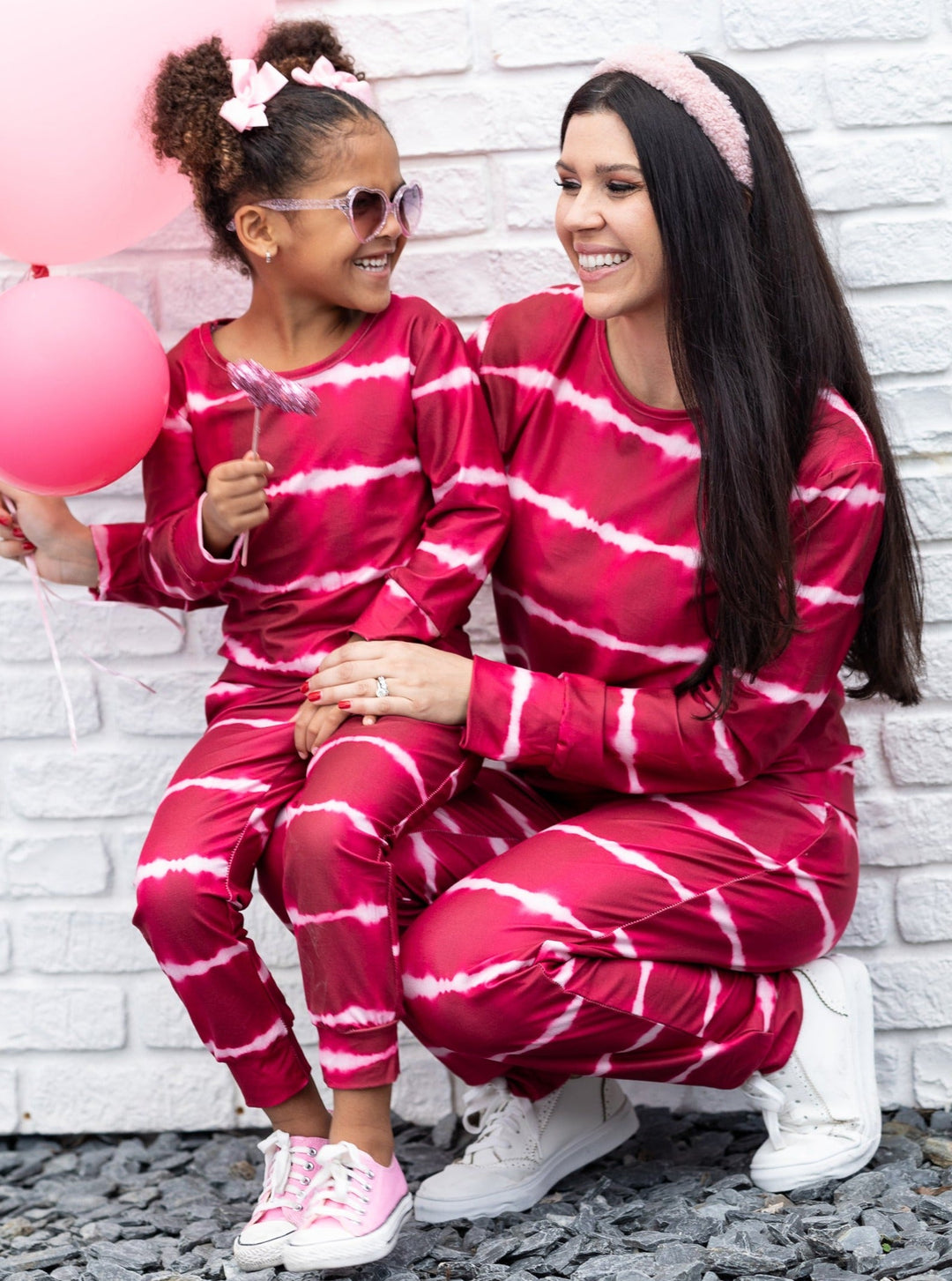 Do the stripes on this loungewear set make you look cute? ABSOLUTELY! The sleek fit of the tie-dye print fabric, adjustable drawstrings, and cuffed bottoms keep you warm while looking cool with your little girl.