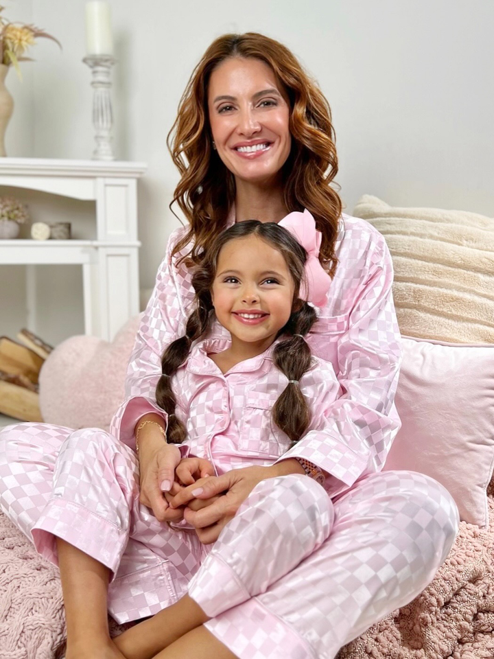 Mommy and Me Sleepy Cuddles Pink Checkered Silk Pajamas