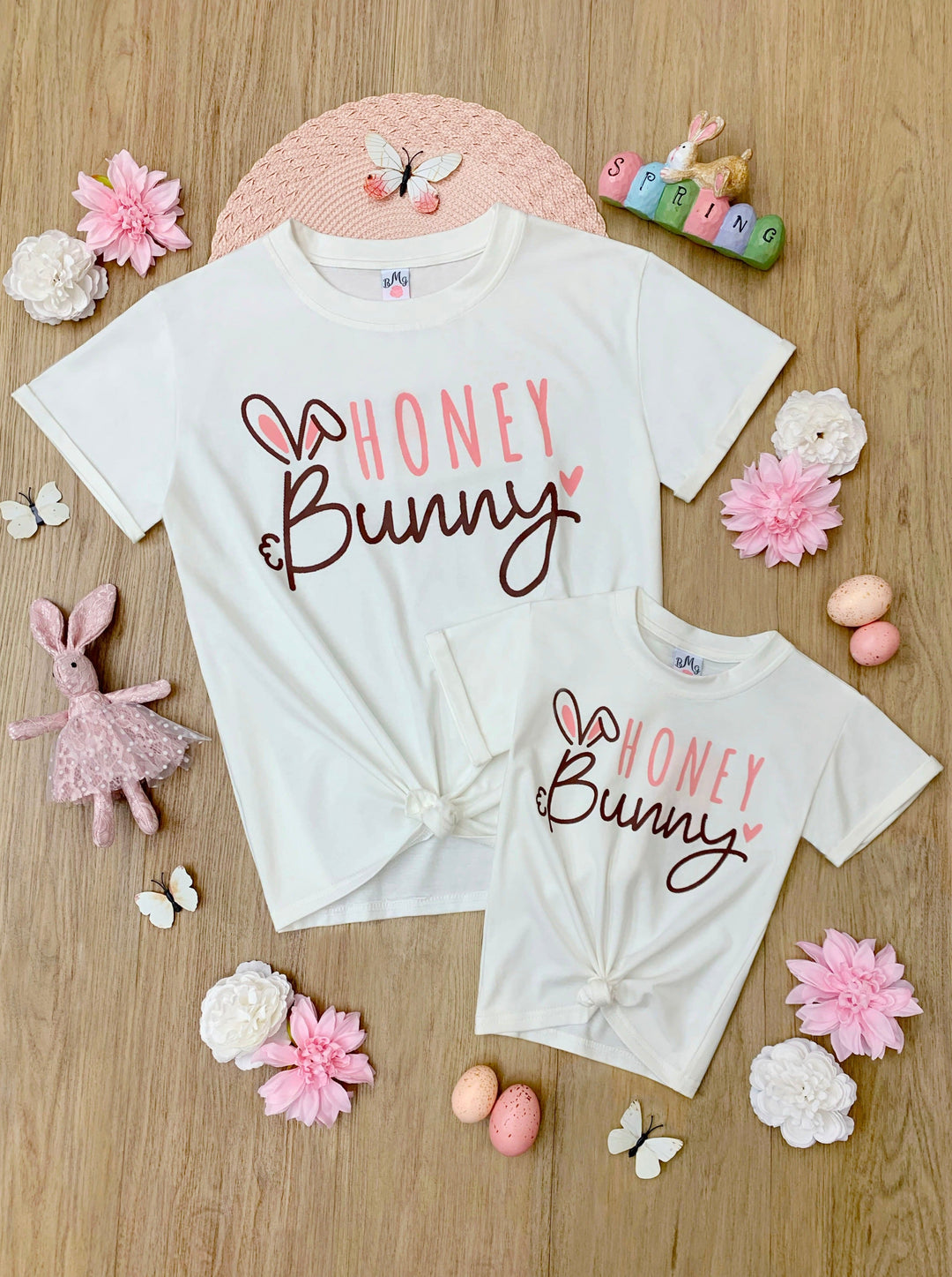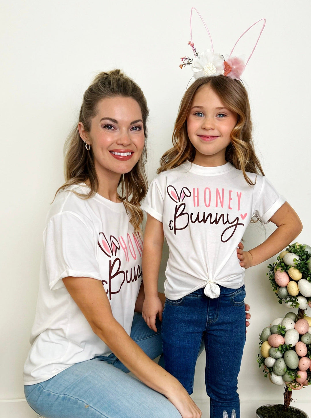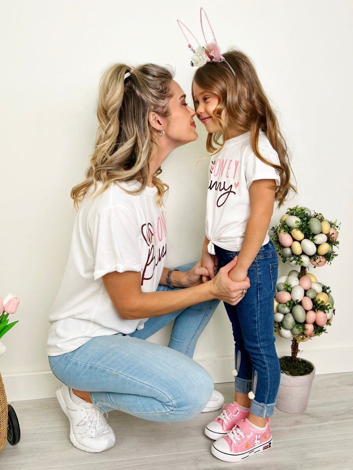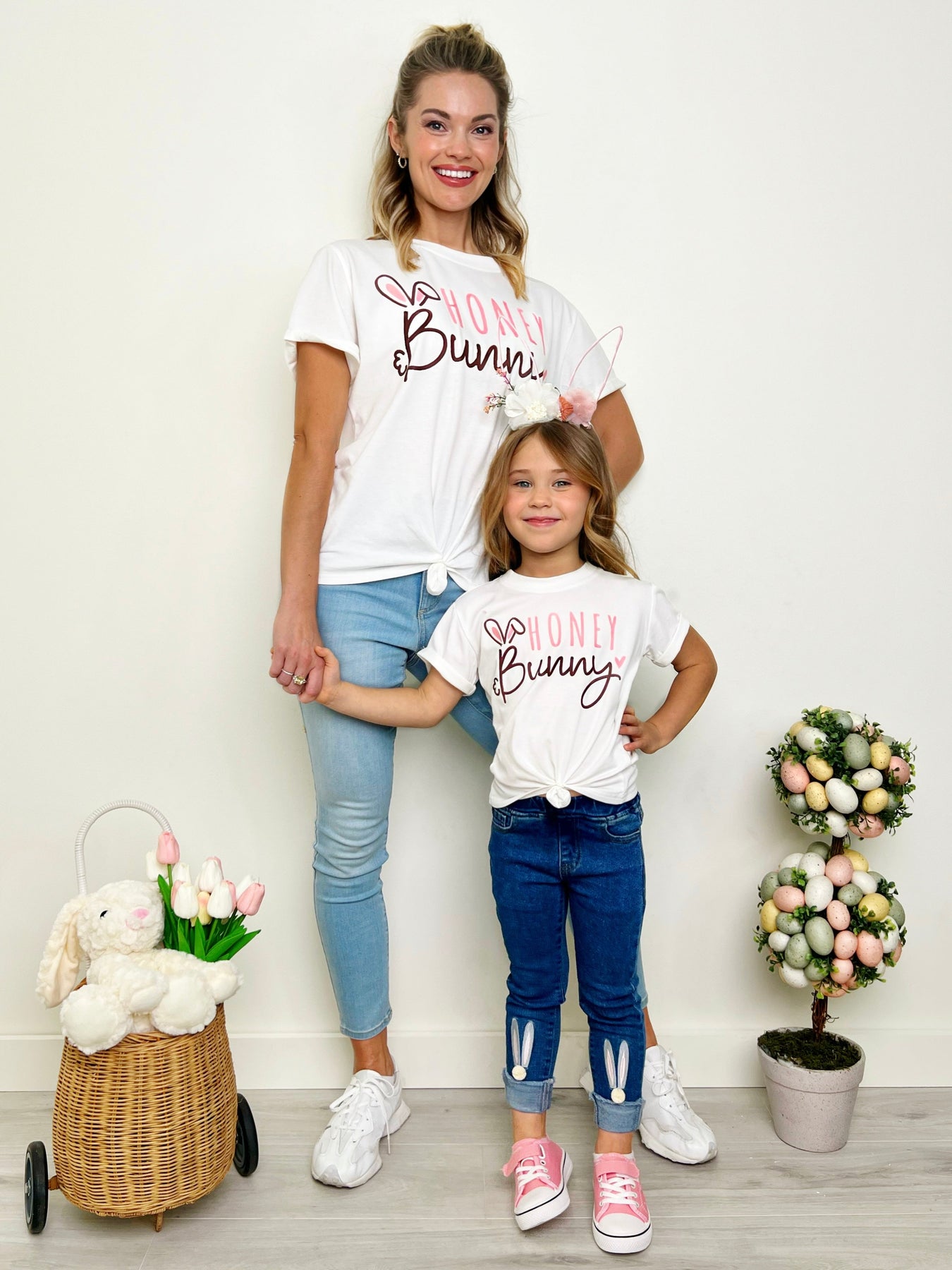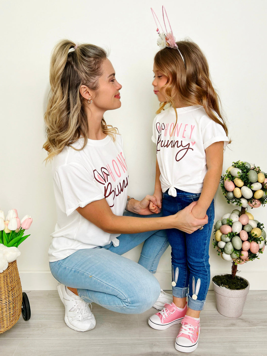 • Show off the bestie bond with our mother-daughter Honey Bunny knot hem tops. The sweet yet simple t-shirt design creates twinnable moments for Easter, mommy-mini playdates, or out running errands with your little girl.