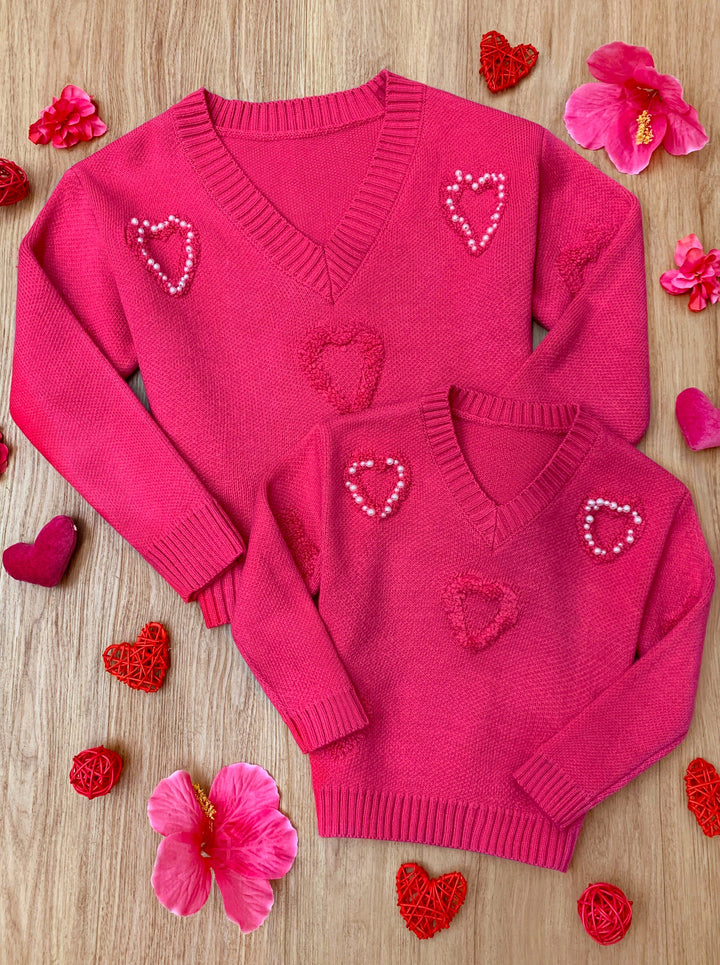 • Keep her close with our Mommy & Me v-neck sweater and your princess will feel extra loved for Valentine's! Decorated with pearl-embellished hearts, this cozy piece makes matching fashion even sweeter.