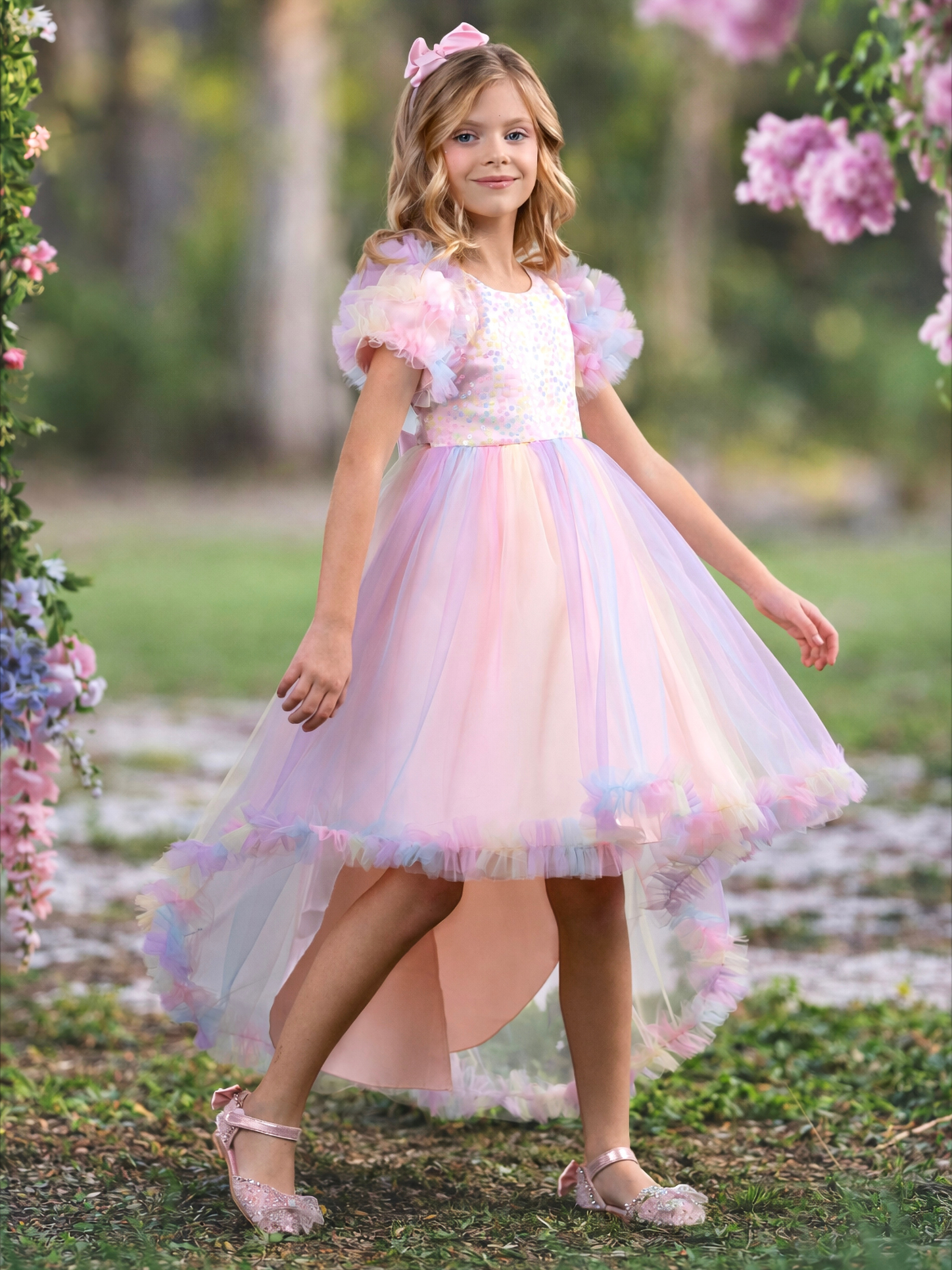 - Puff sleeve rainbow tulle hi-lo dress with sequined bodice