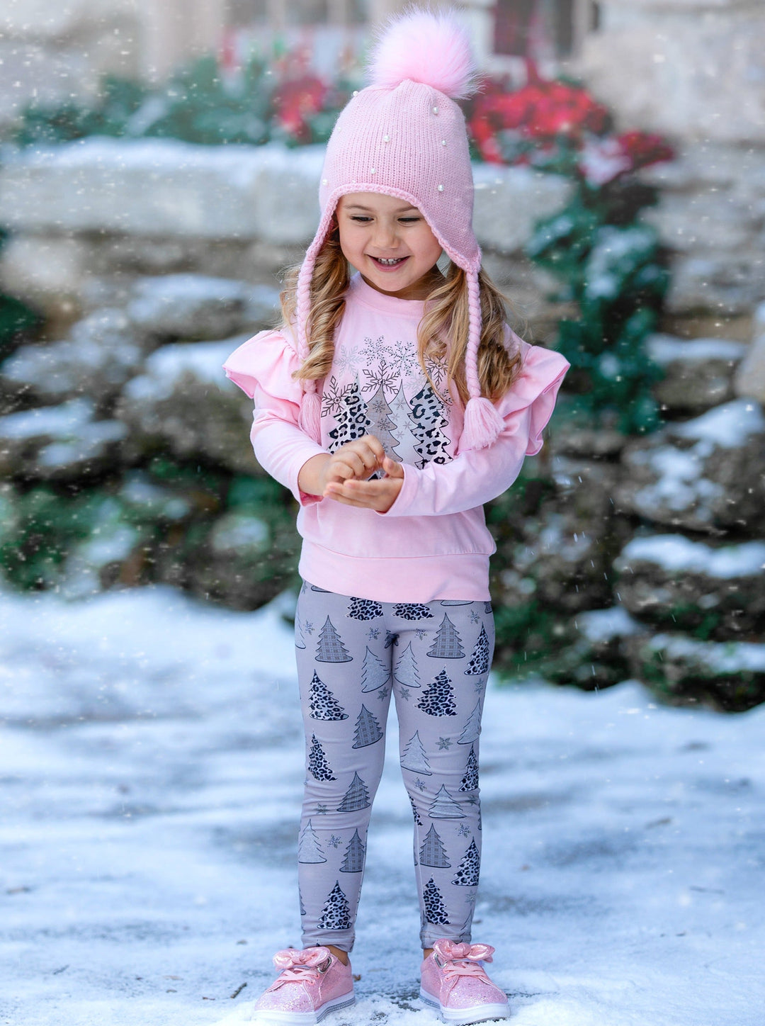 - Come through, Christmas tree cuteness! This girls' legging set will keep things interesting and sassy for the holiday season. Don't you love the ruffle shoulders?