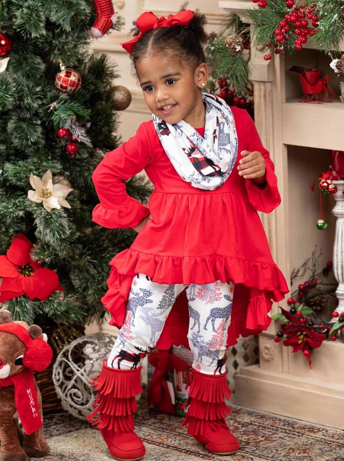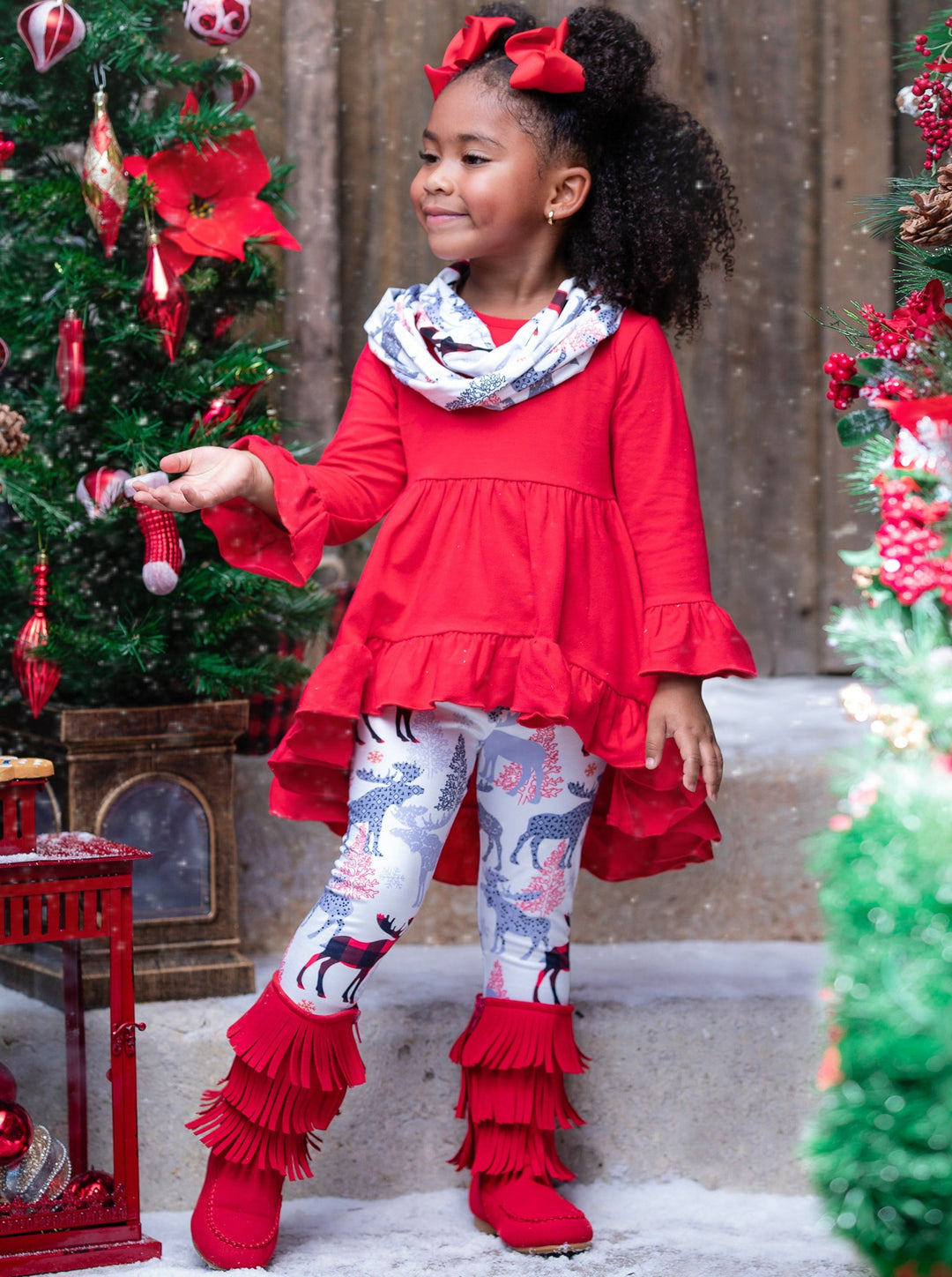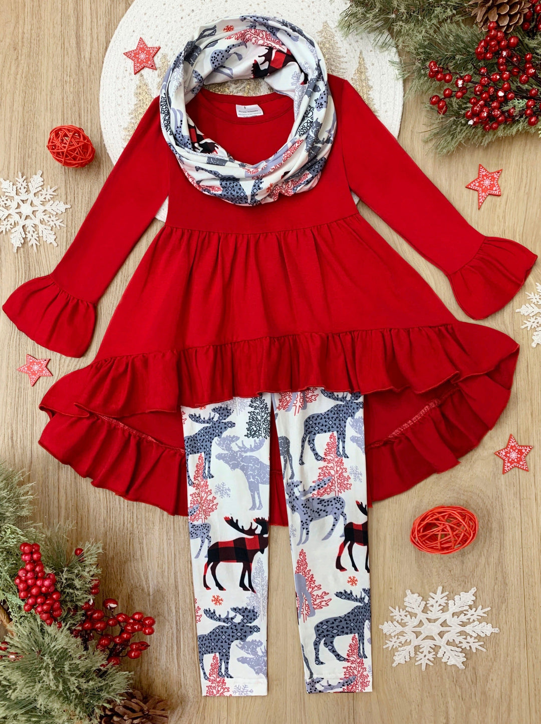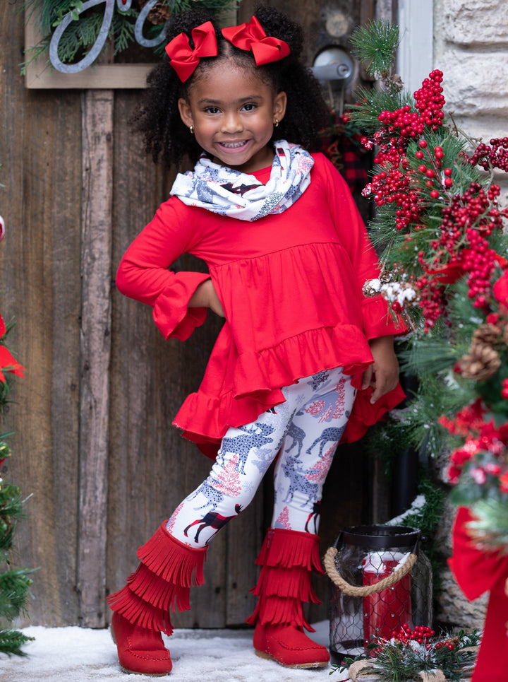 Long-sleeve hi-lo ruffle tunic with flare cuffs, reindeer-winter print leggings, and matching infinity wrap scarf