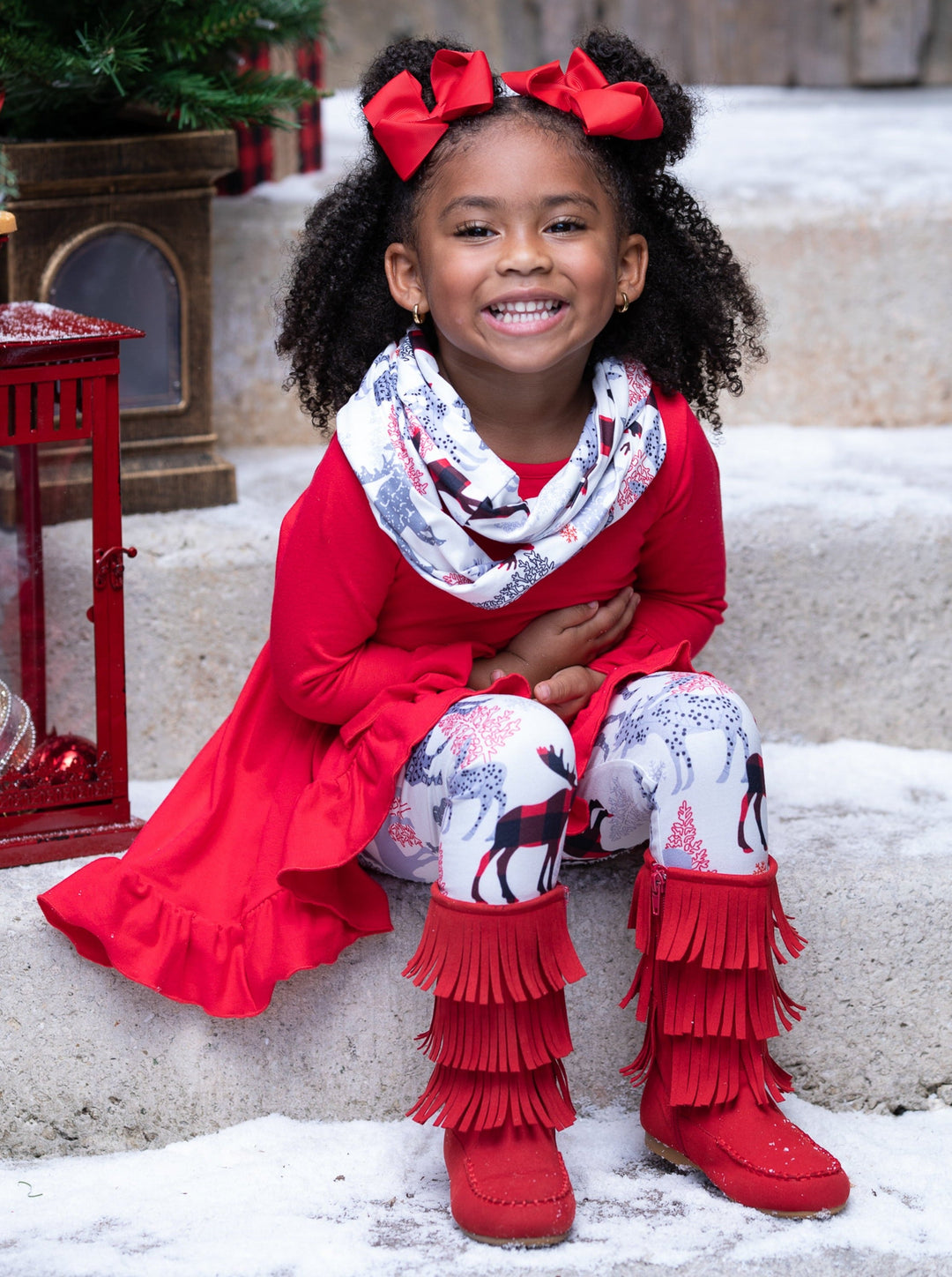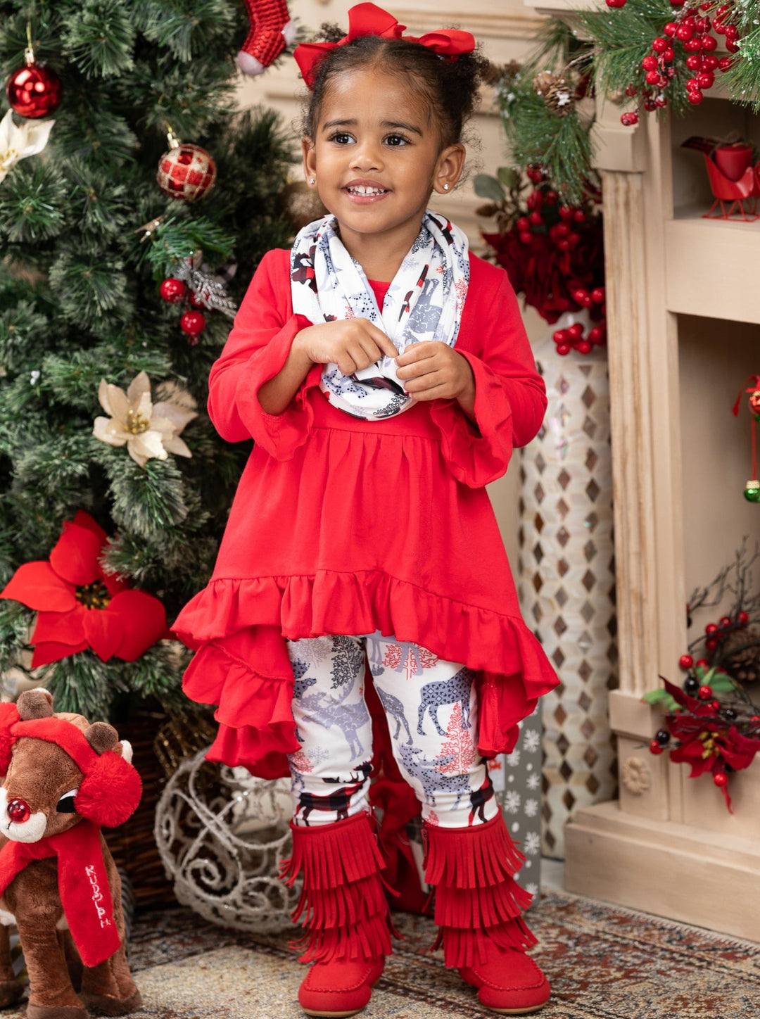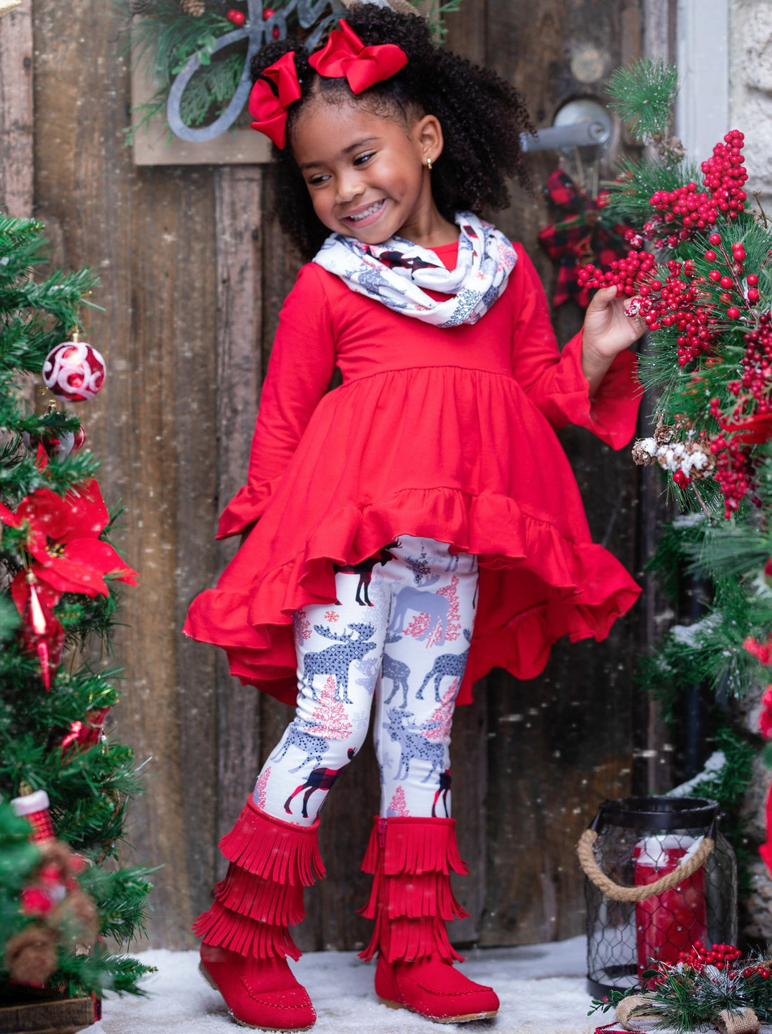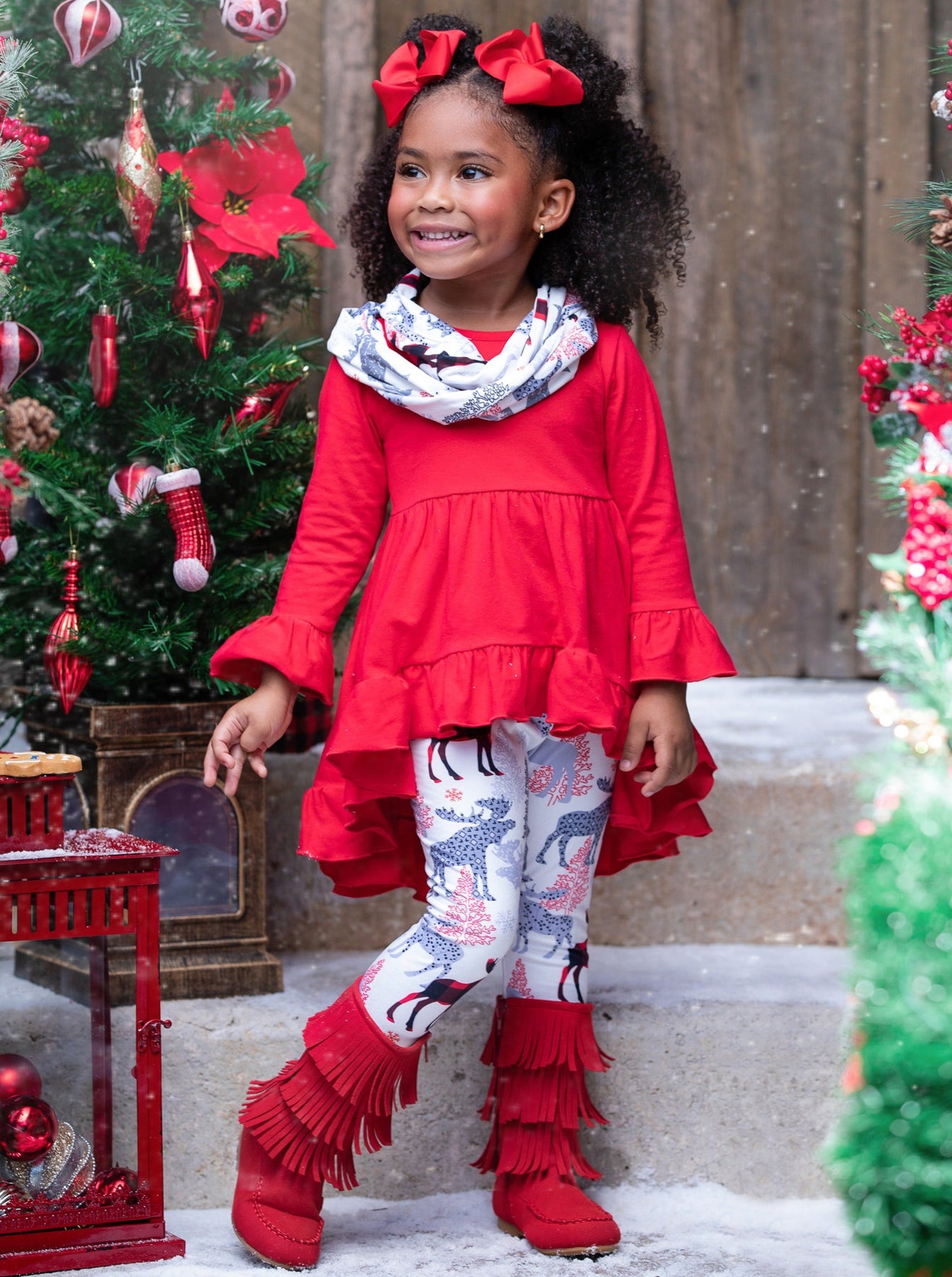 Long-sleeve hi-lo ruffle tunic with flare cuffs, reindeer-winter print leggings, and matching infinity wrap scarf