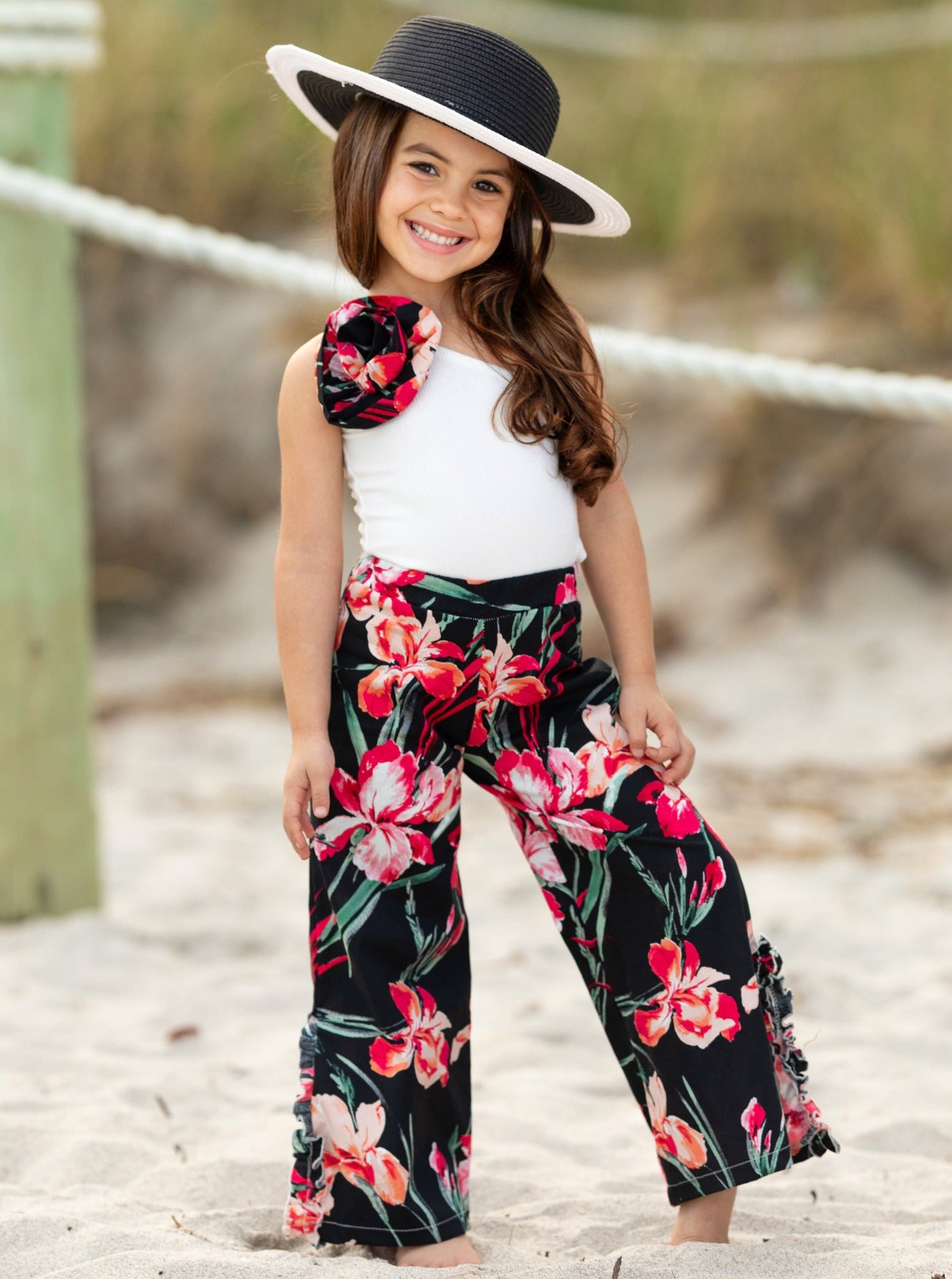 - Floral flair meets spring sweetness in our one shoulder floral palazzo pants set. Its easy-breezy silhouette is decorated with pretty blooms and finished with a statement rosette detail. A style statement for little fashionistas.