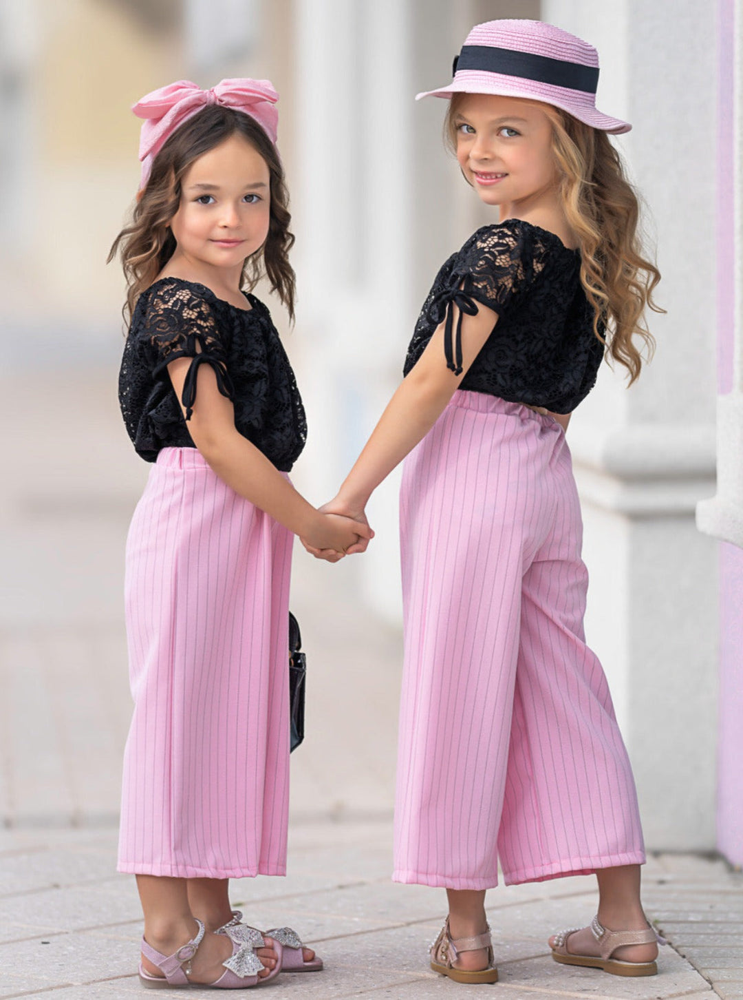 - Easy, breezy, beautiful! Our pinstripe palazzo pants set will have your little girl feeling like a mini boss babe. The cute combo of black lace and pink stripes is ready for fashion runways and OOTD photos. A must-have for your future fashion CEO!