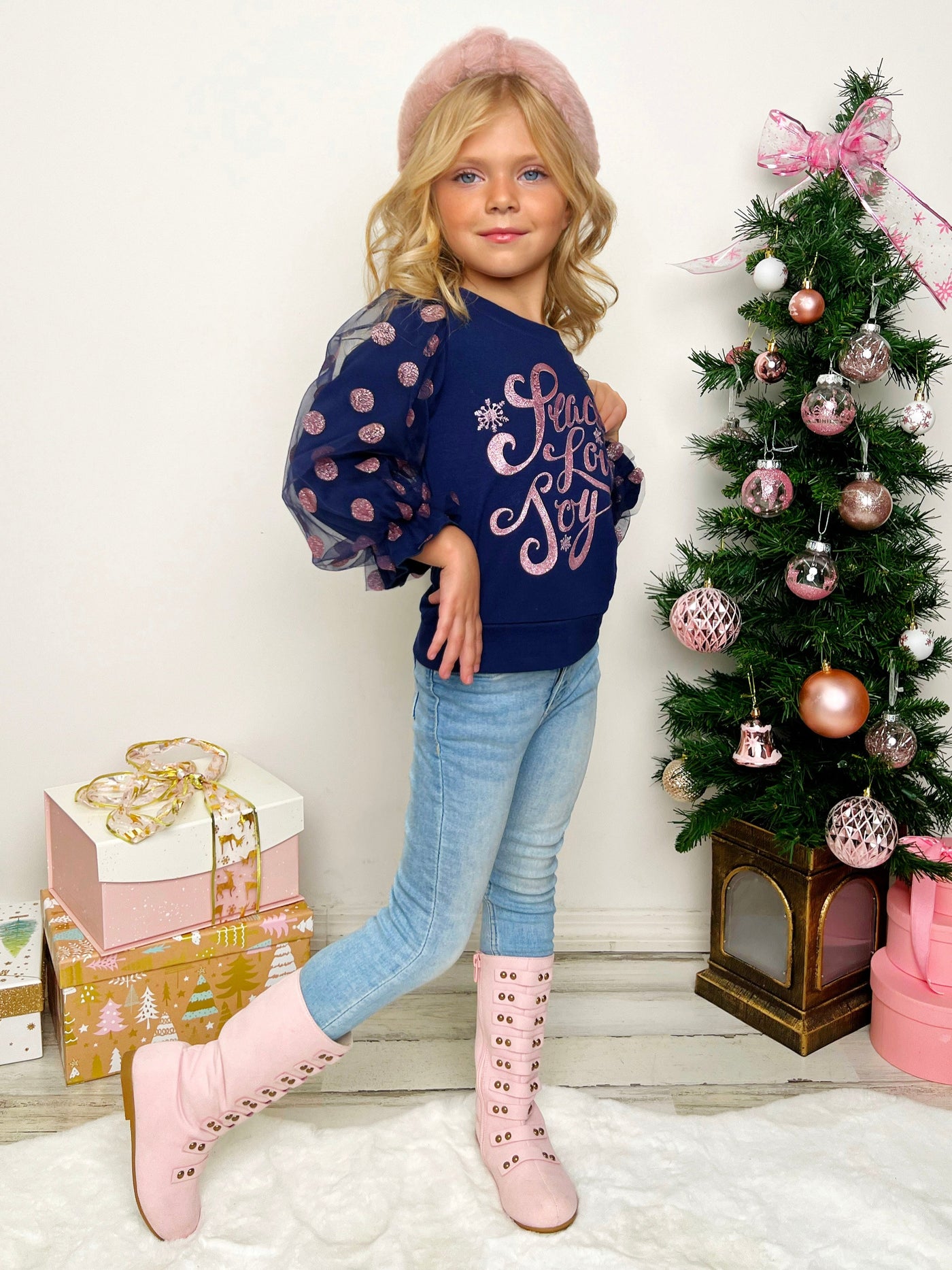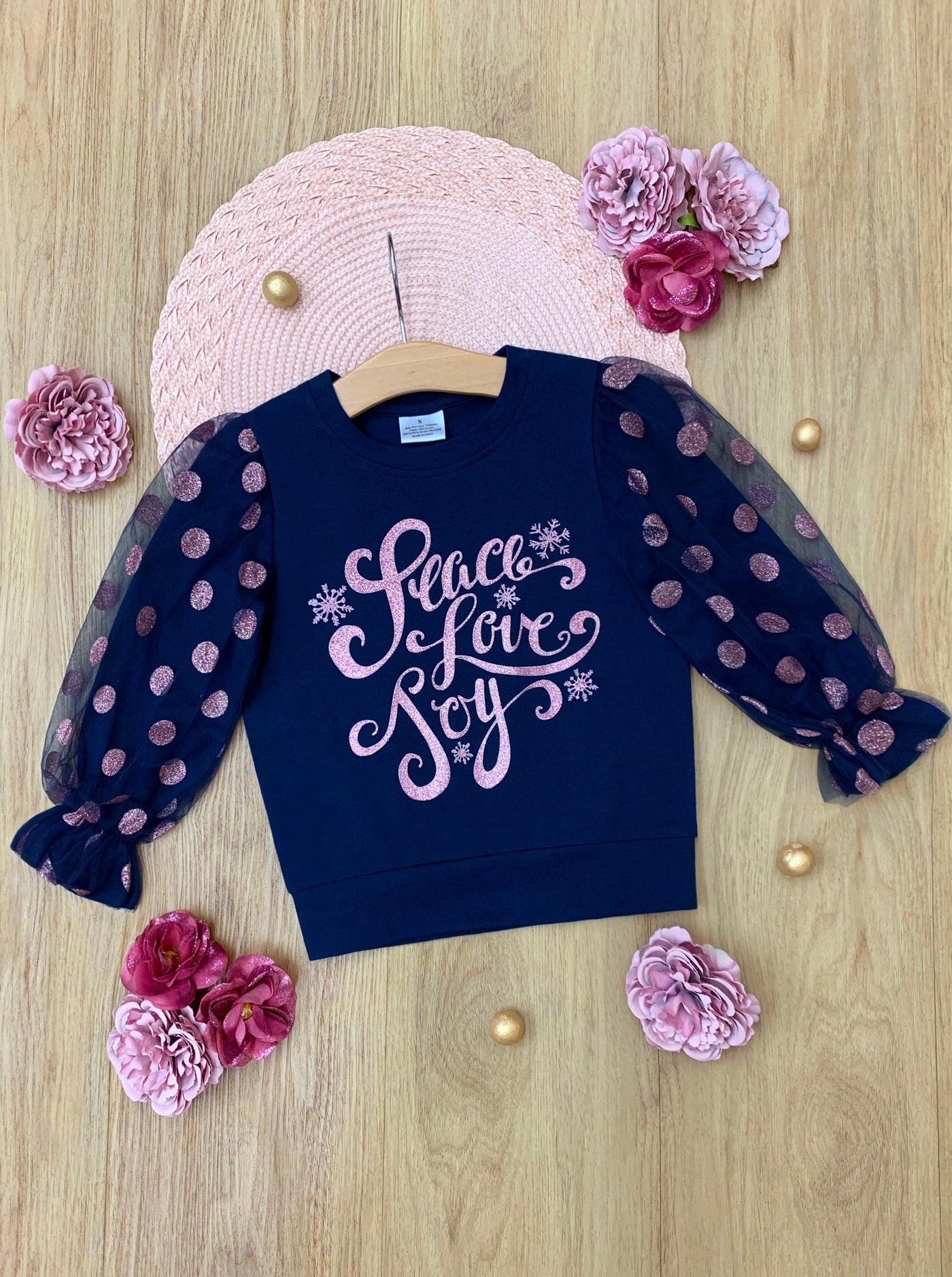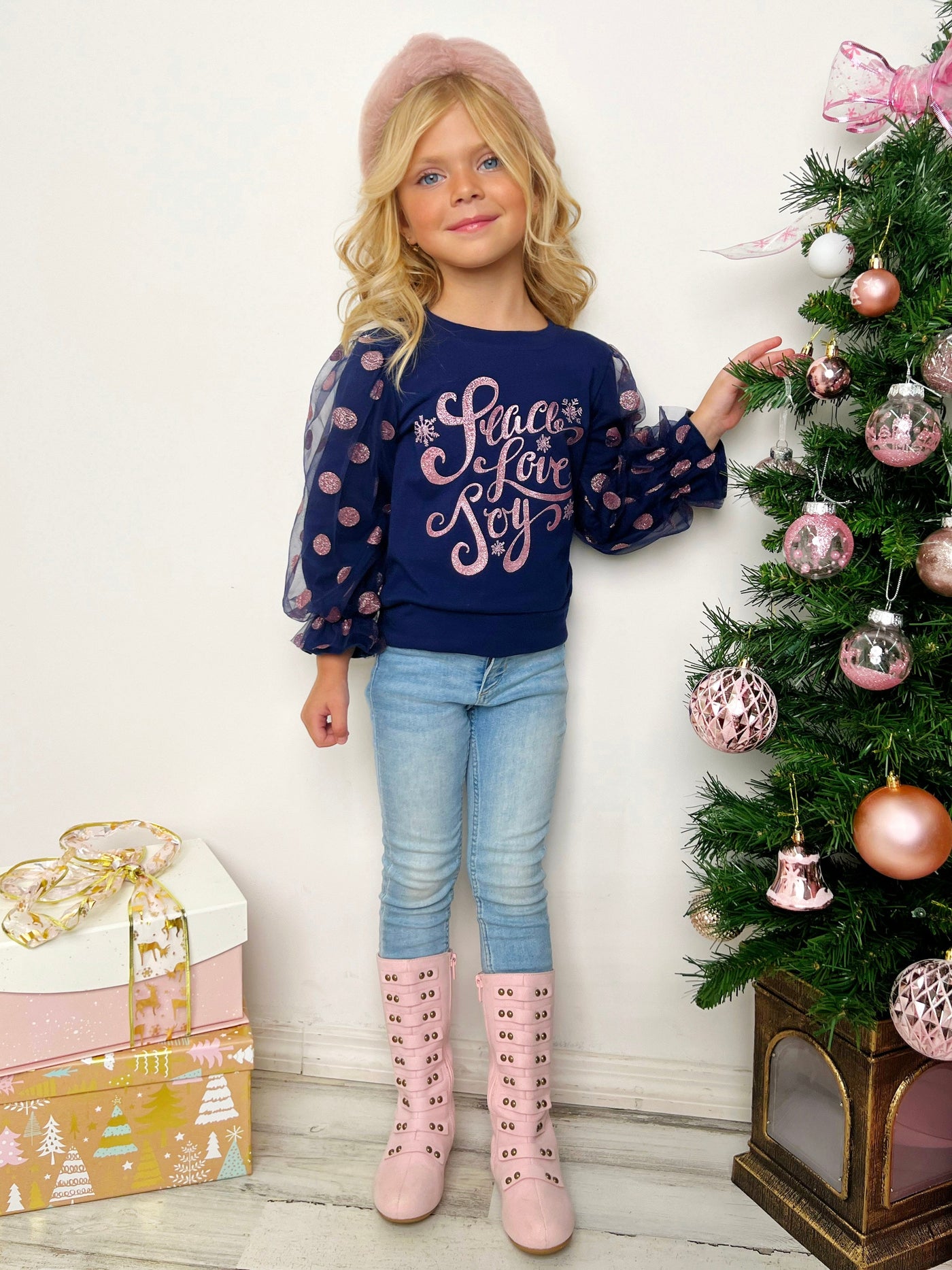• This Peace, Love, Joy tulle sleeve top will have your little girl spreading cheer and charm wherever she goes! With its statement tulle sleeves with polka dot details and gorgeous colorway, this pretty blouse is a holiday essential for little fashionistas!
