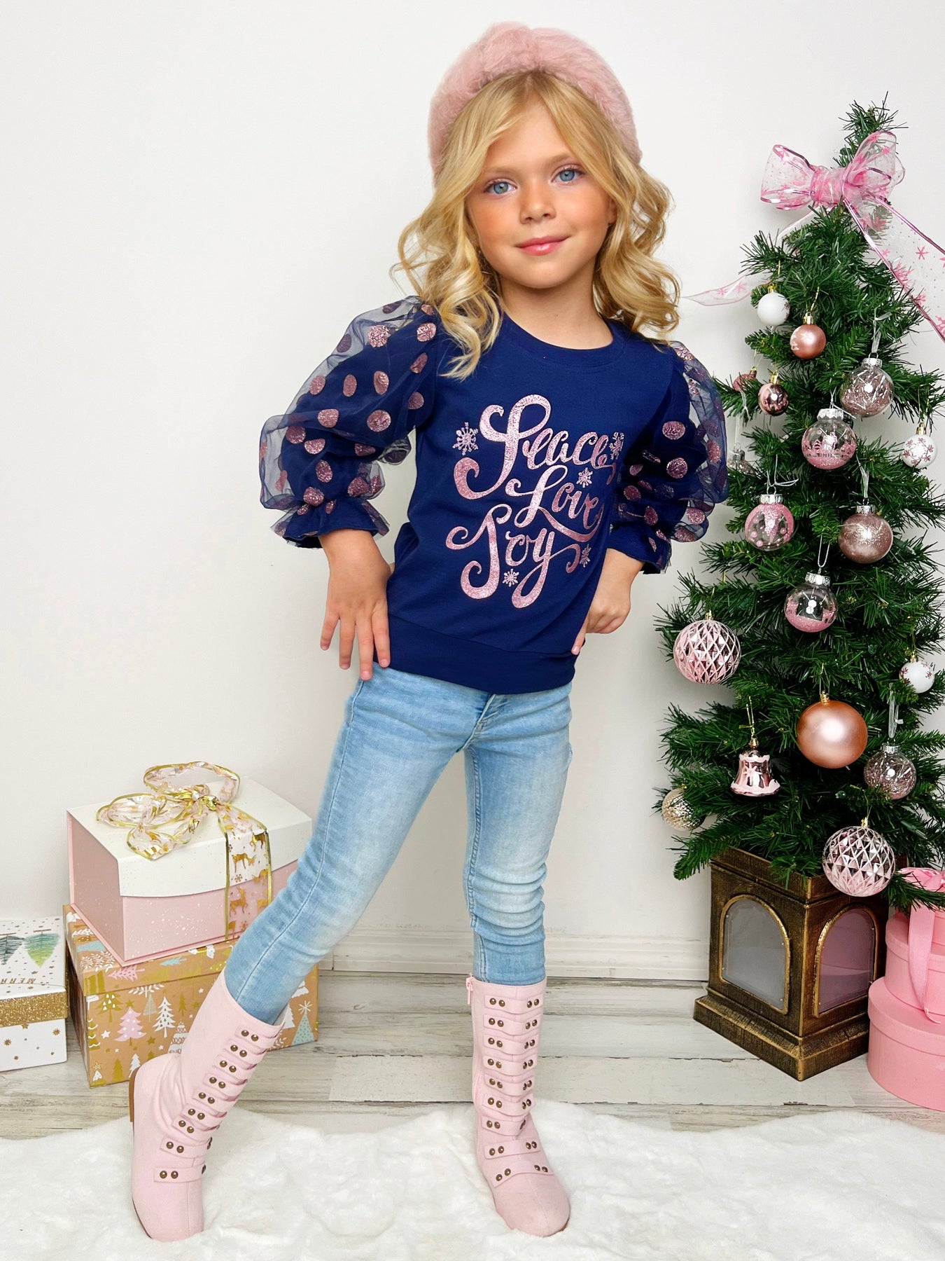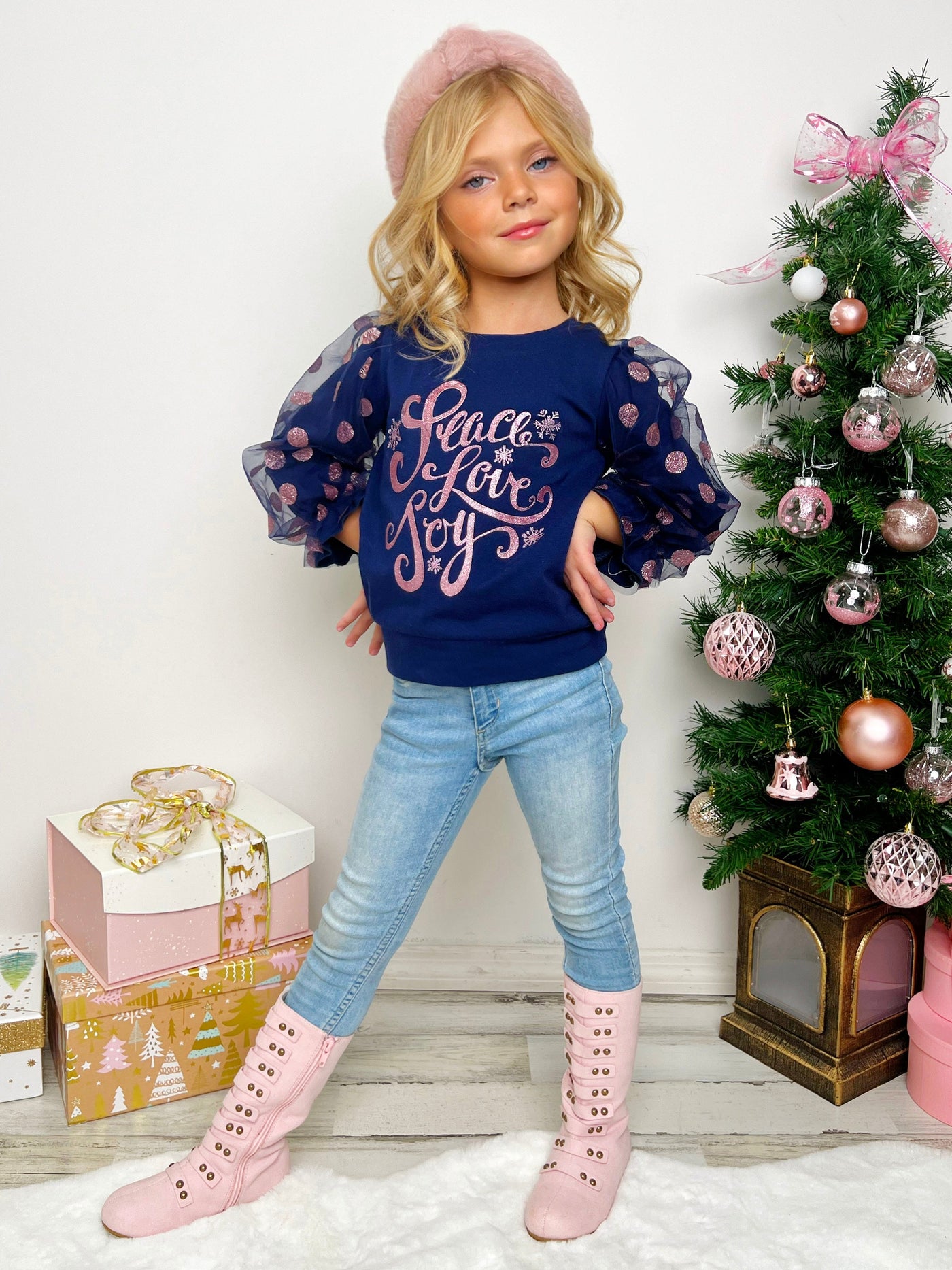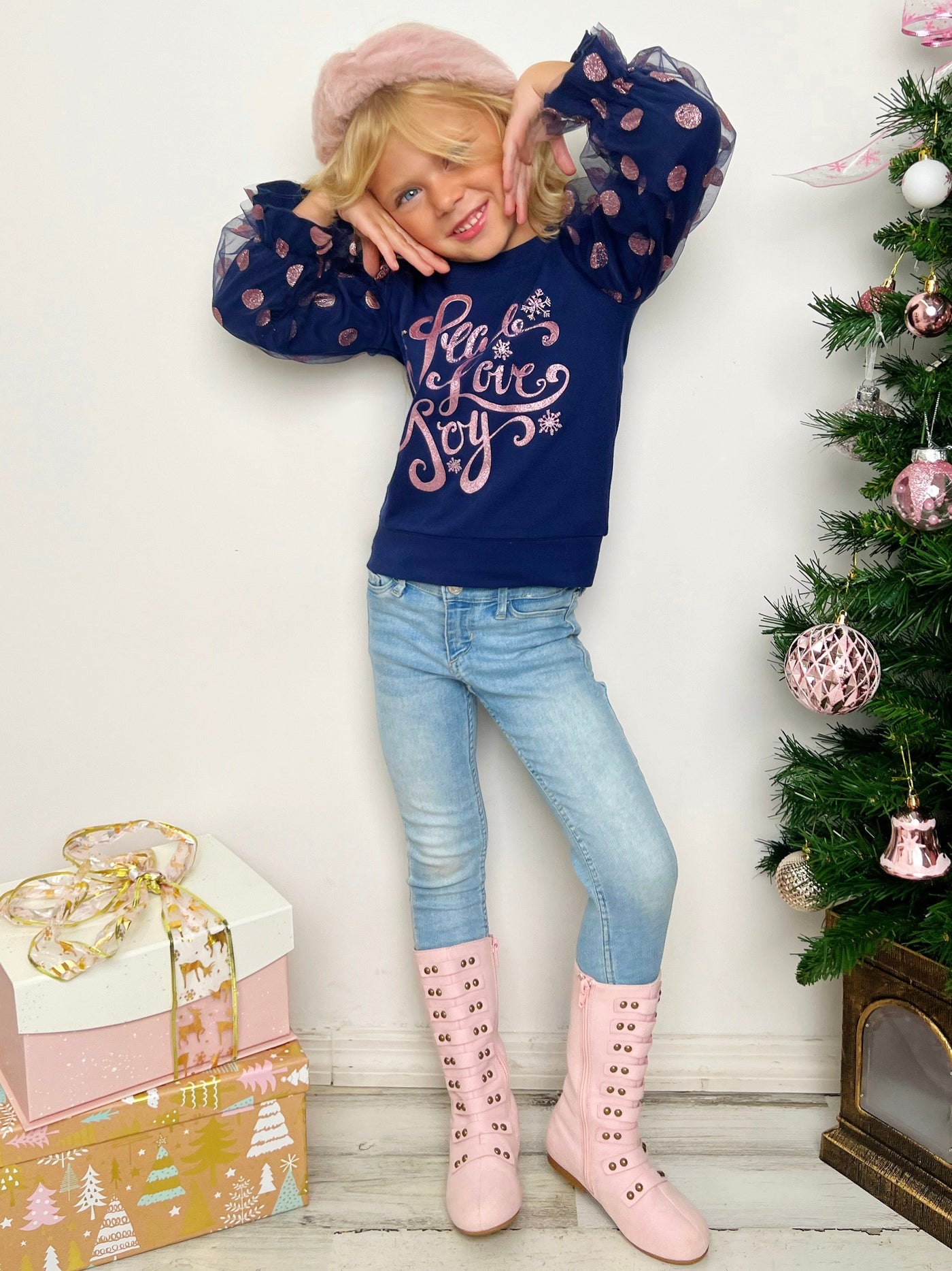 • This Peace, Love, Joy tulle sleeve top will have your little girl spreading cheer and charm wherever she goes! With its statement tulle sleeves with polka dot details and gorgeous colorway, this pretty blouse is a holiday essential for little fashionistas!