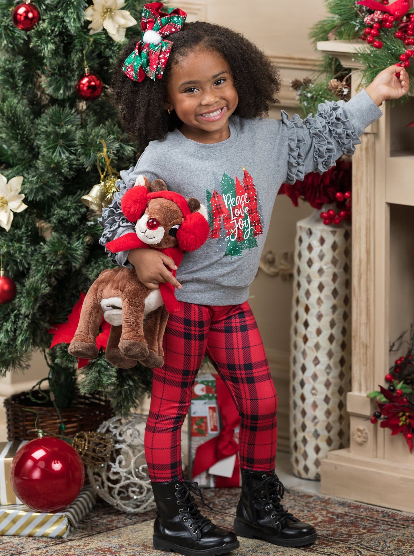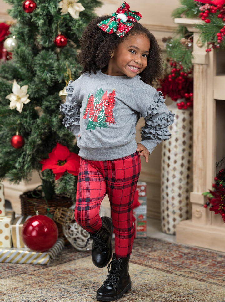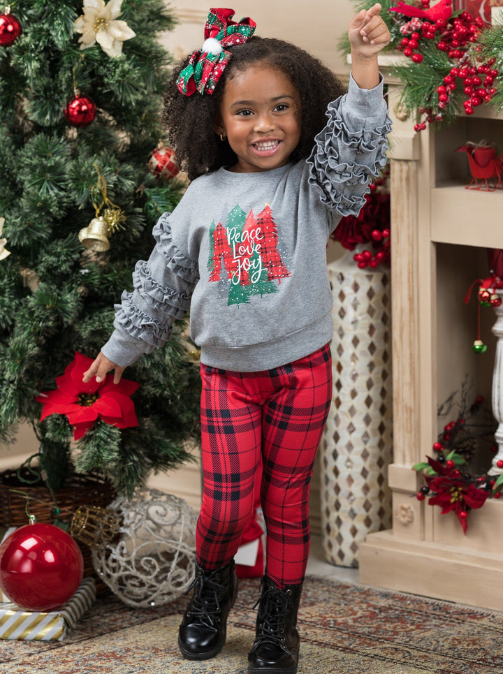 Long-sleeve pullover top with "Peace Love Joy" plaid Christmas tree graphic print, ruffle sleeve accents and matching plaid leggings