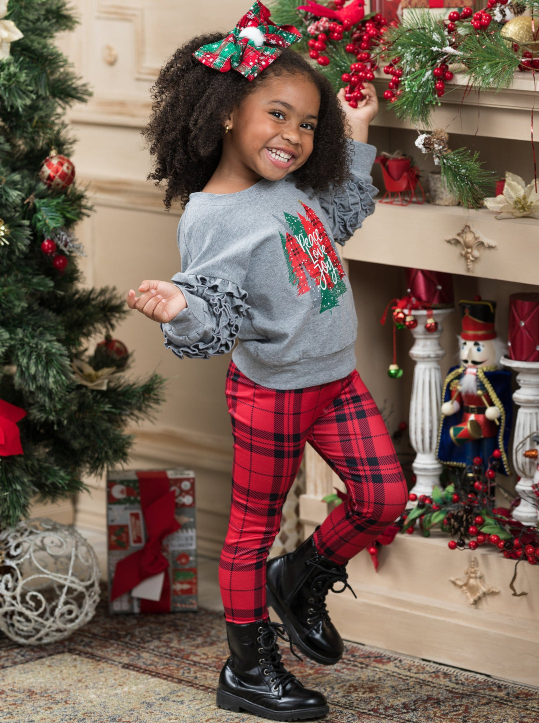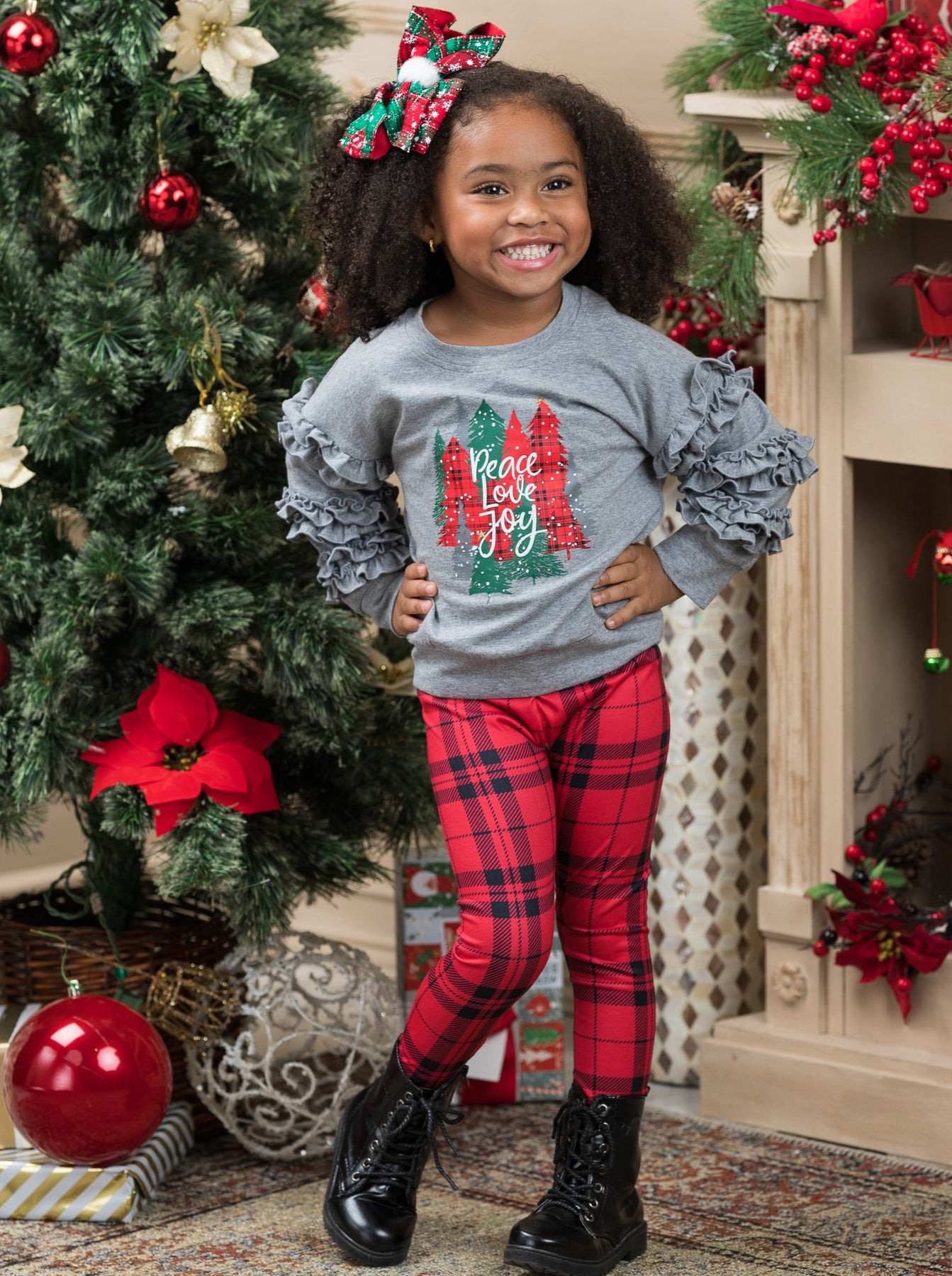 We know what really matters this holiday season: Peace, Love, Joy, and cute plaid legging sets for girls! Get your sugarplum this stylish ruffle top and leggings to bring Christmas cheer to her closet.