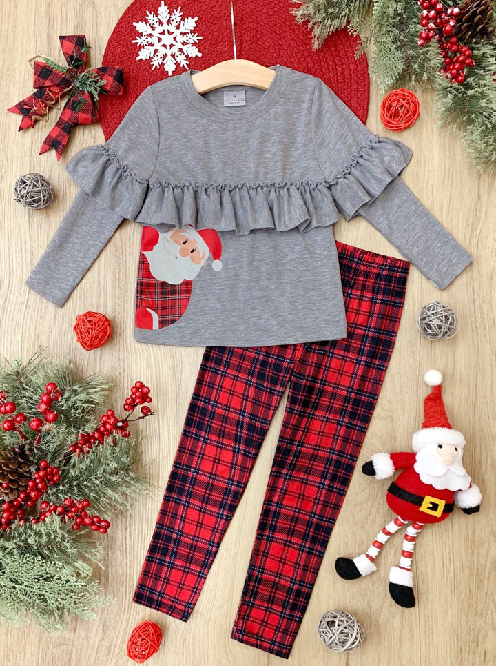 Girls Winter Casual Set | Cute Peekaboo Santa Top & Plaid Legging Set
