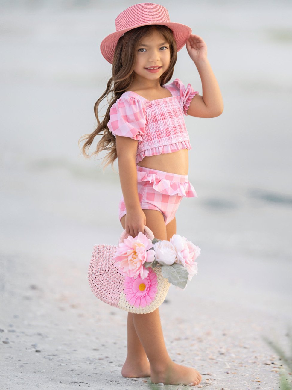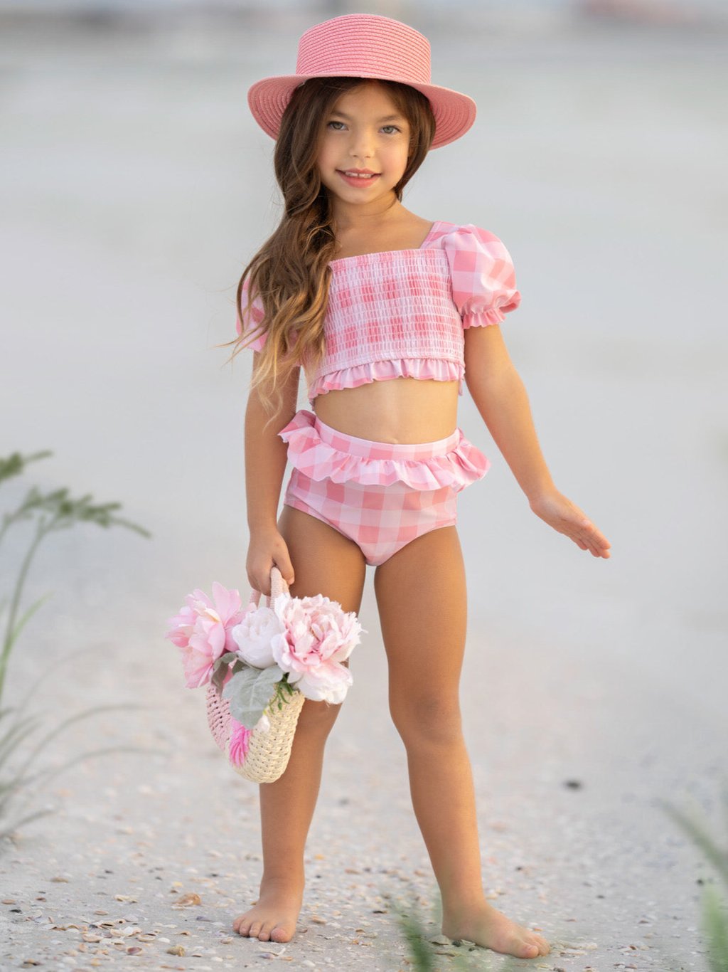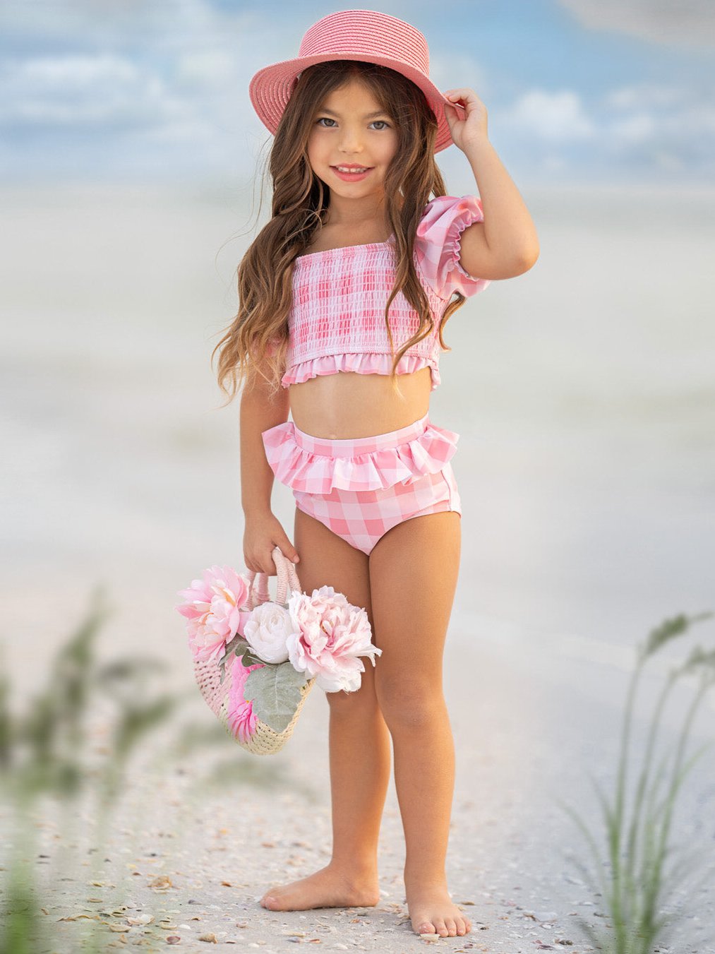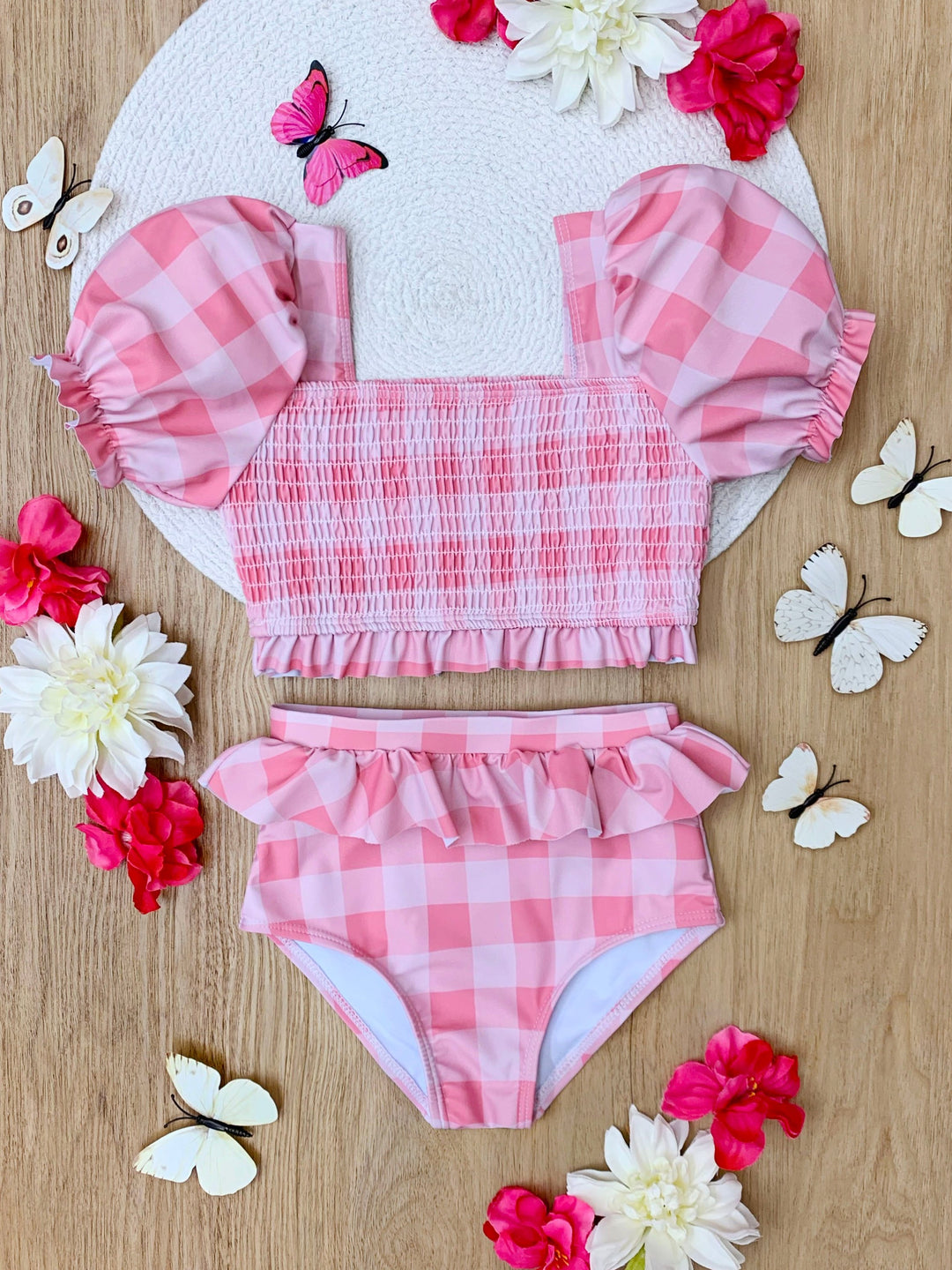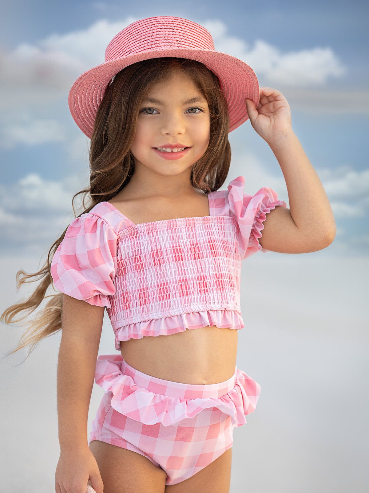 • Add a touch of vintage charm to her swim style with the Pink Gingham Smocked Puff Sleeve Two-Piece Swimsuit.