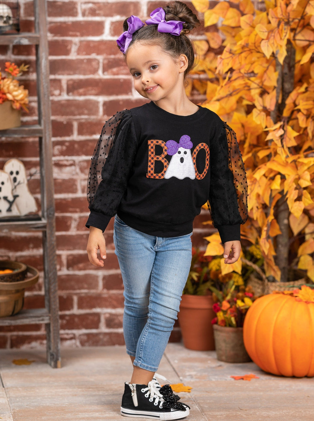 Show them your girl is the ghostest with the mostest this fall with this fun pullover sweater with cute graphics and tulle puff sleeves! It's so cute, it's scary!