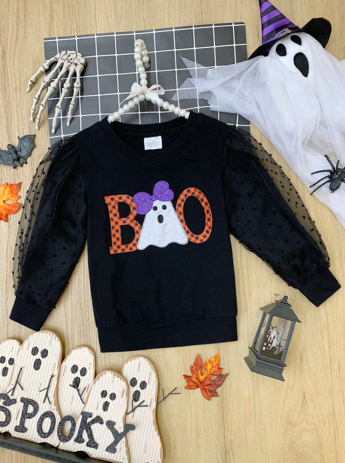 Long-sleeve pullover sweater with dotted tulle sleeve side trim and "Boo" ghost
