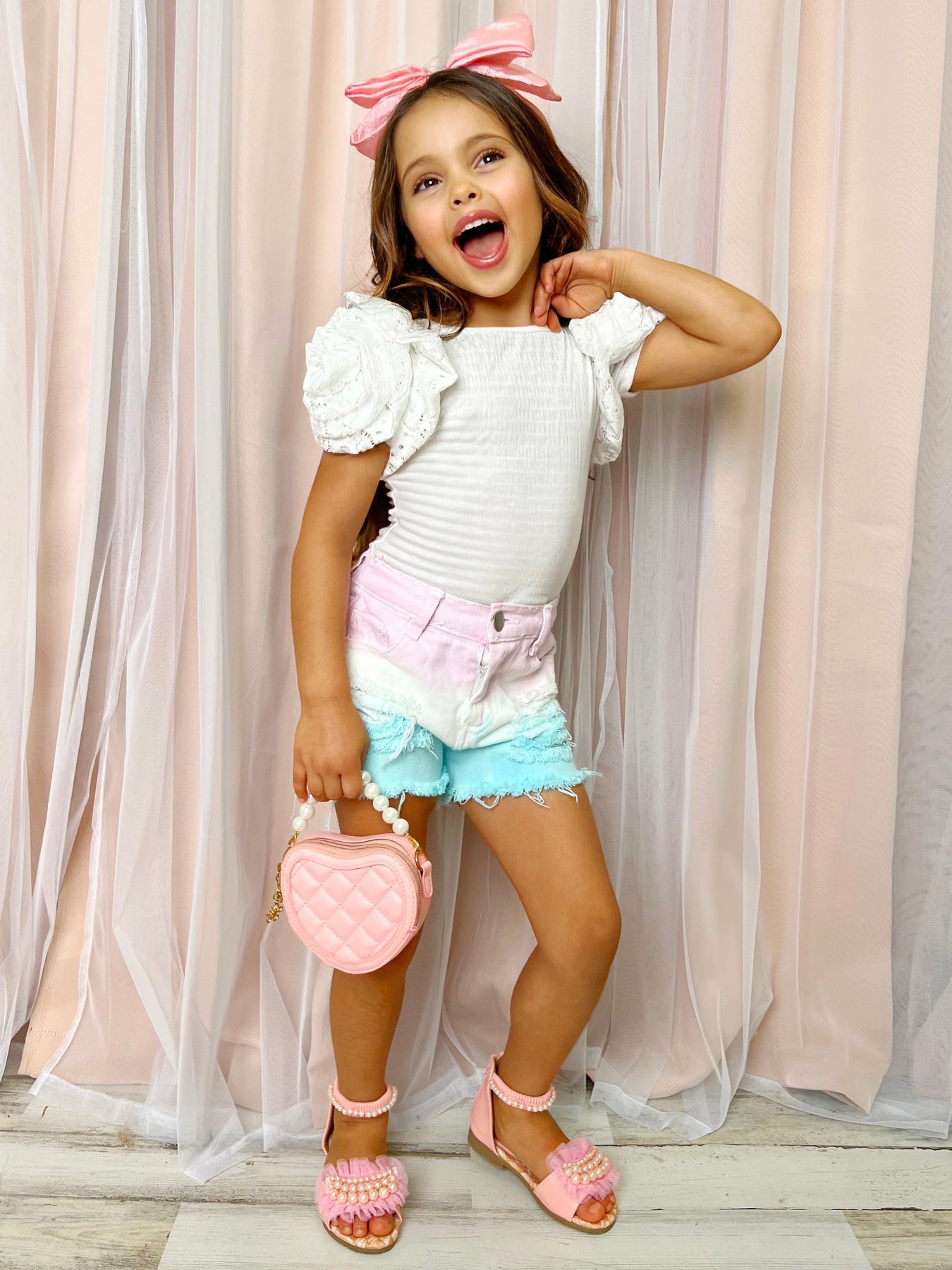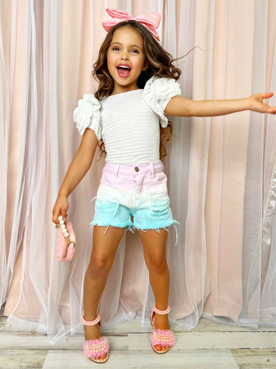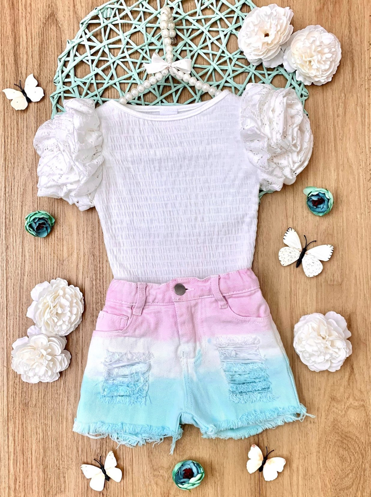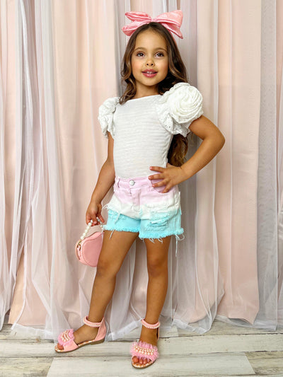• Set includes white top with rosette sleeves and multicolor pastel shorts