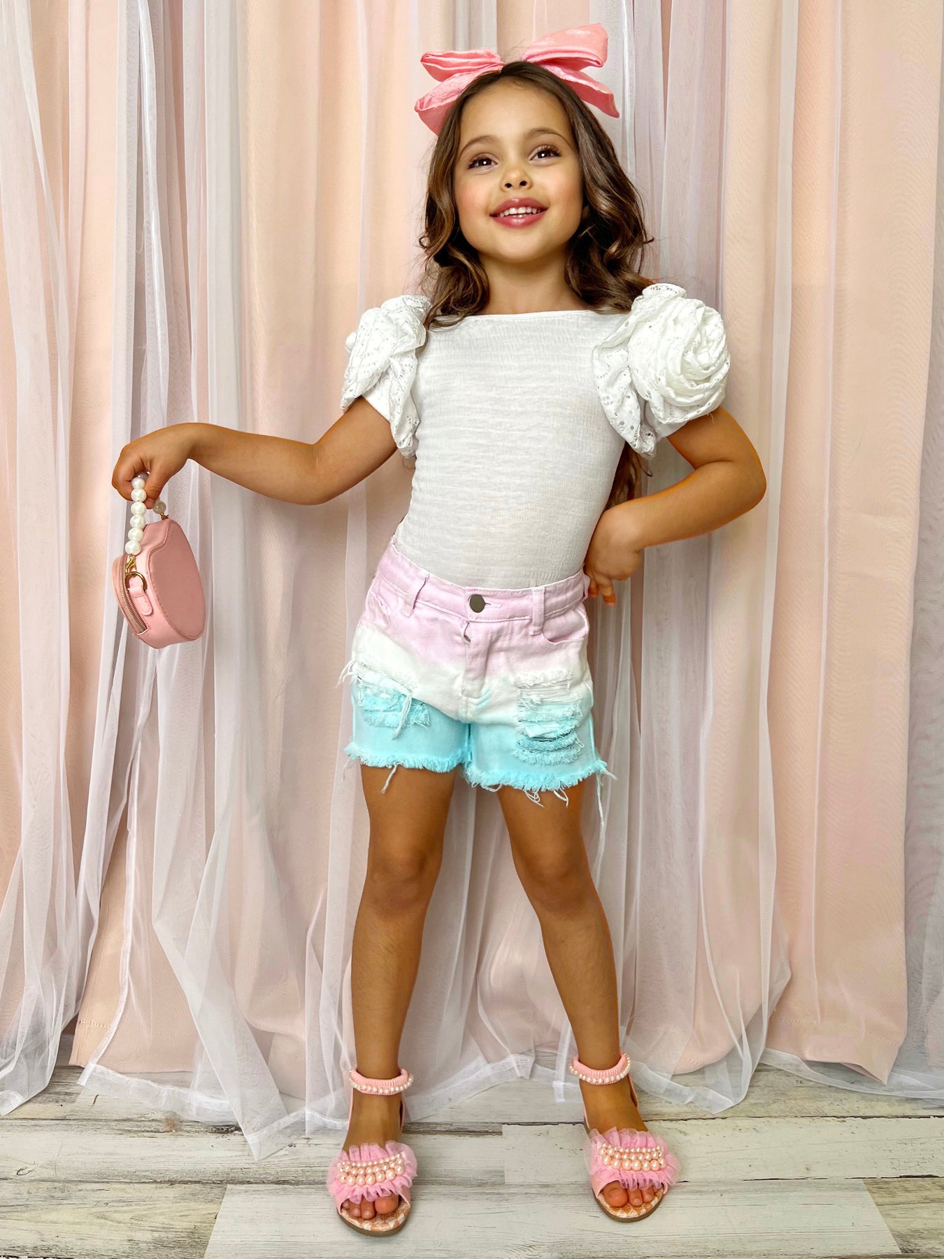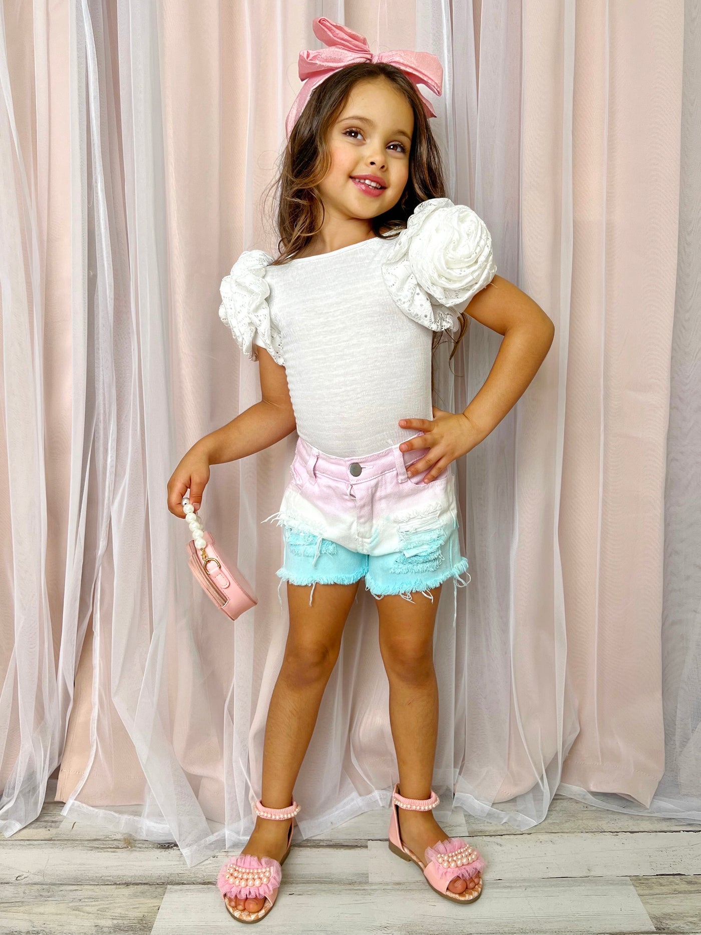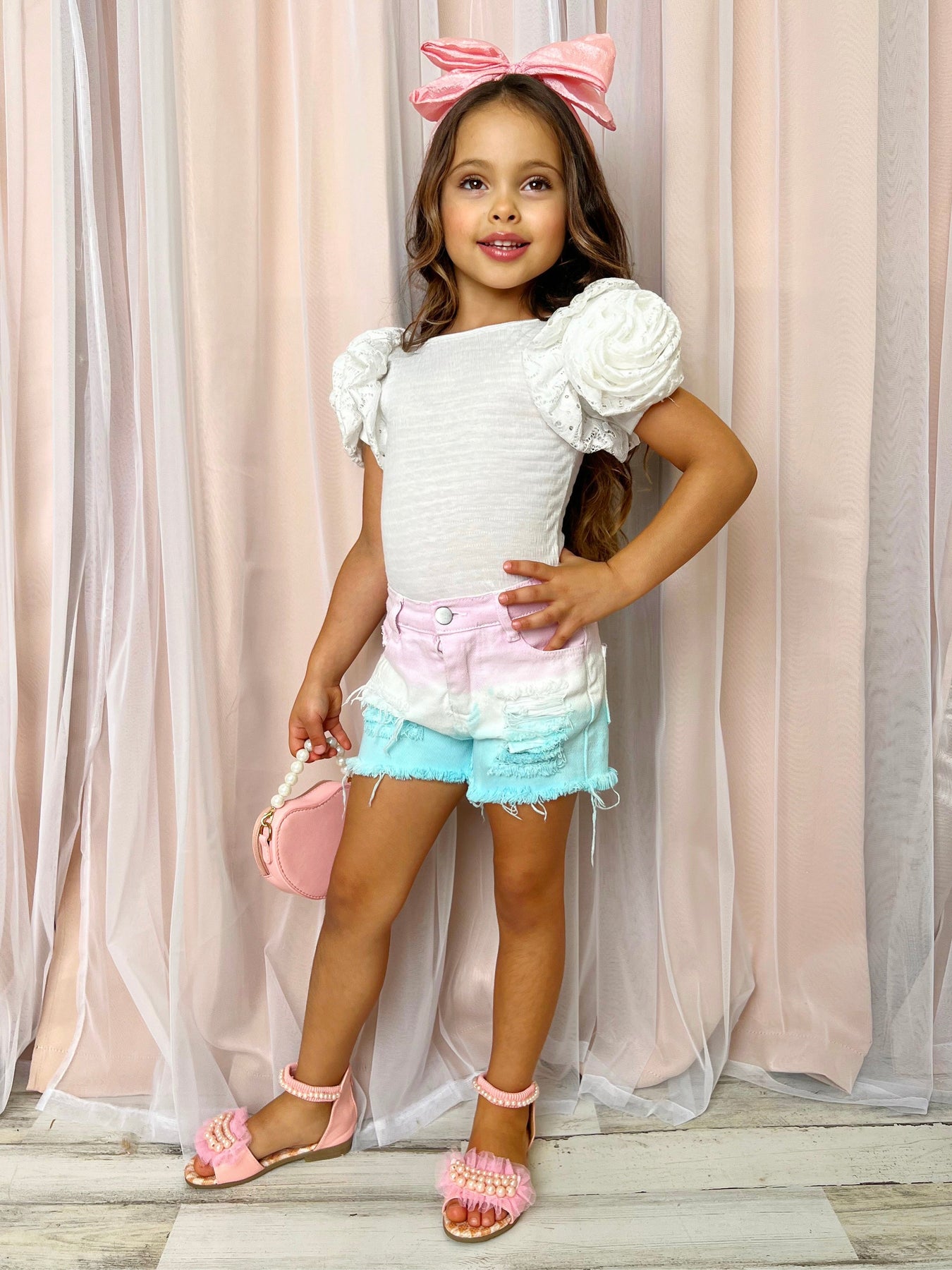 • Make way for the most special bloom of all! Your little girl will be so lovely in this rosette top and shorts set. Designed for mini fashionistas, this chic pairing is cute and casual splashed with a little bit of dramatic detail. Don't you just love those statement rose sleeves?!