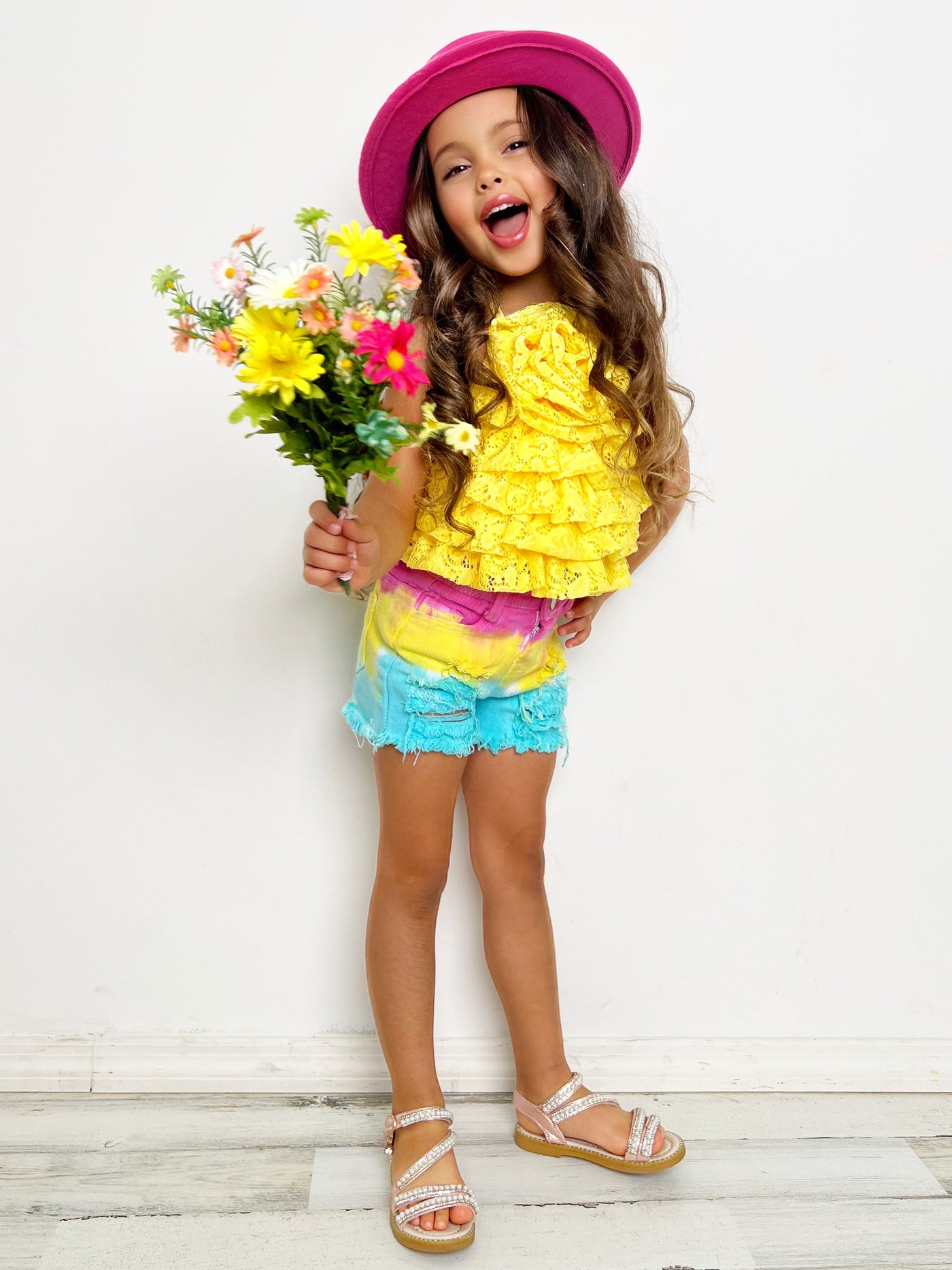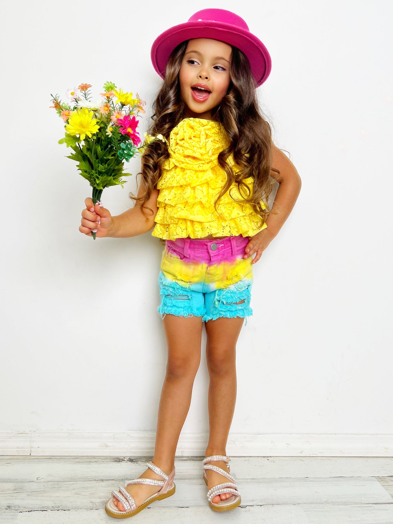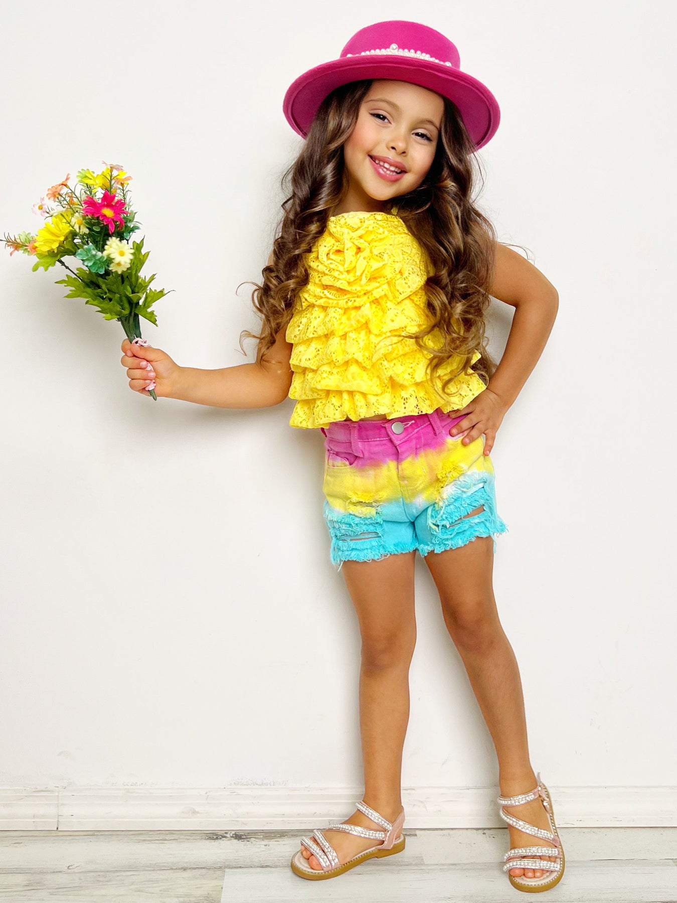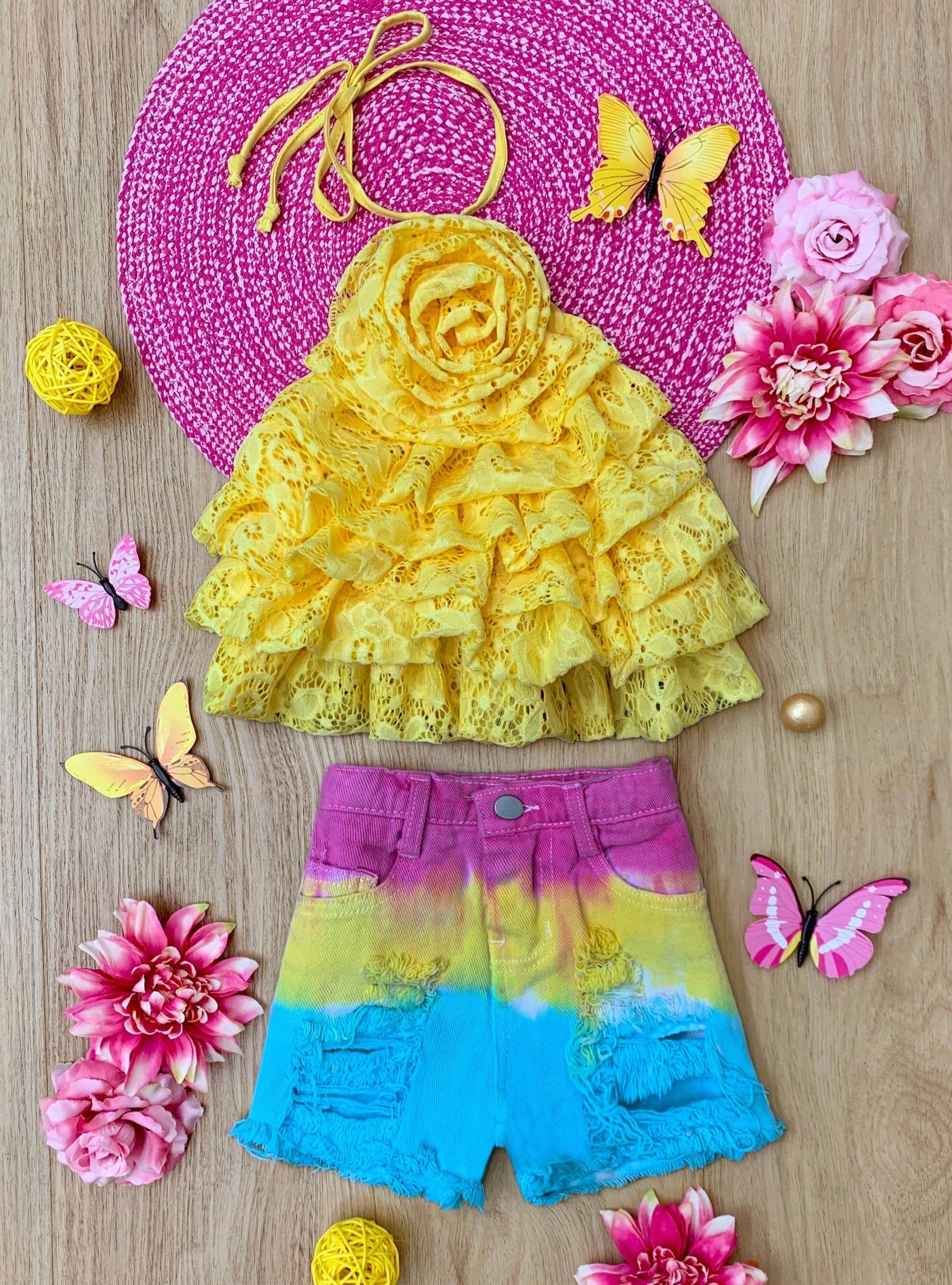 - What better way for your little girl to welcome spring than with a tiered top and shorts set that's all about color and blooms! This season-ready pairing features a stunning yellow, tiered lace halter top with a rose accent and multicolor denim. She'll blossom like the most beautiful flower in this stylish outfit!