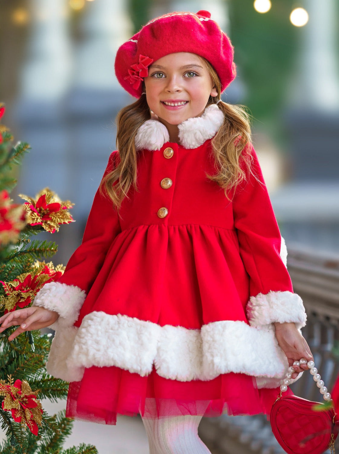 - She'll be all bundled up in style in our gorgeous red faux fur duchess coat! Layer your little lady with our sophisticated faux fur trimming, back bump, and delicate ruffles. With a Christmas classic red, she'll look her best this holiday season.