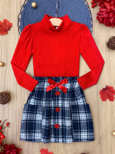 - Your little girl will fall in love with fashion in our red turtleneck top and plaid skirt set. Featuring a chic mix of color and pattern, this fabulous pairing will make dressing up so much more fun!