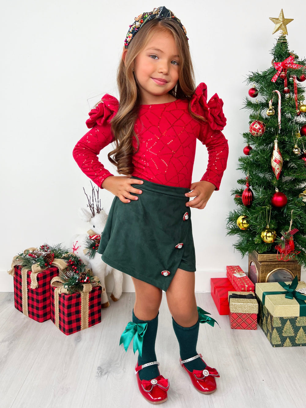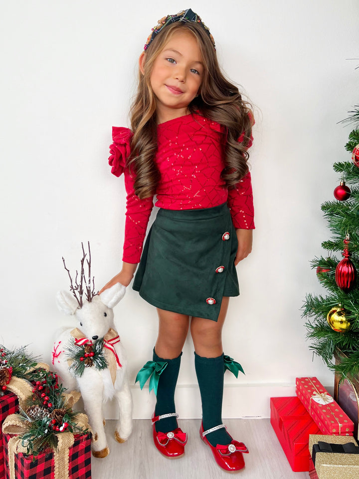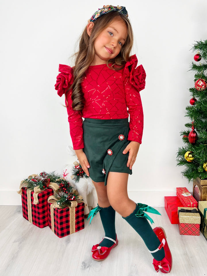 Red sequin top with rosette sleeve details and faux suede skort