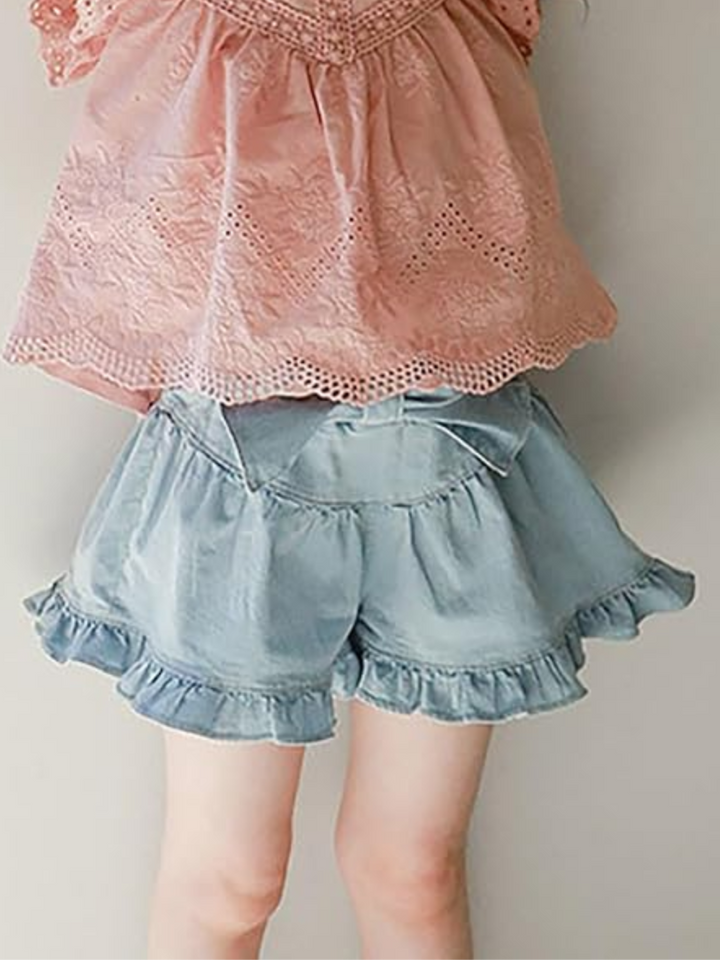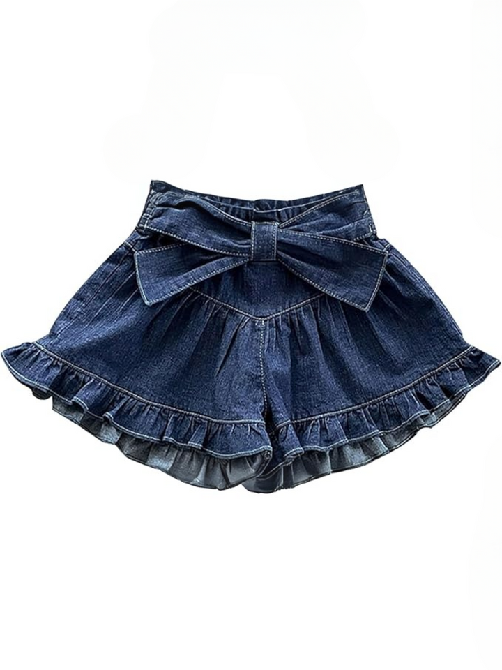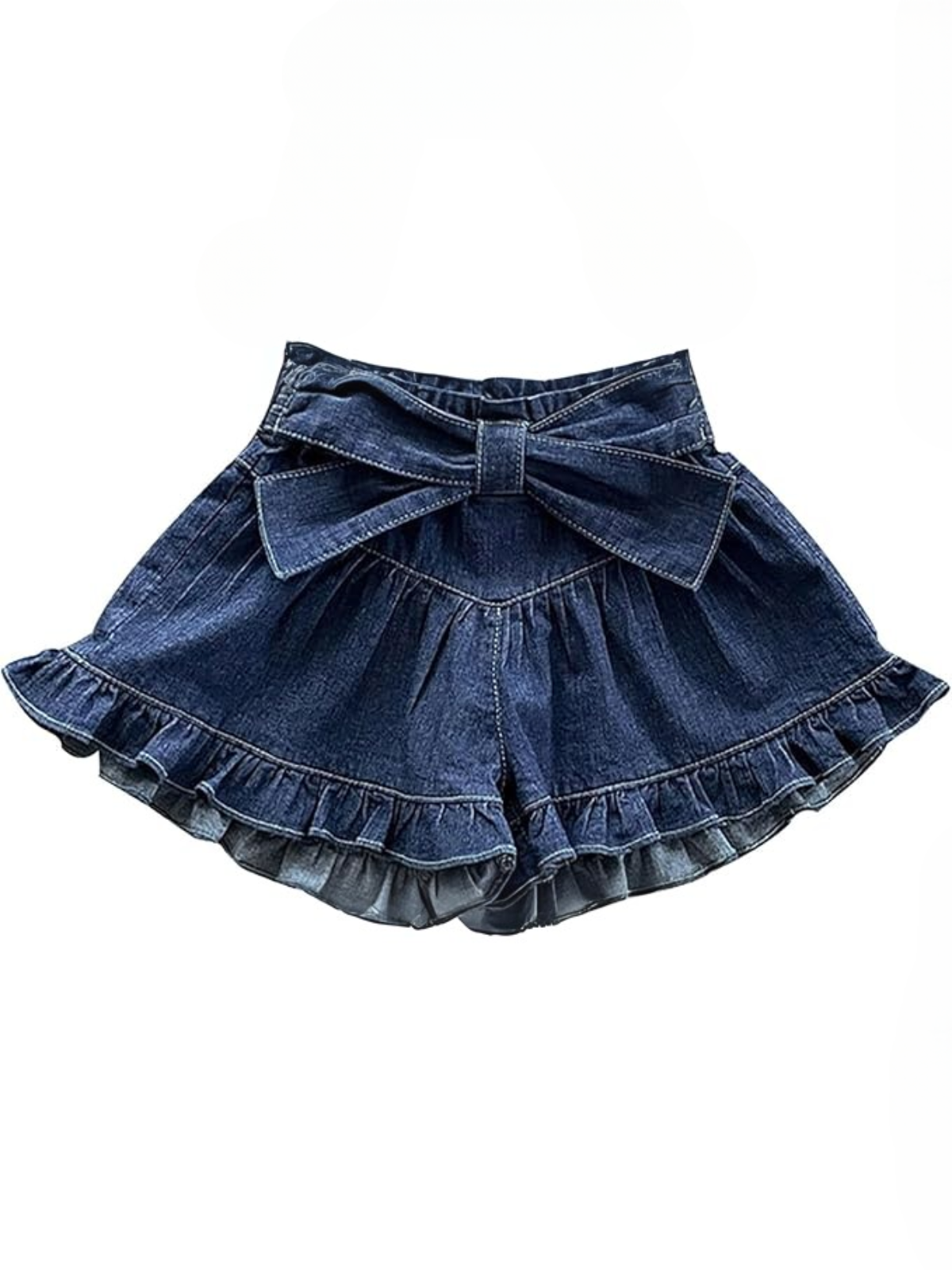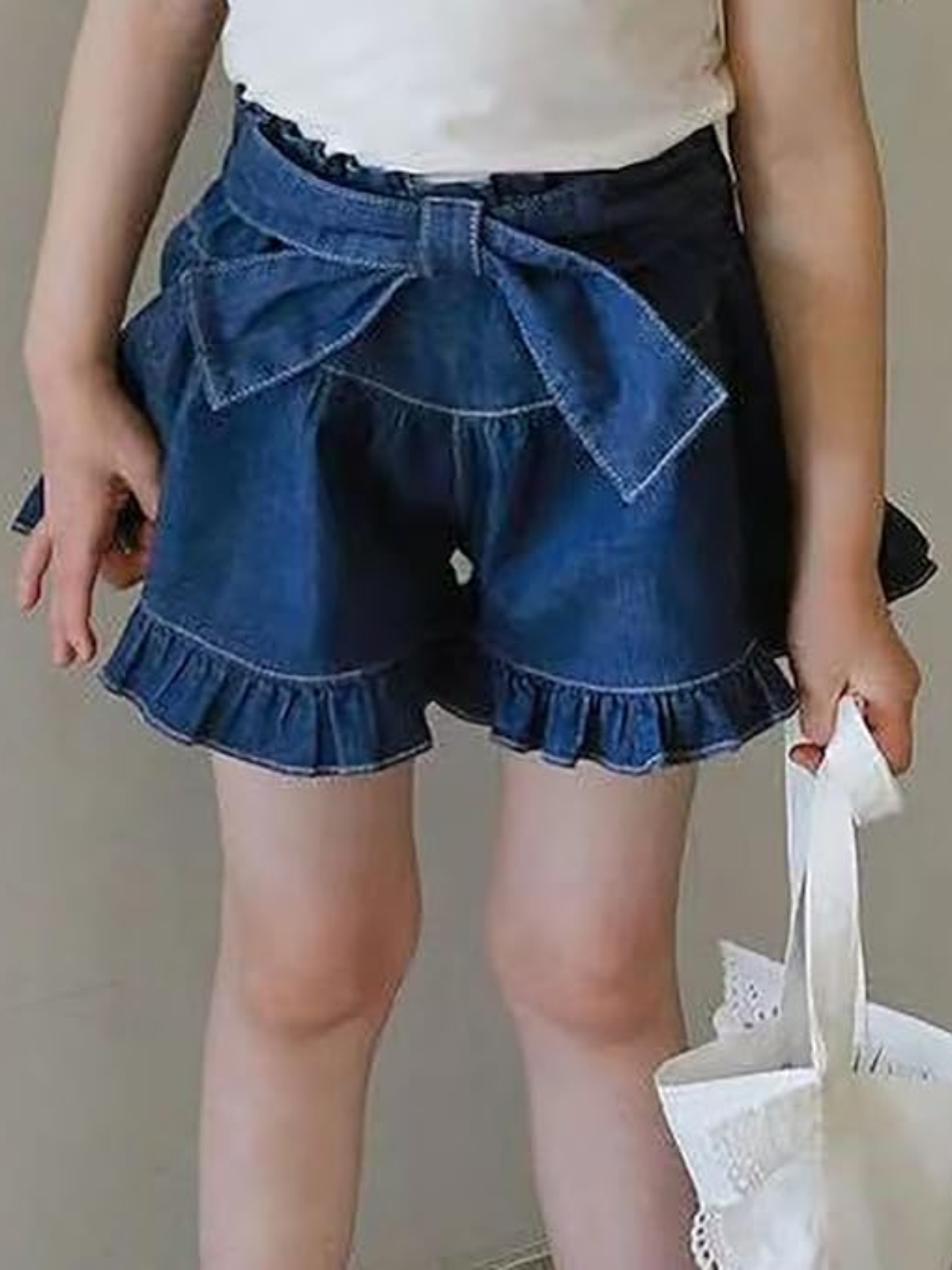 These adorable ruffle hem denim shorts for toddler girls feature a sweet oversized bow and lightweight fabric for all-day comfort. Perfect for playdates, summer outings, and photo-ready moments.