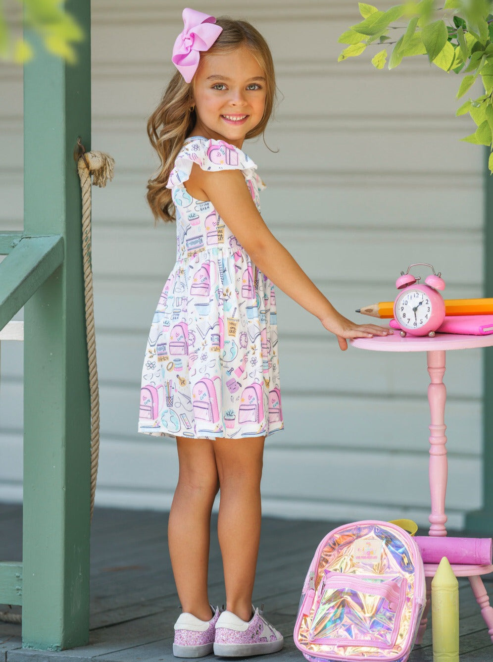 - Pencils, paper, books, and backpacks. All your little girl is missing is this cap-sleeve skater dress. Lovely white fabric covered in the cutest little school supply drawings. It's sure to make her best dressed for her first day back in school.