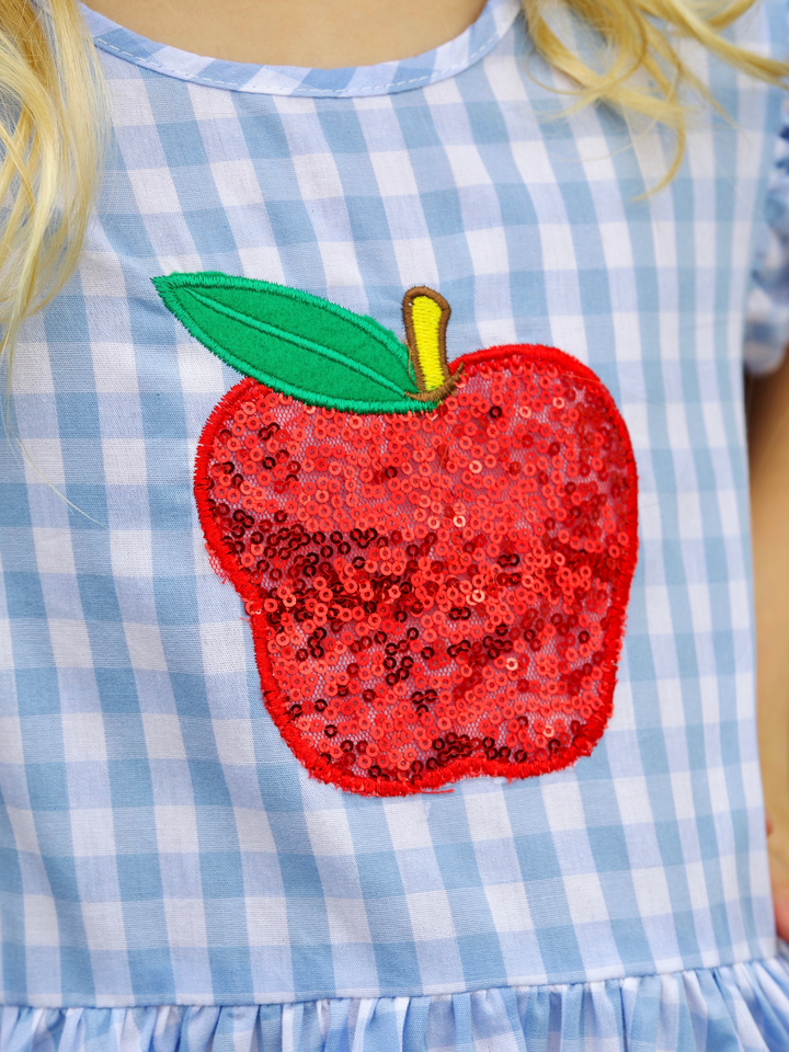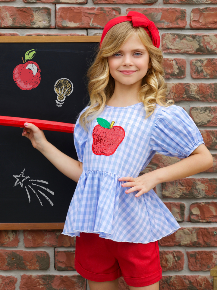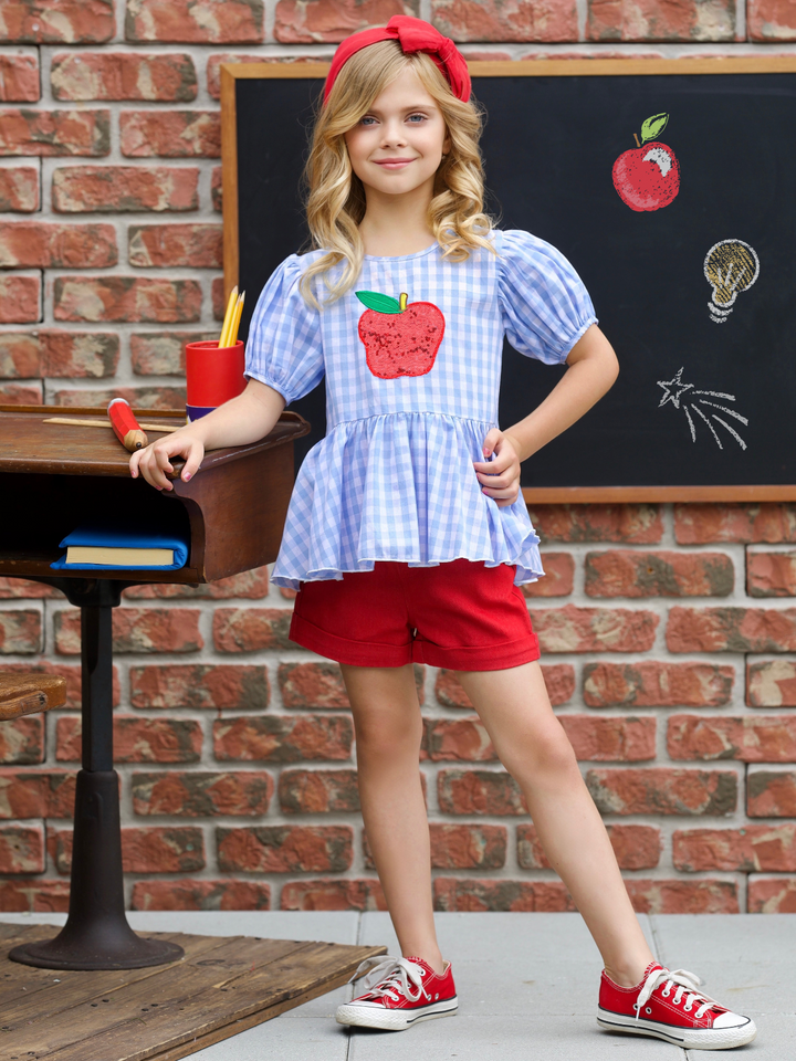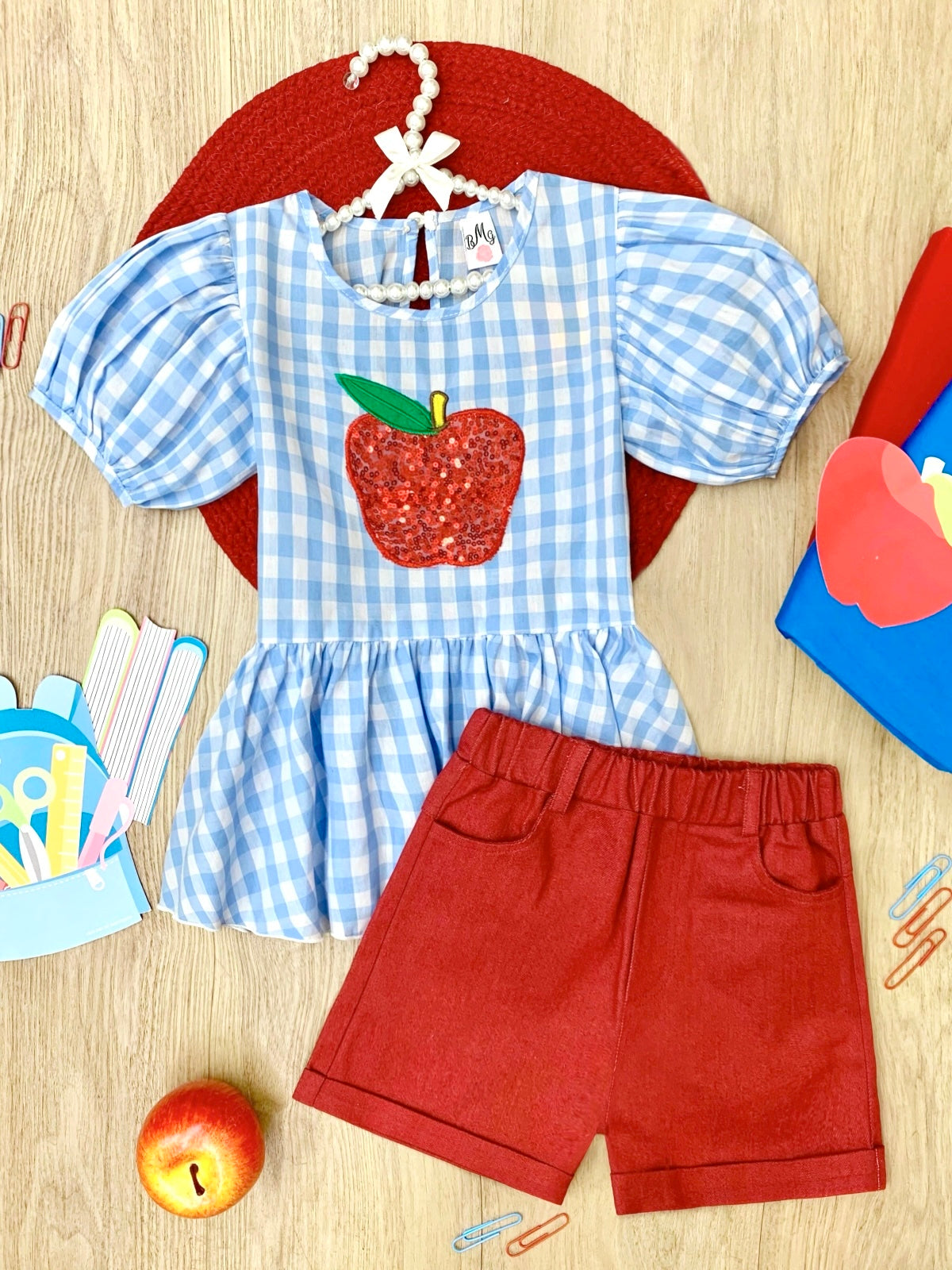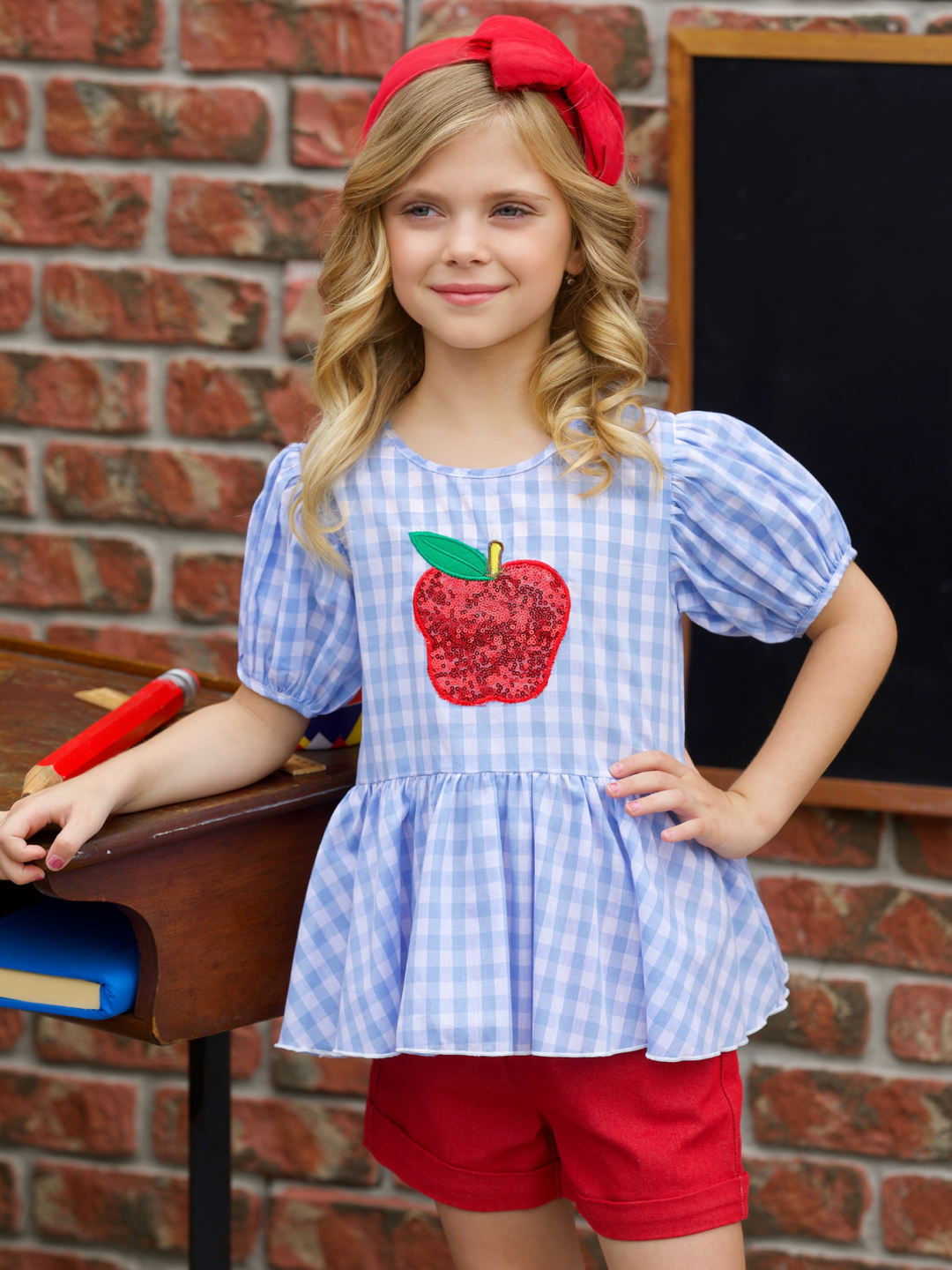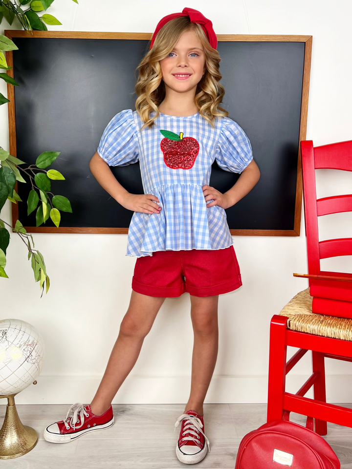 - Light blue gingham peplum top with puff sleeves and a bold red sequin apple appliqué