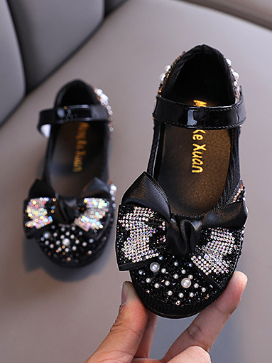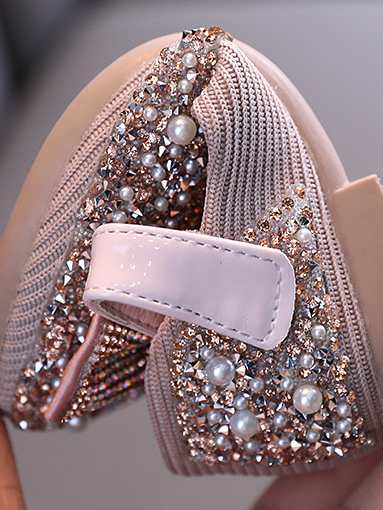 Rhinestone ballet flats that sparkle with each step. How magical her days will be with a pair that shows off her beauty! Your little girl will look and feel like a real-life princess. Finished with a sparkly bow accent for extra charm.