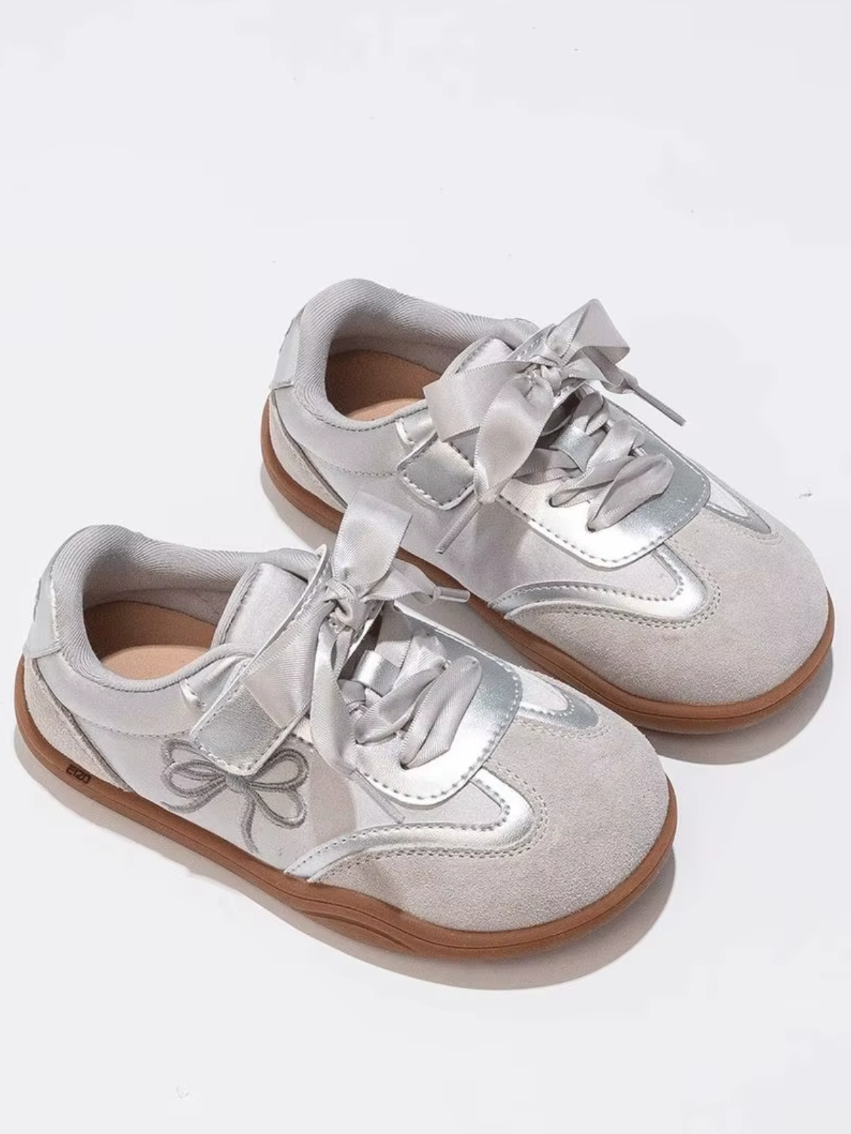 Step into sporty elegance with these shimmering silver sneakers, where comfort meets charm.
