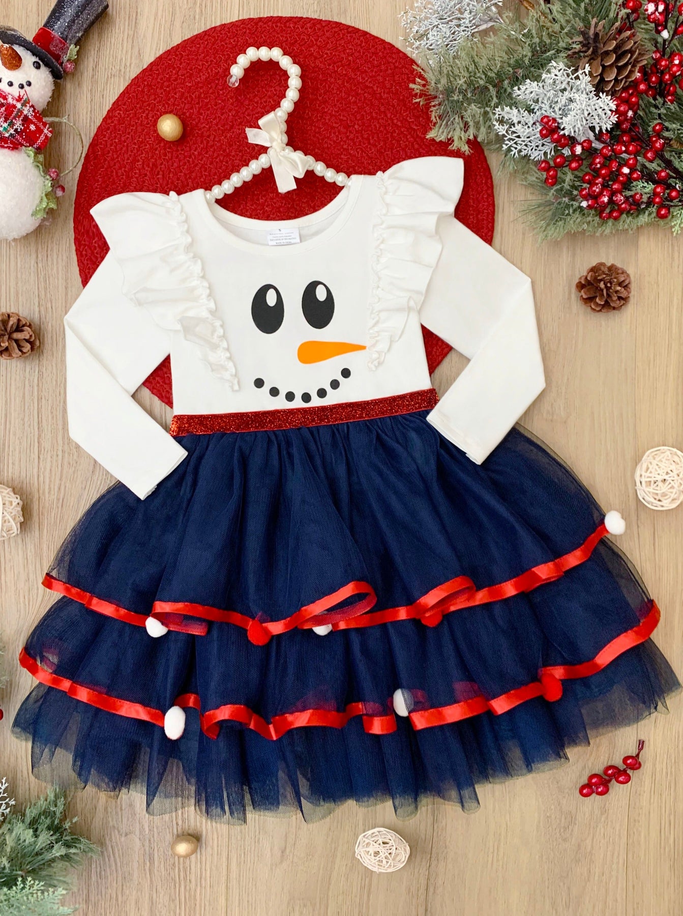Long-sleeve layered tutu dress with ruffle details, snowman print, glitter waistband, and tiered tulle skirt with pom-pom applique